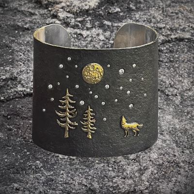 The Howling Wolf Cuff features the iconic western imagery of a lone wolf in the timbers howling at a full moon.