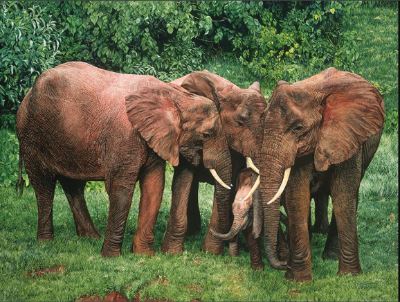 Guy's inspiration for the piece came from a visiting Kenya, and as he approached the herd, these three females immediately huddled around their young to protect them.