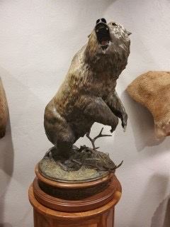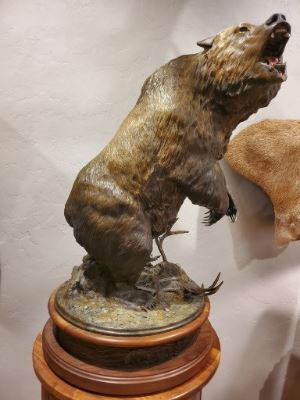 The grizzly, rendered mid-roar with lifelike texture and motion, conveys both the ferocity and majesty that define the wilderness itself.