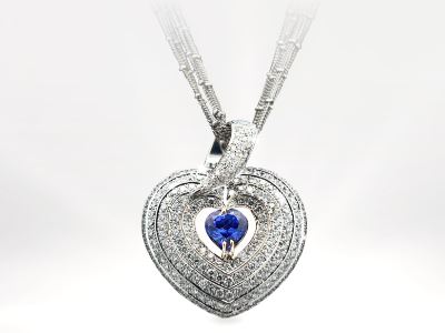 Gunderson’s Jewelers has generously donated this one-of-a-kind, handcrafted 18k white gold pendant featuring a heart and bale encrusted with 1.78 carats total weight of brilliant diamonds, surrounding a vivid tanzanite center.