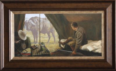 The scene depicts a hunter cornered in his tent by a formidable Cape buffalo, rendered with Seerey-Lester’s masterful balance of atmosphere, tension, and storytelling.
