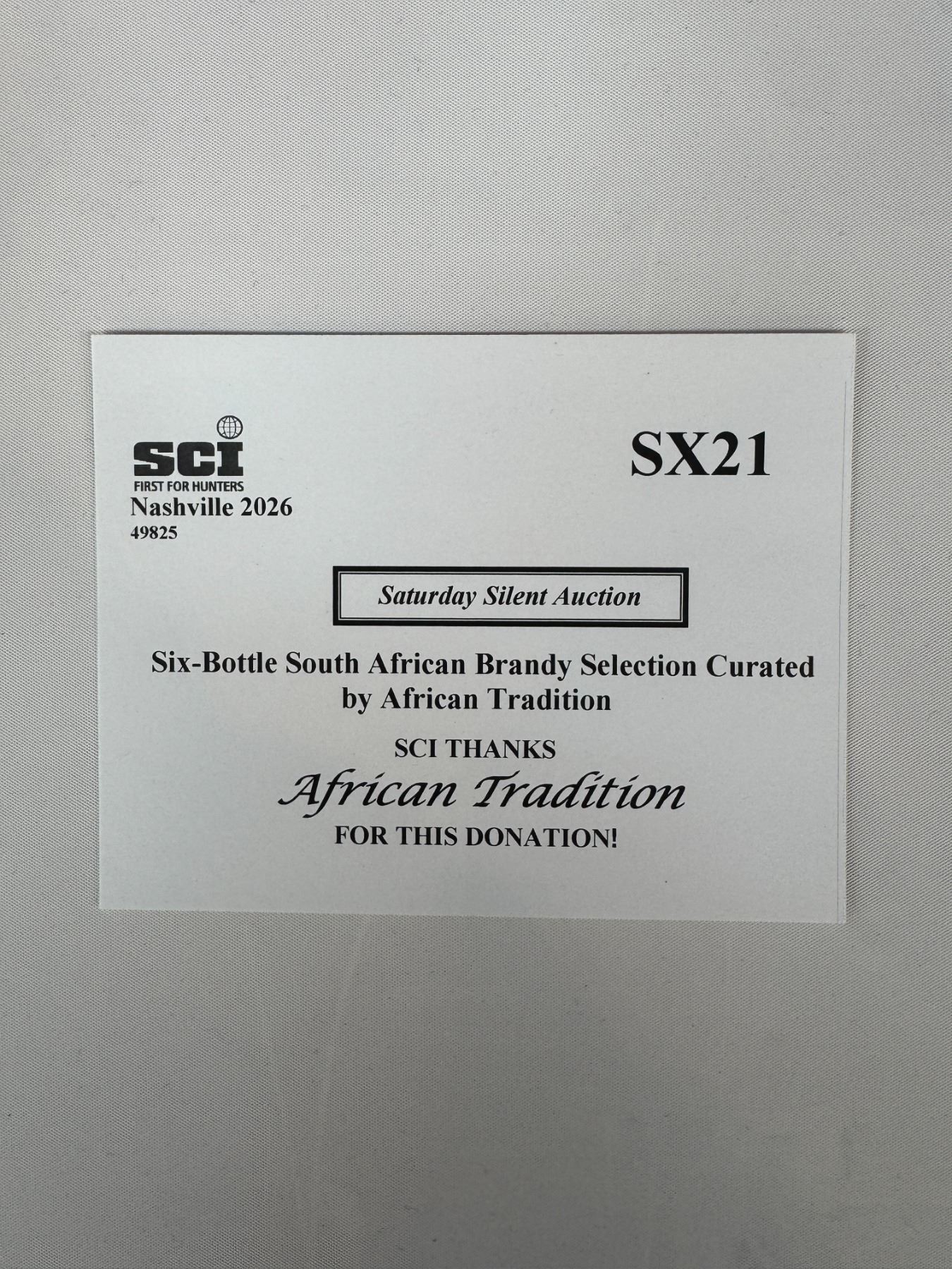 With appreciation to African Tradition, this donation offers a six-bottle assortment of premium South African brandies, personally selected by the winning bidder.