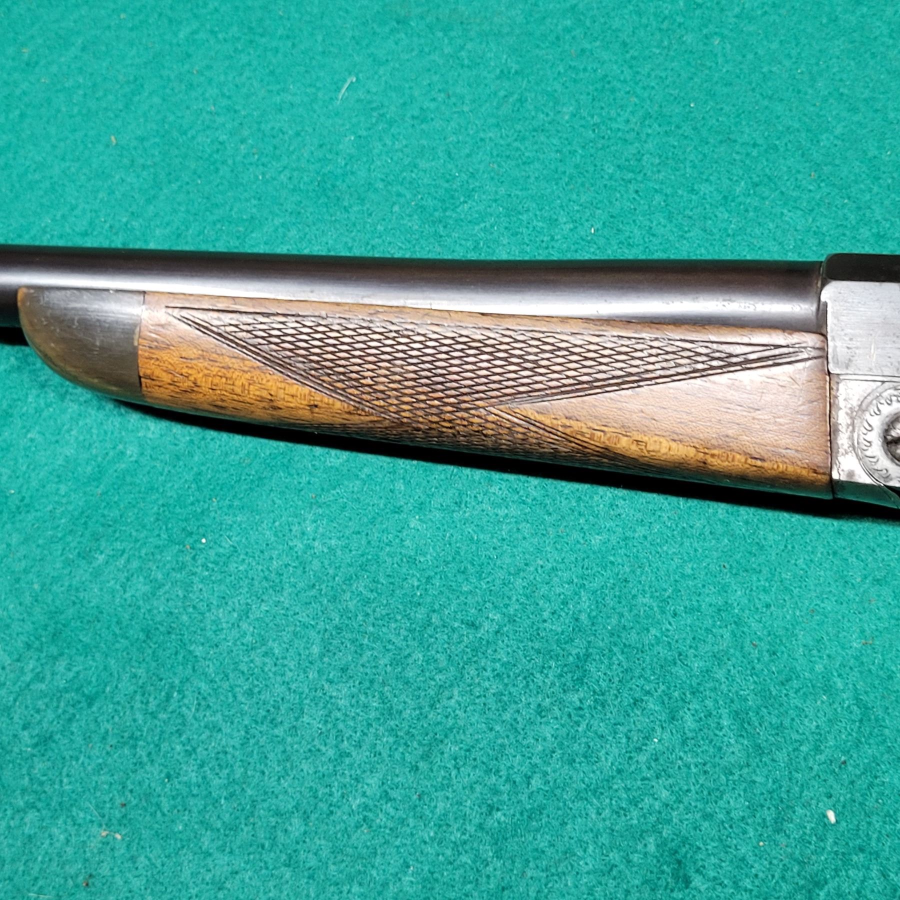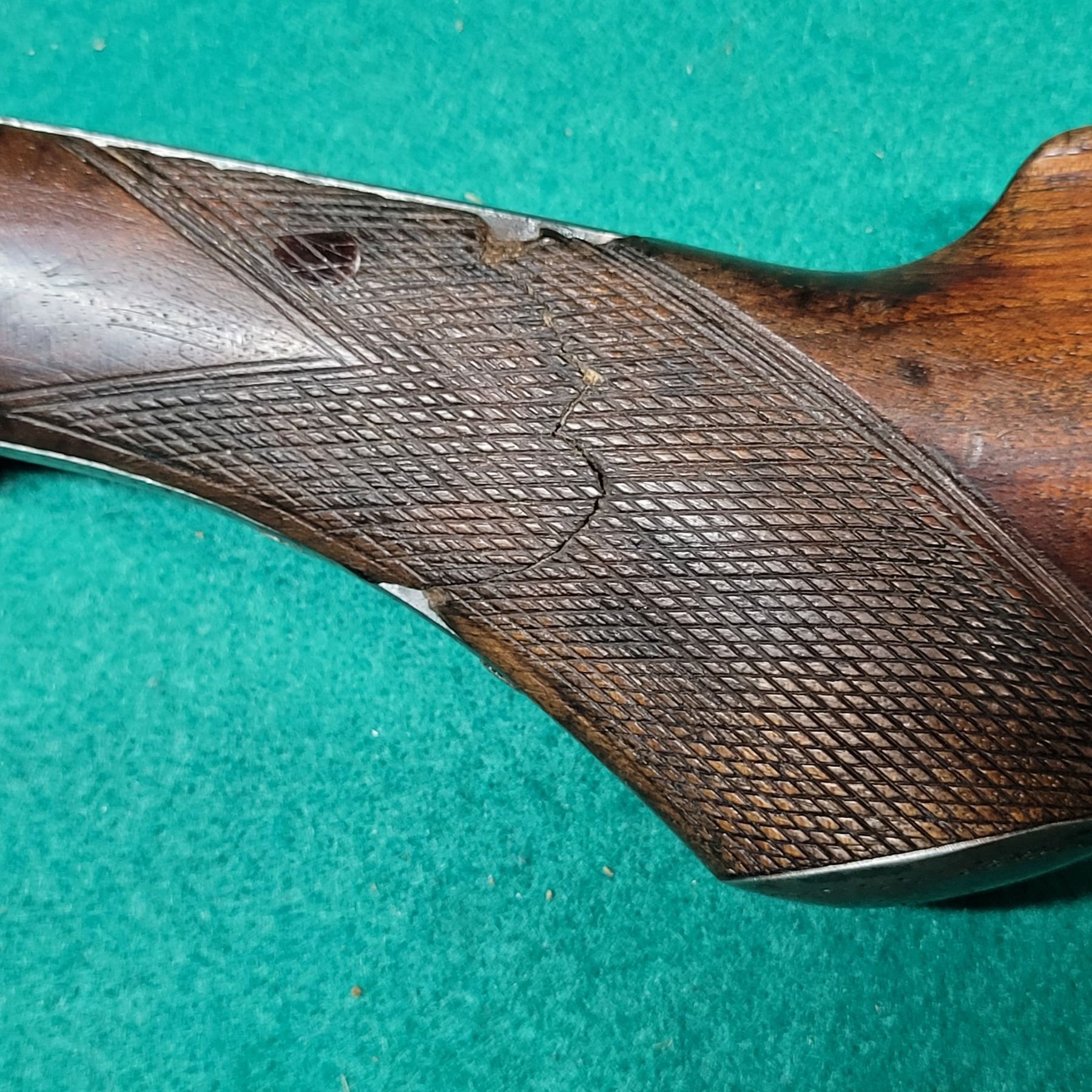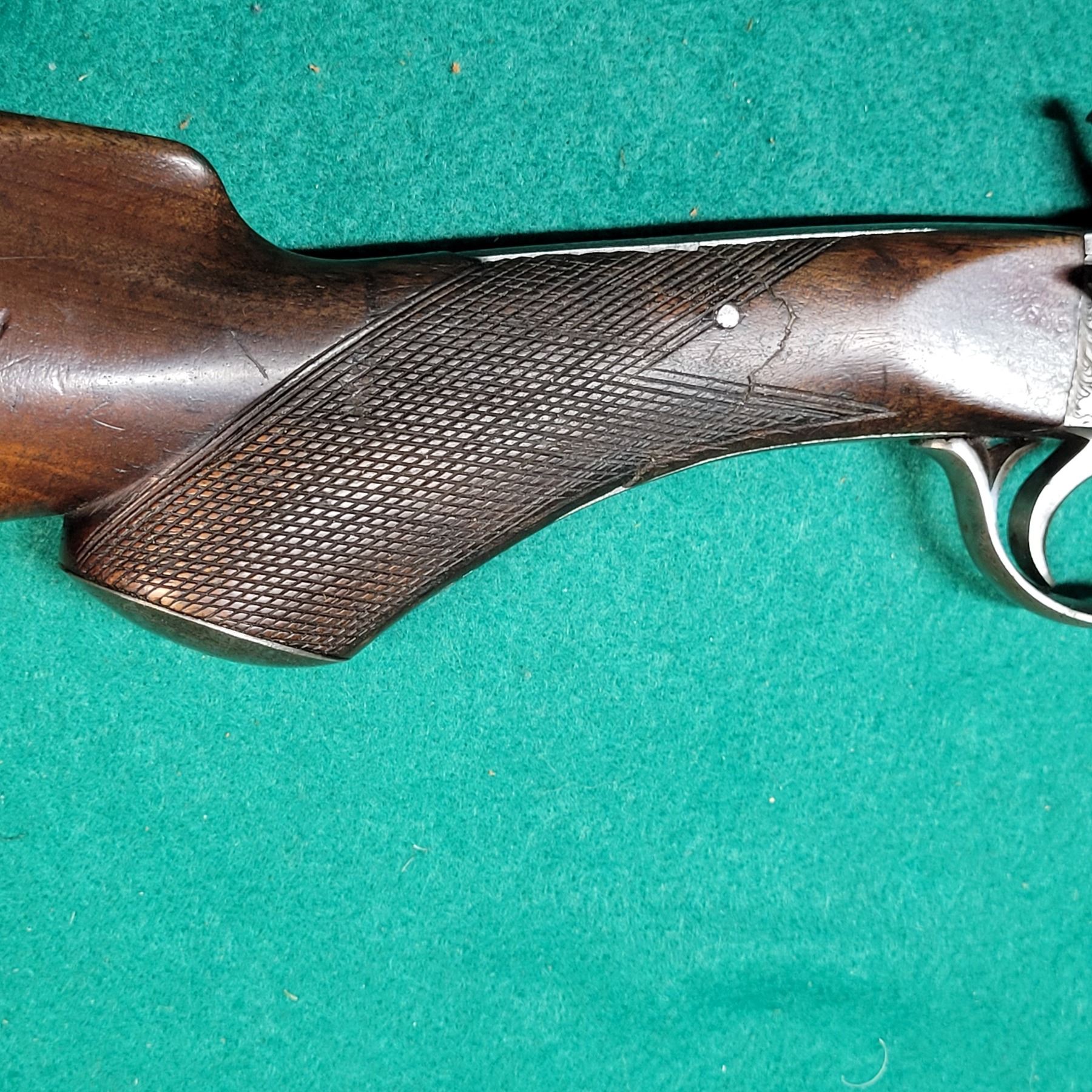 The walnut checkered stock has a repaired break at the wrist. See Photos.