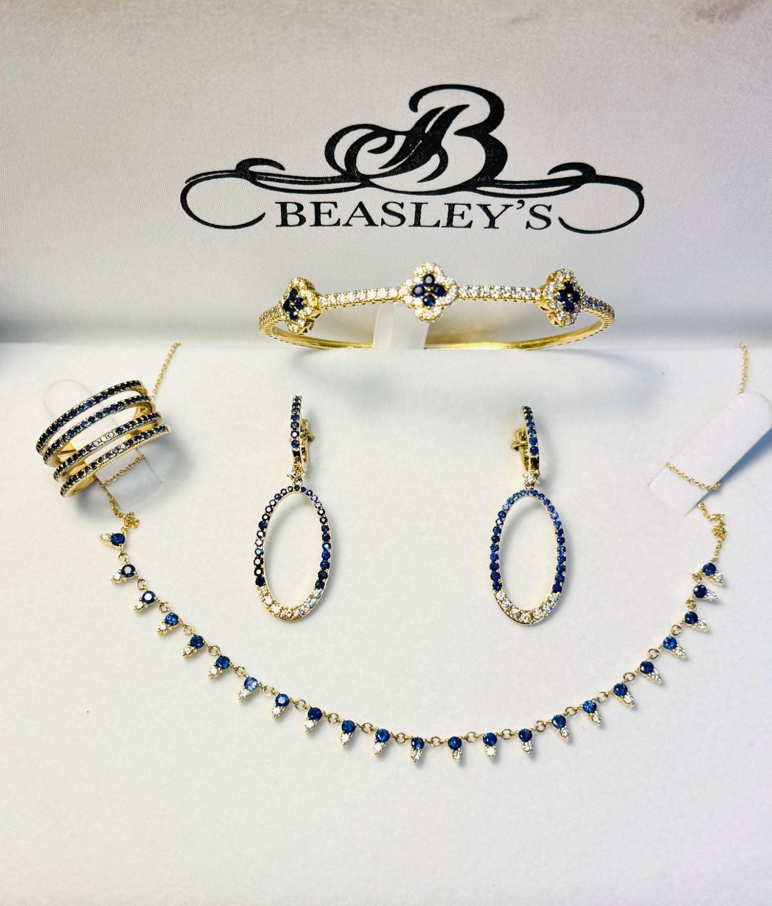 This stunning necklace is set with .65ct total weight of round brilliant cut natural diamonds, SI1, color H and 2.25ct total weight of blue sapphires, round cut, medium blue in color, AA quality, all set in 14k yellow gold mounting and chain. Bracelet is set with 1.65ct total weight of round brilliant cut natural diamonds, SI1, color H and .85ct total weight of round blue sapphires, AA quality, fine color, all set in 18k yellow gold custom bangle bracelet with safety. Earrings are set with 1.65ct total weight of round brilliant cut natural diamonds, SI1, color H and .40ct total weight of round blue sapphires, AA quality, fine color, all set in 14k yellow gold mounting. The multi-strand ring is set with 1.25ct total weight of blue sapphires, AAA quality, fine color, set in 14k yellow gold mounting. DALLAS SAFARI CLUB THANKS BEASLEY'S FINE JEWELRY FOR THIS 100% DONATION. Lisa Dubberley, 972-221-4641, beasleysjewelry@yahoo.com, WWW.BeasleysFineJewelry.Com. Valued at $26,250.