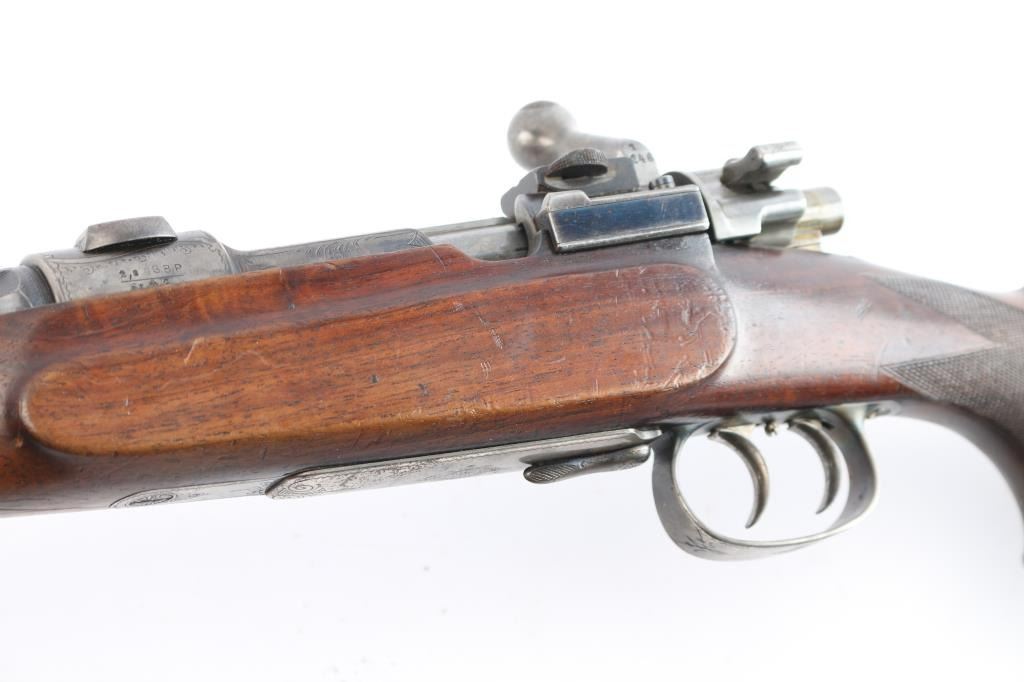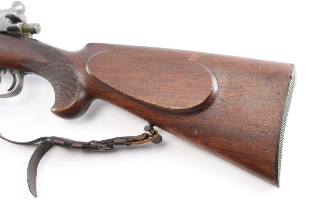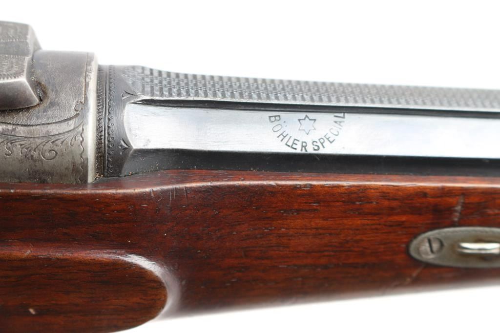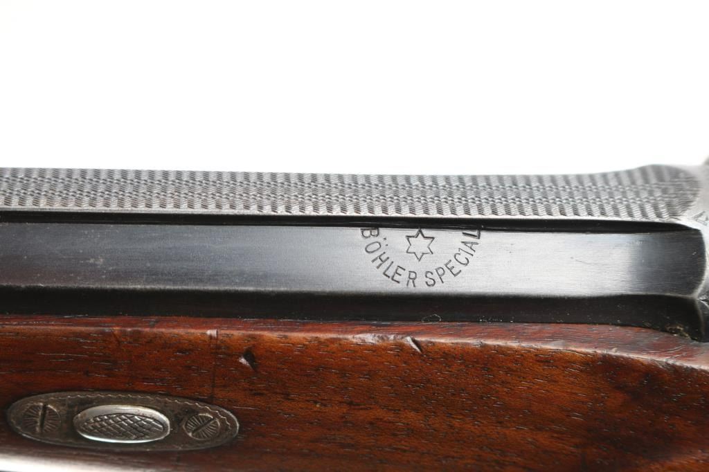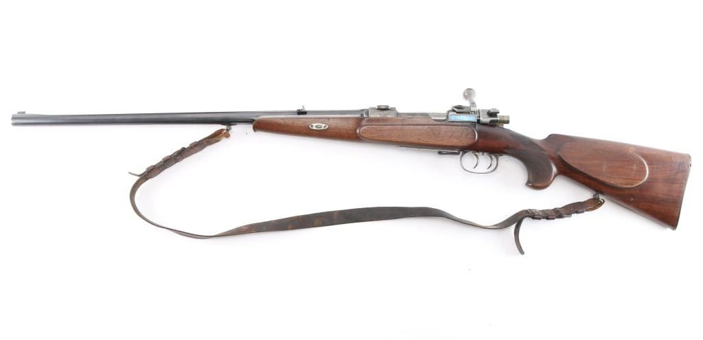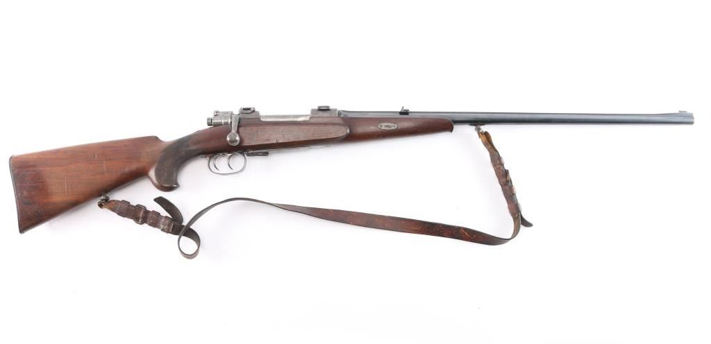 High-quality, custom-built, pre-war sporting rifle by German gunmaker Heinrich Scherping,based on a Mauser 98 action. Scherping started his business in Hannover in 1857 and quickly became the gunmaker for the royal court. The business was continued by his descendants and their partners until the late 1930's. The bolt and small parts being numbered 1246 or a partial version of that, bolt handle bears a "crown/N" proof. The receiver is lightly engraved and bears " 2,89 G.B.P." over "St.m.G" on the left side. (This translates to 2.89 grams of Gewehr Blättchen Pulver, rifle flake powder, St. m, G: This stands for Stahlmantel Geschoss (steel-jacketed bullet)The floor plate and trigger guard are also lightly engraved. The 23" round/octagonal barrel has a lightly engraved border where it meets the receiver and is marked "BOHLER SPECIAL" on both sides. The barrel is also marked "HEINRICH SCHERPING HANNOVER". Double set adjustable triggers, floorplate release latch, barrel rib has a blade/bead front and a two leaf flip rear sights, European style scope bases, knurled bolt knob. It is mounted in a fancy walnut pistol grip stock with a small schnabel forend with contrasting ebony tip, raised oval foregrip areas, fine multi-point checkering on the pistol grip area, a shadow line cheek rest, and a knurled horn buttplate. the bore is very good, strong rifling, action is smooth, receiver and triggerguard are mostly in the white from handling, traces of case color, bolt release still has fire blur color, barrel blue is about 945 with minor muzzle wear, minor scratches/rubs and the wood is overall very good/sound with many small scratches/dings. It includes period leather sling in fair condition with scuffs,tear.