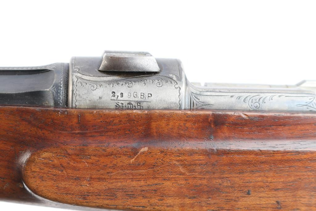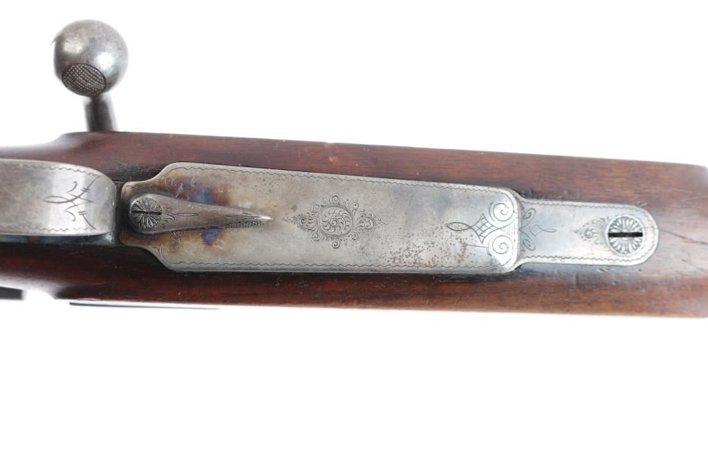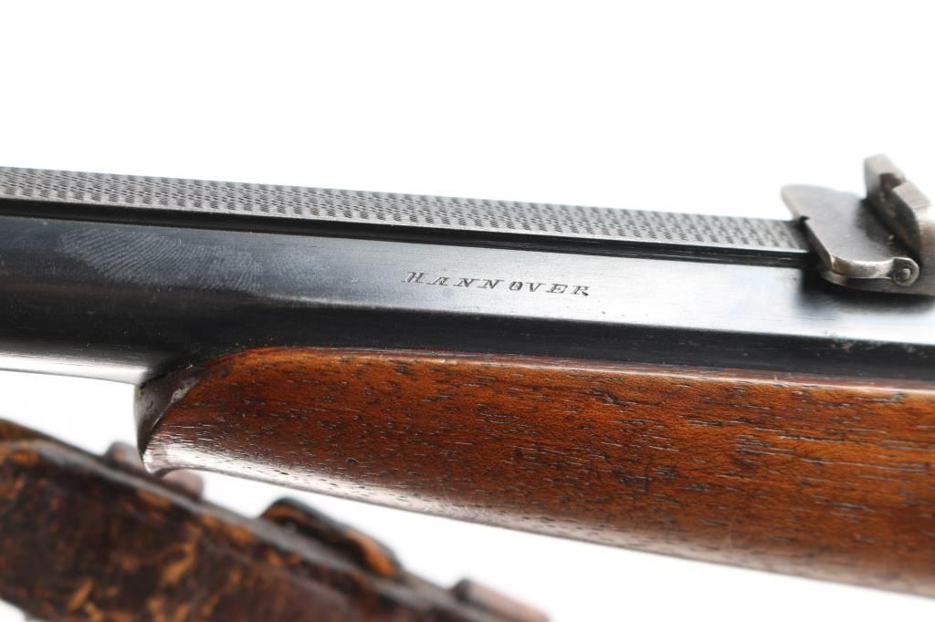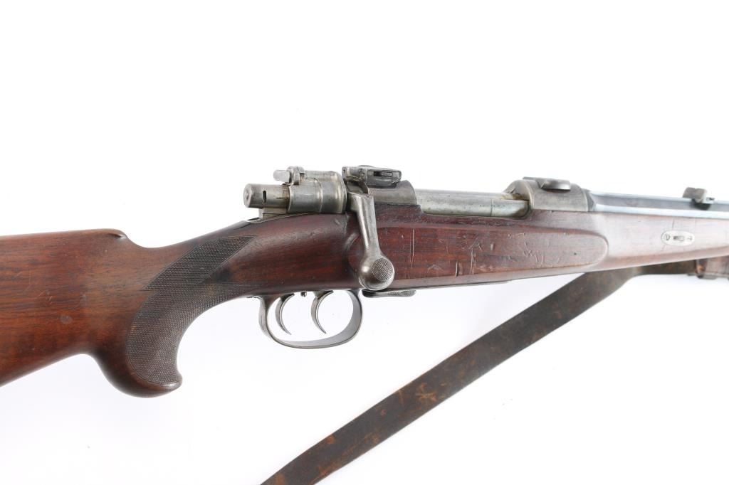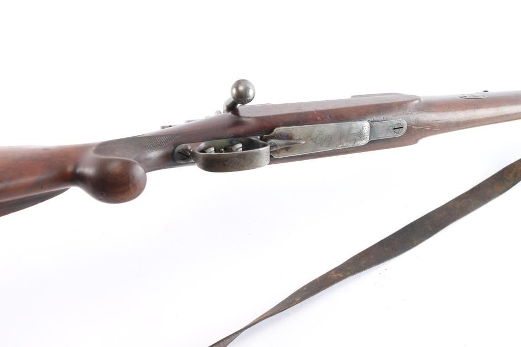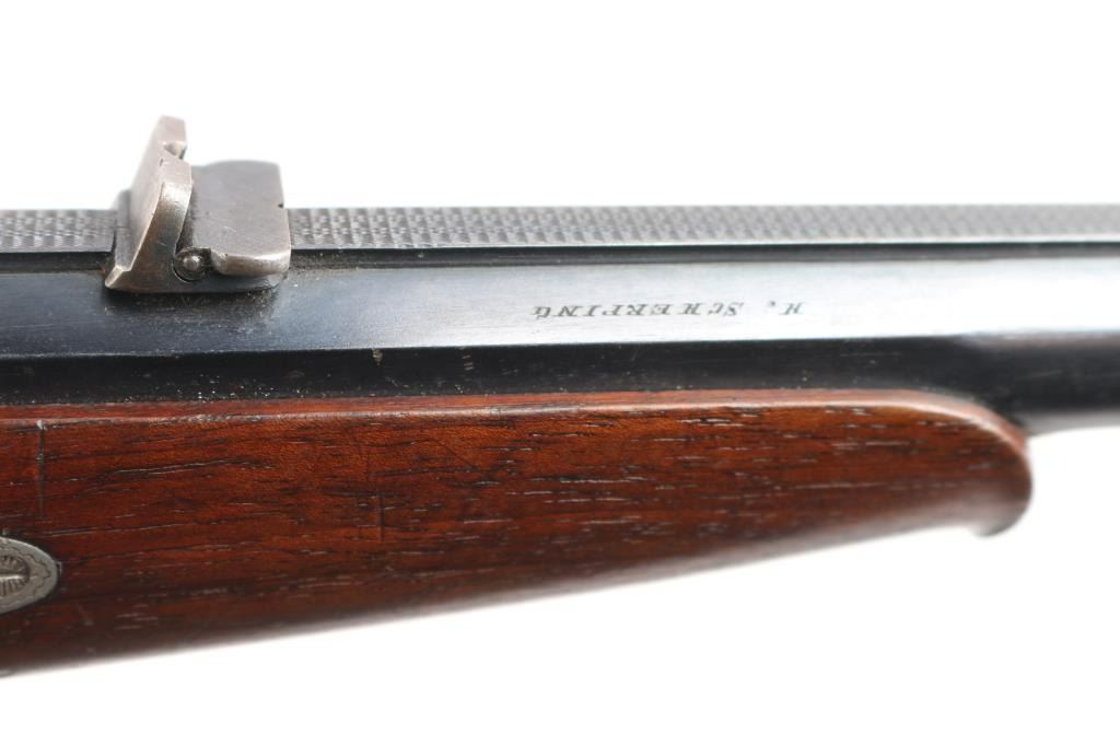 High-quality, custom-built, pre-war sporting rifle by German gunmaker Heinrich Scherping,based on a Mauser 98 action. Scherping started his business in Hannover in 1857 and quickly became the gunmaker for the royal court. The business was continued by his descendants and their partners until the late 1930's. The bolt and small parts being numbered 1246 or a partial version of that, bolt handle bears a "crown/N" proof. The receiver is lightly engraved and bears " 2,89 G.B.P." over "St.m.G" on the left side. (This translates to 2.89 grams of Gewehr Blättchen Pulver, rifle flake powder, St. m, G: This stands for Stahlmantel Geschoss (steel-jacketed bullet)The floor plate and trigger guard are also lightly engraved. The 23" round/octagonal barrel has a lightly engraved border where it meets the receiver and is marked "BOHLER SPECIAL" on both sides. The barrel is also marked "HEINRICH SCHERPING HANNOVER". Double set adjustable triggers, floorplate release latch, barrel rib has a blade/bead front and a two leaf flip rear sights, European style scope bases, knurled bolt knob. It is mounted in a fancy walnut pistol grip stock with a small schnabel forend with contrasting ebony tip, raised oval foregrip areas, fine multi-point checkering on the pistol grip area, a shadow line cheek rest, and a knurled horn buttplate. the bore is very good, strong rifling, action is smooth, receiver and triggerguard are mostly in the white from handling, traces of case color, bolt release still has fire blur color, barrel blue is about 945 with minor muzzle wear, minor scratches/rubs and the wood is overall very good/sound with many small scratches/dings. It includes period leather sling in fair condition with scuffs,tear.