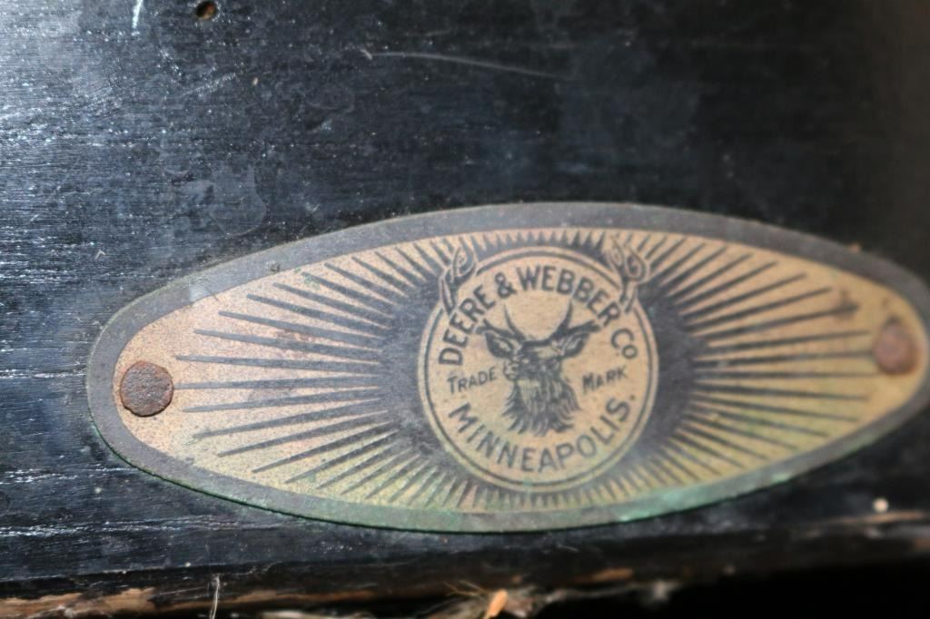 Measures 103"L x 64"W. Deere & Webber Co. made buggies between 1881 and 1921. The buggy is in great shape for its age. Minor damage to dash from mice. All black. Not shippable, buyer must arrange pickup.