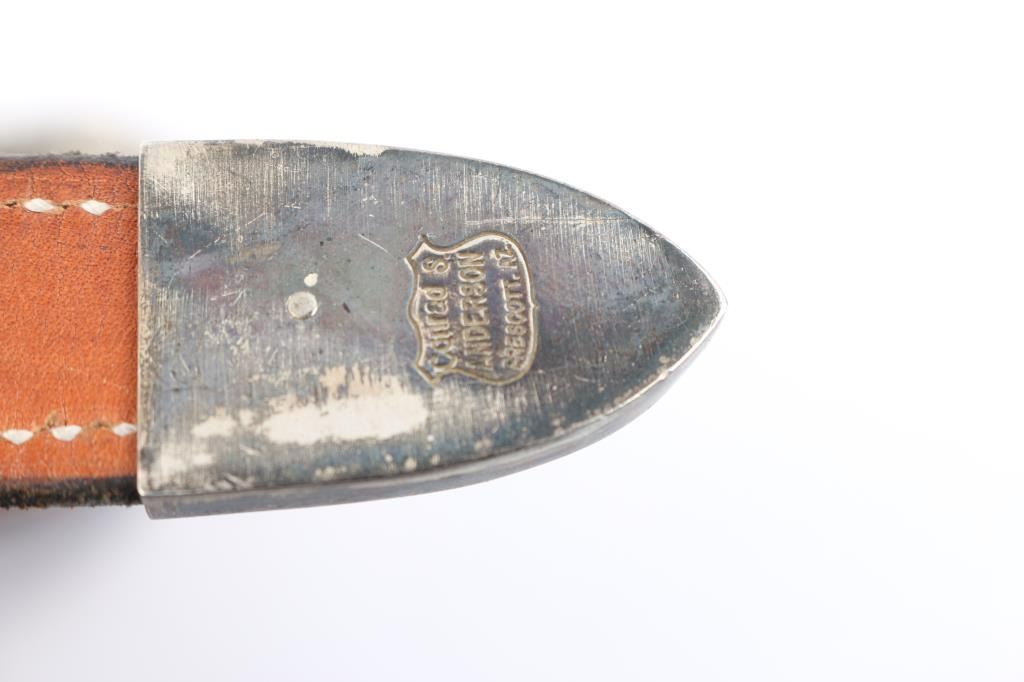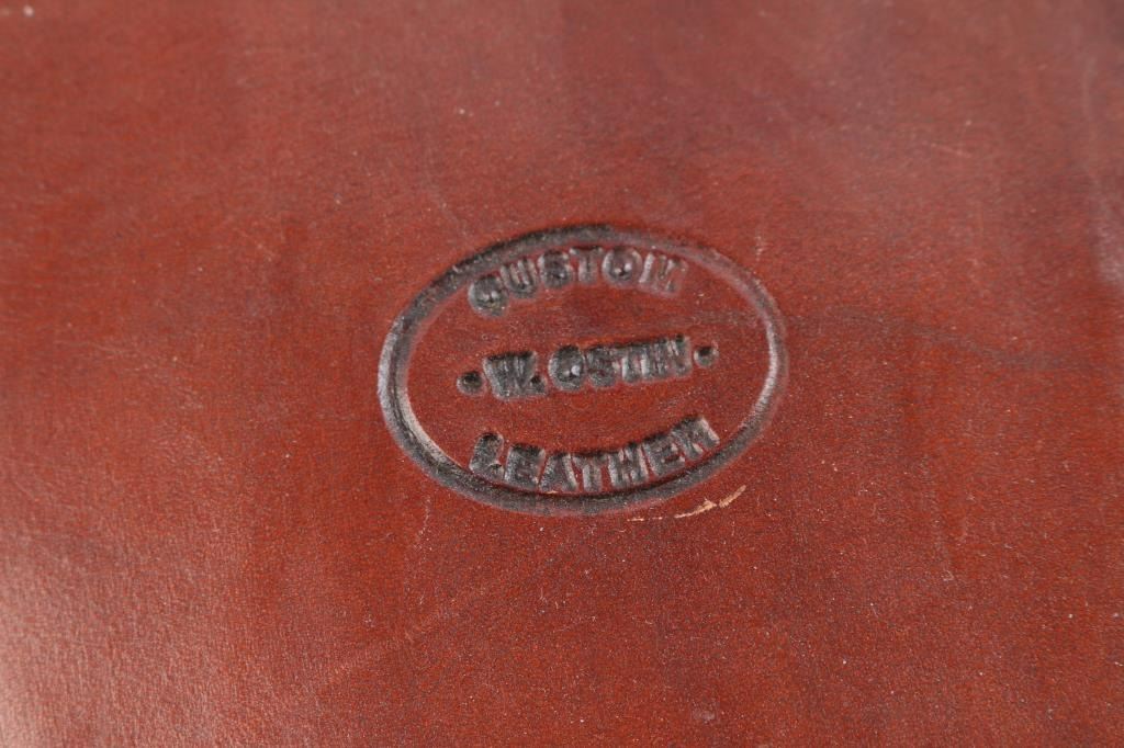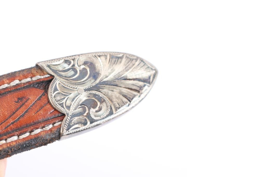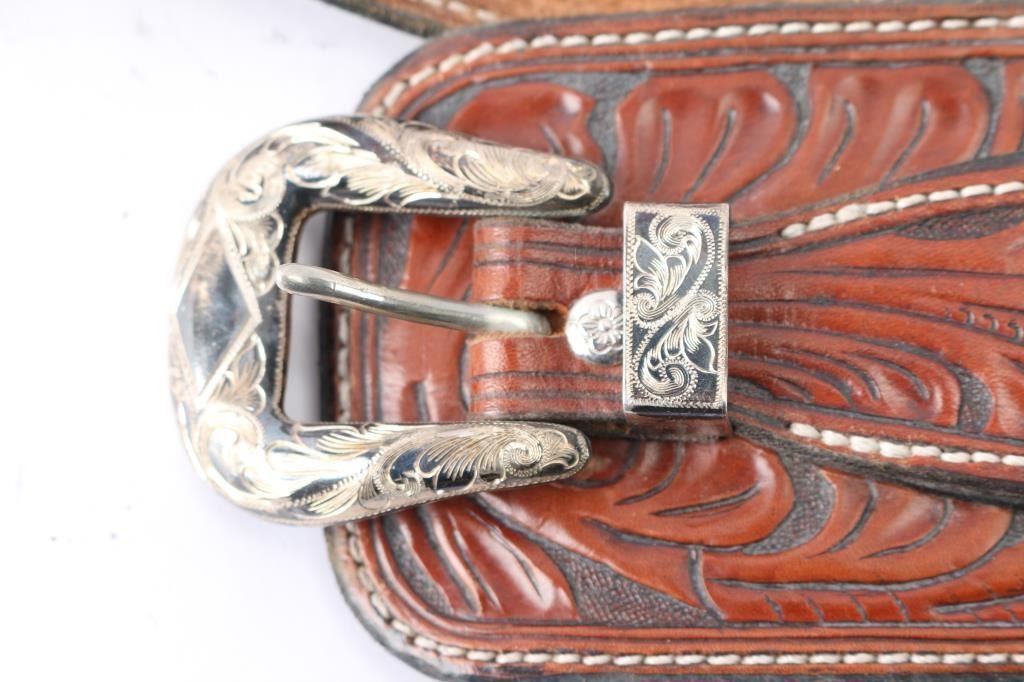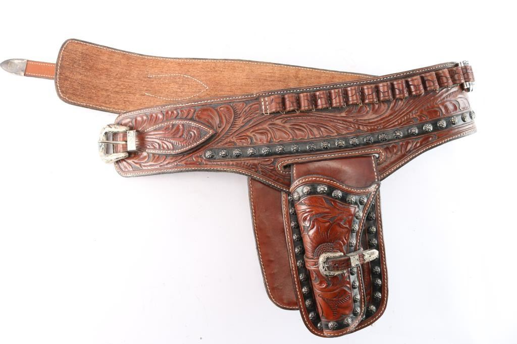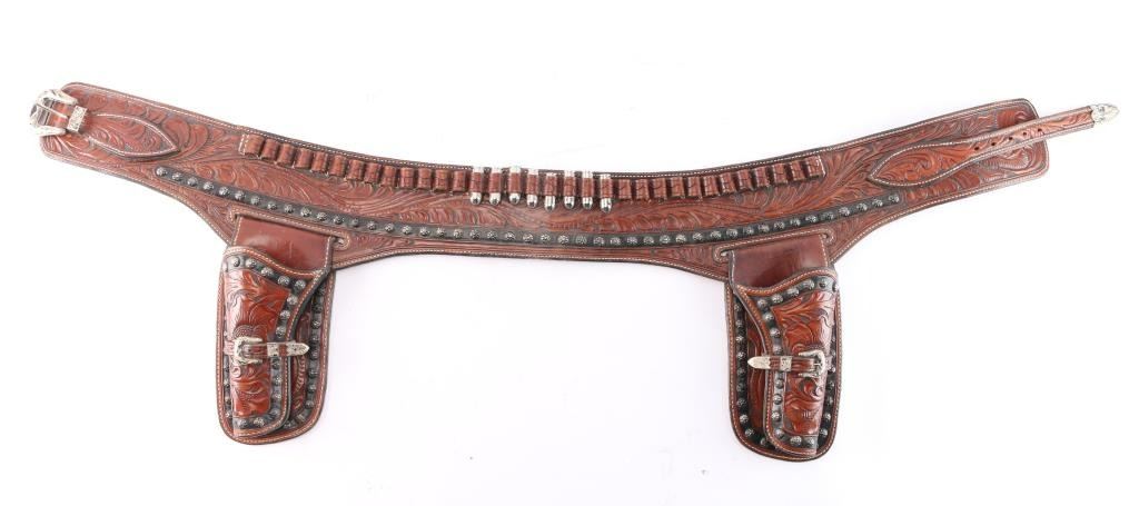 Done in the Roy Rogers Styling, Two tone brown and black tooled double rig with sterling spotted design, maker marked. Includes a Sterling belt Buckle made by Conrad Anderson.