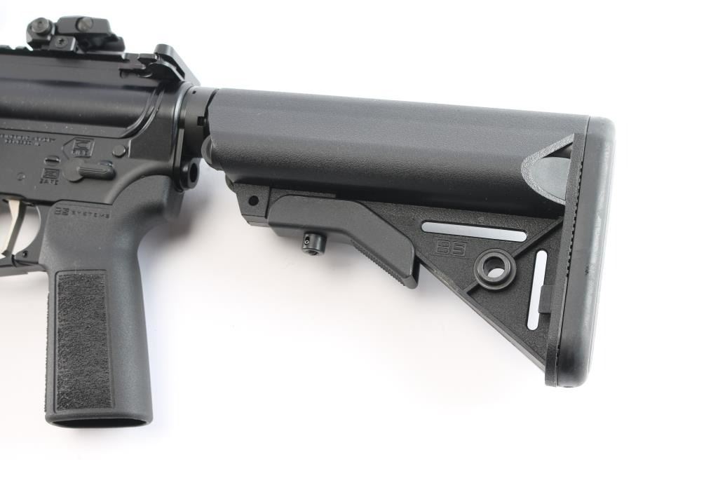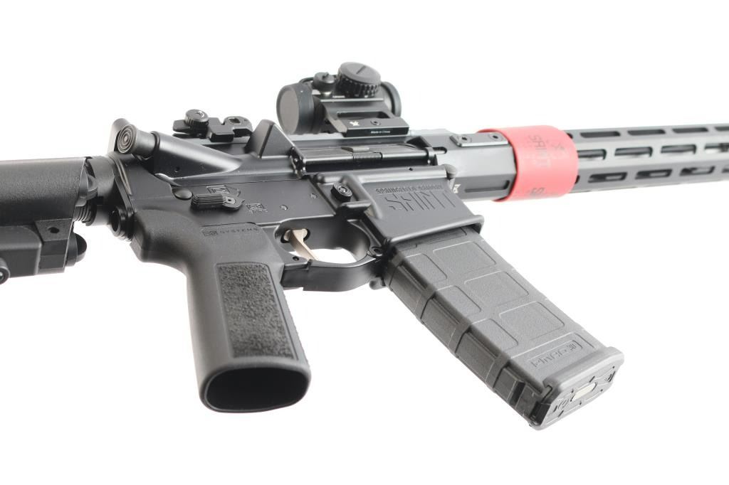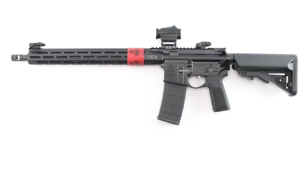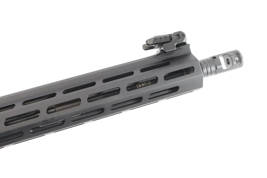 "Victor". AR-15 Rifle chambered in 5.56 NATO. Features 16" barrel with SA Multi-port Muzzle Brake, 1:8 twist, 15 3/4" M-LOK Free Float Handguard, B5 Systems polymer pistol grip and adjustable shoulder stock, forward assist, shell deflector, Low Profile Spring-Loaded Adjustable Flip-Up sights, Direct Impingement Mid-Length Pinned Adjustable Gas Block, Nickel Boron Coated Flat GI trigger, Forged 7075 T6 Aluminum, Type III Hardcoat Anodized, Accu-Tite Tension System lower, Carbine "H" Heavy Tungsten Buffer, matte black finish. Bore is pristine. Retains approx. 98% finish with no visible scratches and or marks. Comes with one 30rd PMag magazine, mounted Vortex Crossfire Red Dot site, manual and soft case. NRA Condition is Excellent - like new. ***Modern Firearm***.
