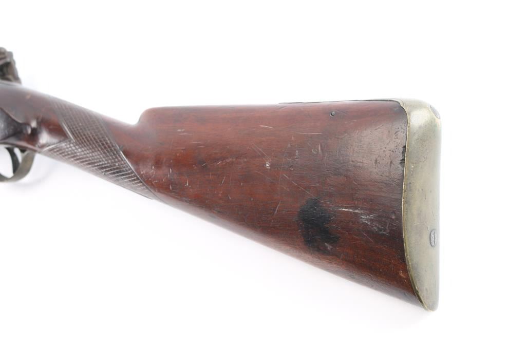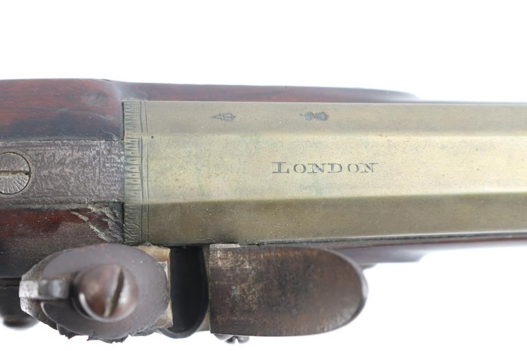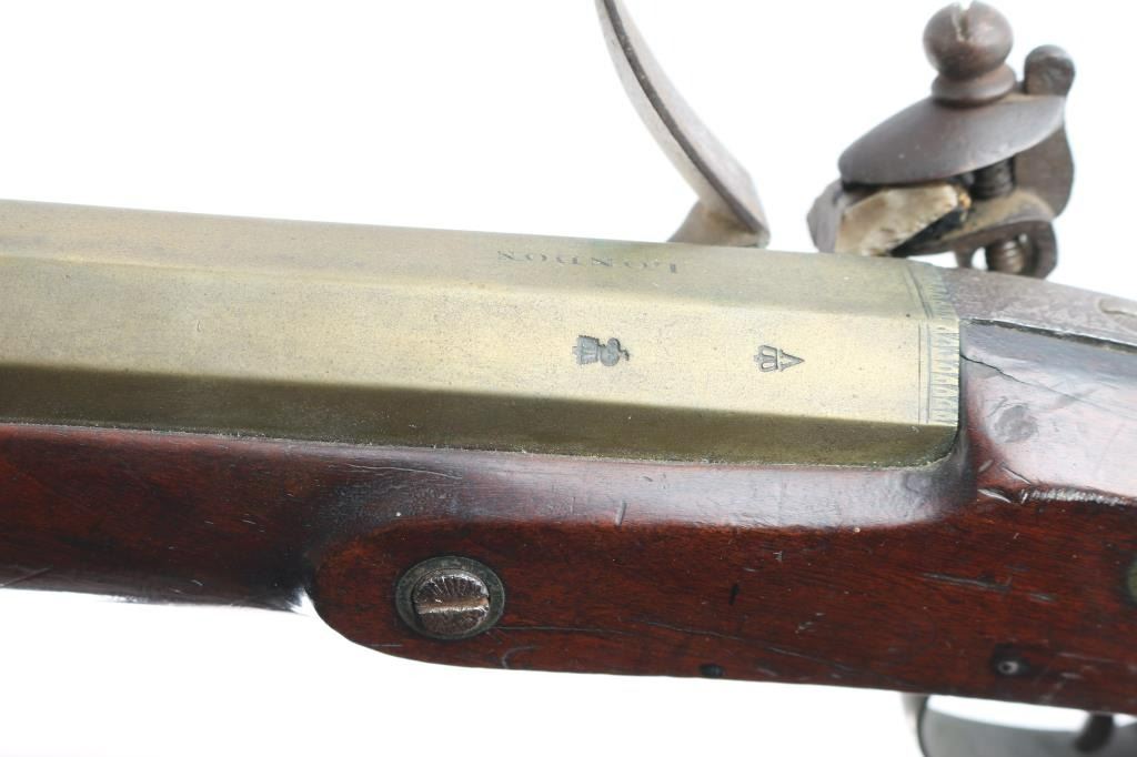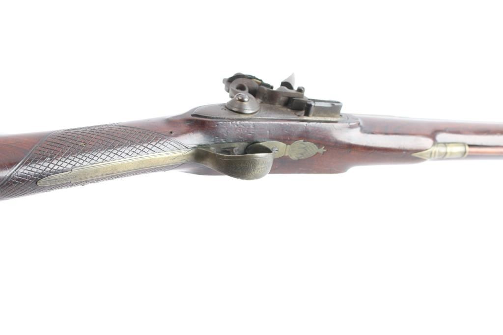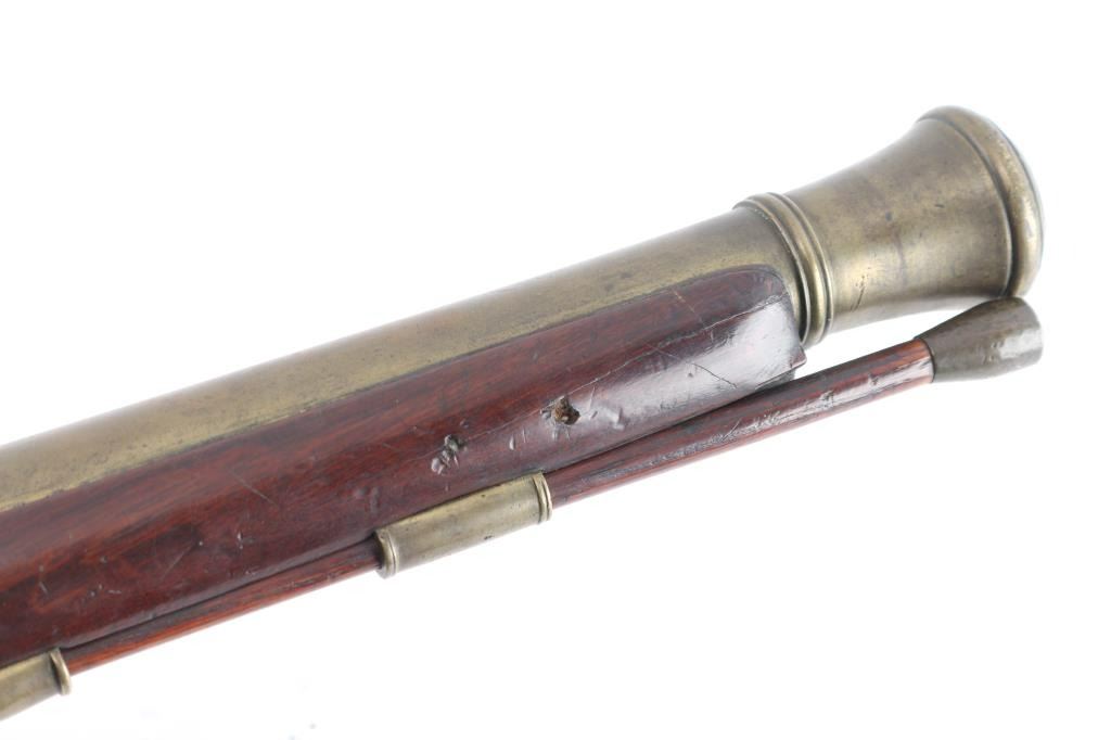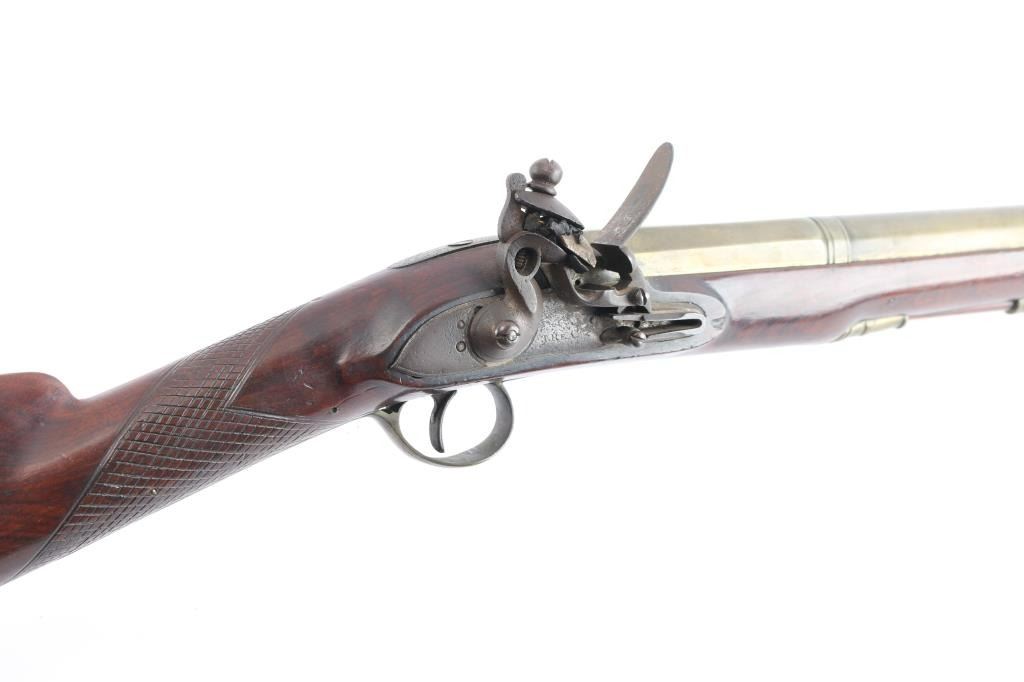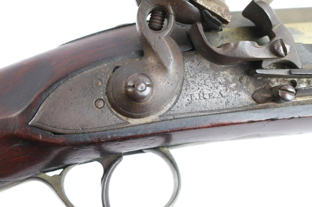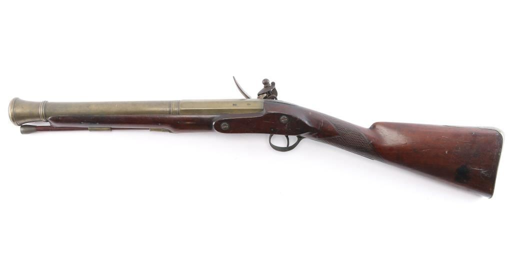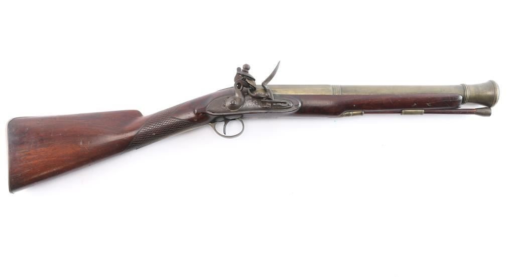18th Century Brass Cannon-Barrel ‘Royal Navy’ Form Blunderbuss by John Rea of London. John I. Rea, elected Master of the Gunmakers' Company in 1796 and 1805. He worked at 122 Minories 1777-78, and 91 Minories between 1779 and 1797. The present blunderbuss was probably made during the latter period. In 1778 he traded as John Rea & Sons and was contractor to the East India Company until 1804. 16" octagonal/round barrel, 10 bore that flares to 1 1/4" at the muzzle, marked "London" on the top flat. Correct two London proofs on the left flat, "GP" under crown (Gunmakers Proof) and the "V" under crown. (Inspection after proof). Lock marked "J.Rea". The furniture is brass, including ramrod thimbles and features floral engraving and a pineapple trigger guard finial, the triggerguard has a oval containing the Union Jack. Has the original wood ramrod with flared brass loading tip and metal worm at the other end. The lock is complete ,hammer has top jaw and screw, frizzen, frizzen spring, pan, there is a very old piece for leather with flint in the jaw. The hammer action is excellent with half cock working fine, The wood is overall very good with nice hand checkering on the wrist, some minor dents, the is a hairline crack in the forward right forearm. The bore is very good, the brass has a nice mellow patina.