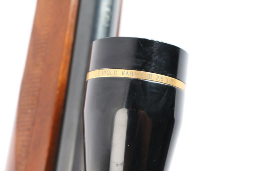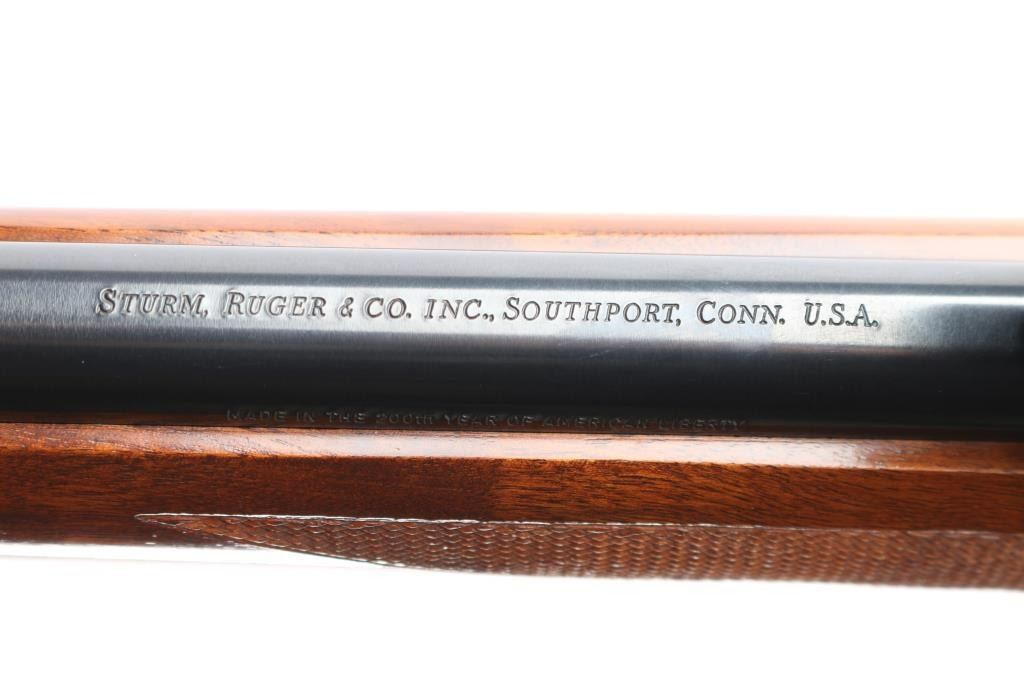 Single shot falling block 1-B rifle chambered in 7mm Magnum. US 200th Anniversary edition with bicentennial inscription on the barrel. Features blued finish, walnut butt stock & forend, 26" tapered barrel with quarter rib for scope mounting, no provisions for sights, checkering on sides of forend & wrist, semi-beavertail forearm, sliding tang safety, sling studs, thin rubber factory butt pad, wide serrated adjustable trigger. Mounts factory 1" scope rings, Leupold Vari-X III 2.5x8 scope, duplex reticle, clear optics. Bore is excellent/bright. Retains 97% finish with minor edge wear on the receiver. Wood is excellent, fancy figure & fiddle grain. falling block action is smooth. Rifle is in like new condition. Manufactured 1976.