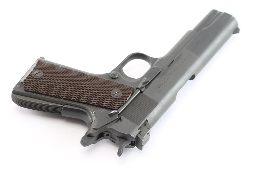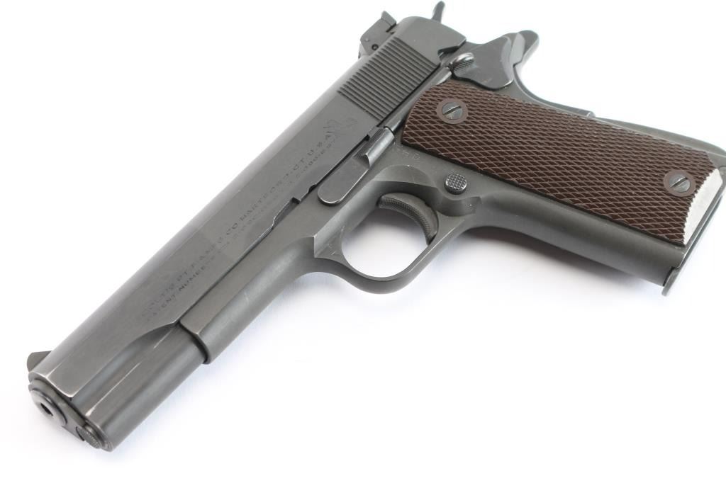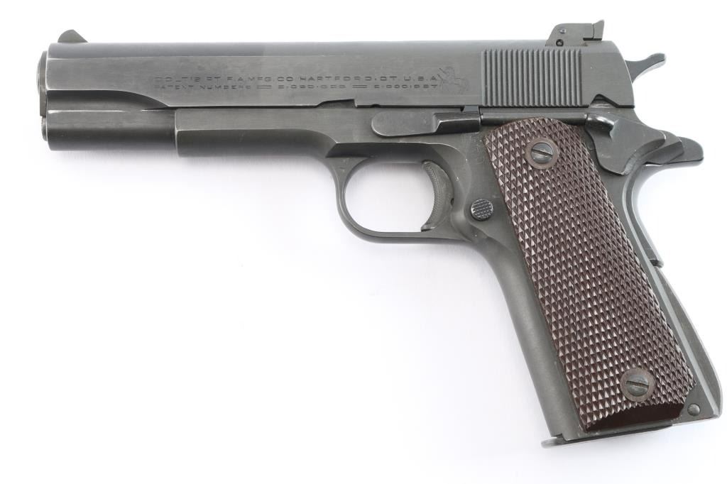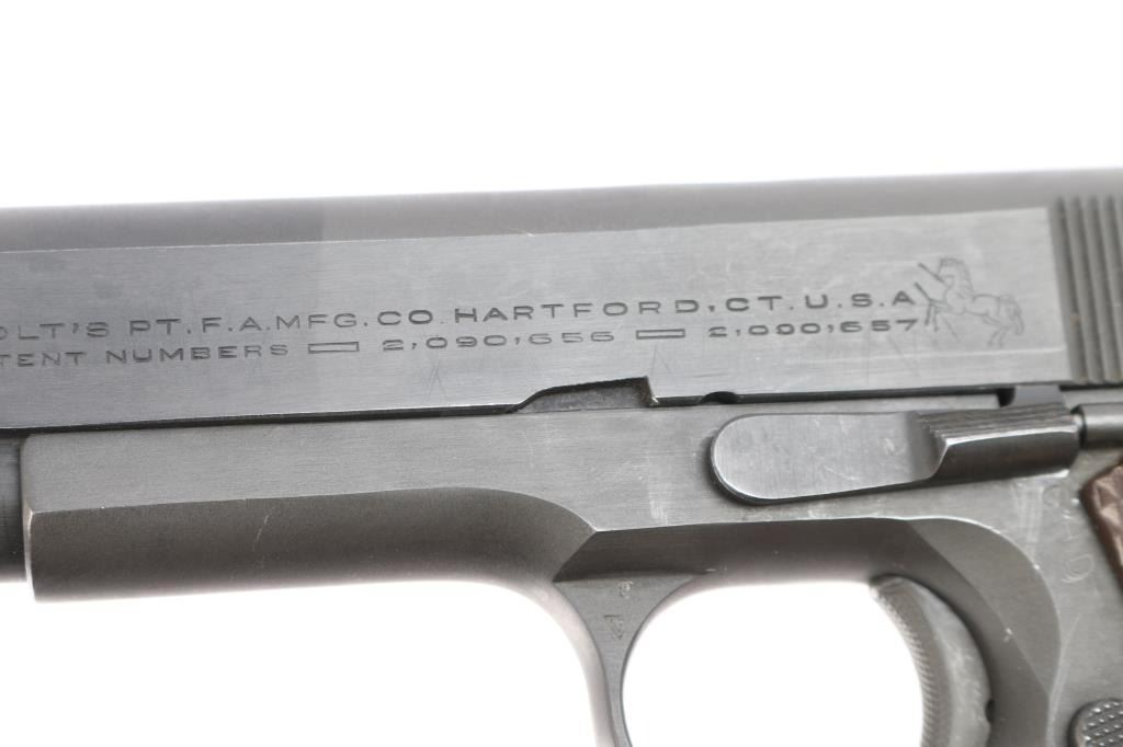 WW2 Guy H. Drewry inspected U.S. Military issued Colt Service Model Ace. Less than 12,000 of these pistols were produced for the military between 1936 and 1945. Has the features of the M1911A1, parkerized finish, manual and grip safeties, slide stop, push button magazine release. Manufactured in 1945, SM3725-SM13803 (End of Production). Not long in production after Colt swapped from using a blue finish to a parkerized finish on Ace Service Model pistols starting as serial number "SM3844", with this example being "SM6515". Features fixed blade front and adjustable notch rear sights, two-line Colt address and patent numbers followed with a Rampant Colt roll-marked on the left side of the slide, the model and caliber designations along with the "ACE" marking on the right side of the slide, Guy H. Drewry's "G.H.D." inspector initials stamped on the left side of the frame with the U.S. property marking, "crossed cannons" ordnance acceptance stamp, and "S M" prefix serial number on the right side, and Colt factory "X" over "triangle/VP" proofs on the left side of the trigger guard with "77" on the right side. Fitted with a pair of checkered Colt wood plastic grips and a blued magazine marked "COLT/22L.R./SERVICE MODEL" on the base. The bore is excellent/bright with strong rifling, slide action is smooth, grips are excellent with no chips or cracks and the checkering is sharp,the parkerized finish is about 97% with minor edge/friction wear and a couple of very minor scratches. The blued magazine is excellent with minor friction wear. All markings are crisp/clear. Rare to find one in this condition.