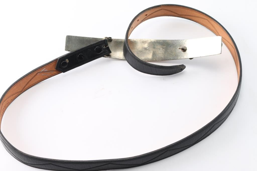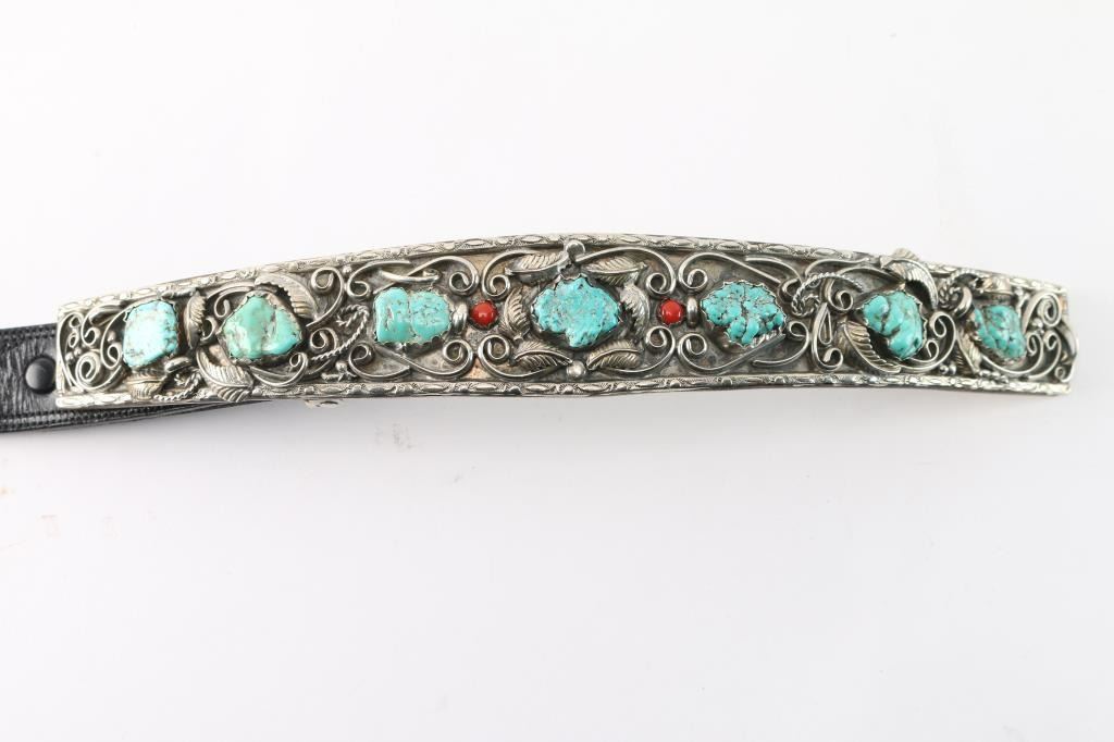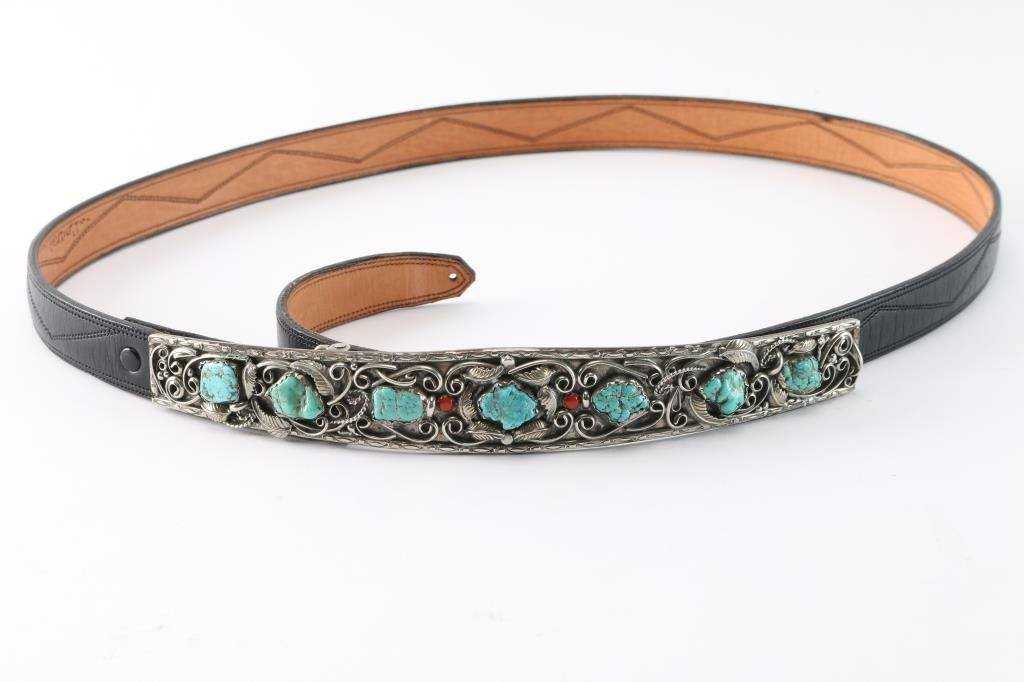 Sterling silver buckle measures 9" x 1-1/2". With 6 turquoise stones, 2 coral stones and intricate leaf and swirling stems design. Buckle weighs 152.05 grams. Size 41"-44" with current ;eather belt