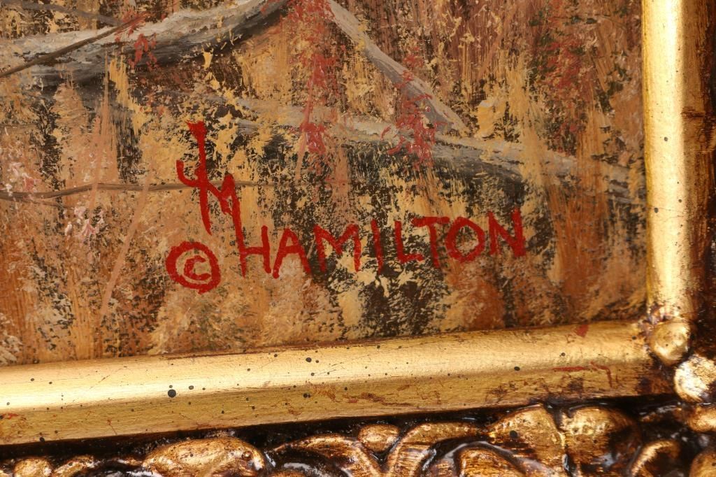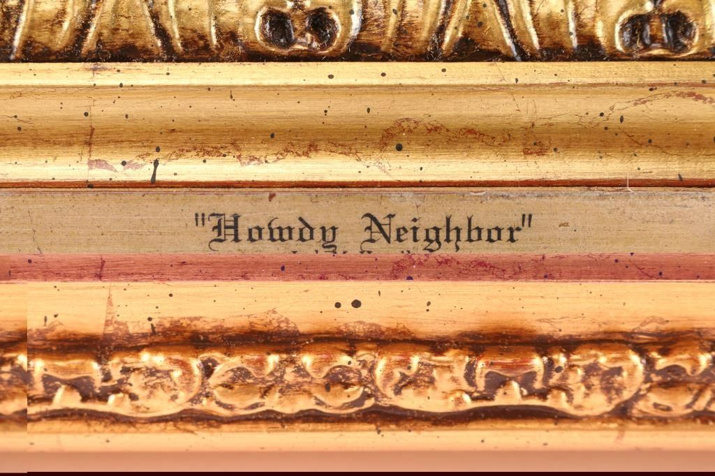 By Colorado artist, Jack M. Hamilton, entitled "Howdy Neighbor". Hamilton loved the outdoors, nature's wildlife and American history. He spent years watching, studying and photographing his favorite subjects, often from his working cattle ranch in southern Colorado. Painting on both canvas and panel, Jack worked entirely in the medium of oil. Self-taught, Jack painted in the manner of the old masters. Hamilton was exhibited at many of the country's finest galleries and at many fine art shows. His work has been featured on the cover of, as well as in, national magazines. Measures 20" x 16".