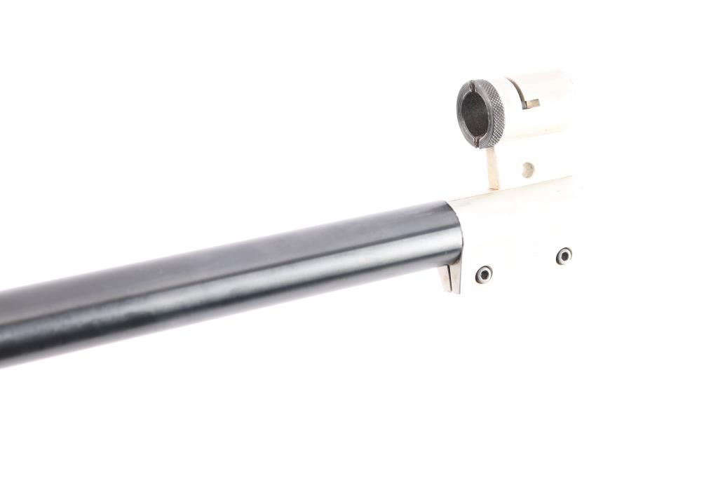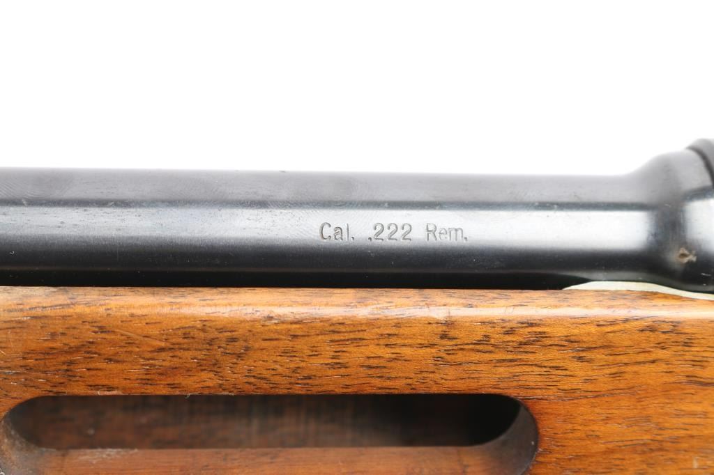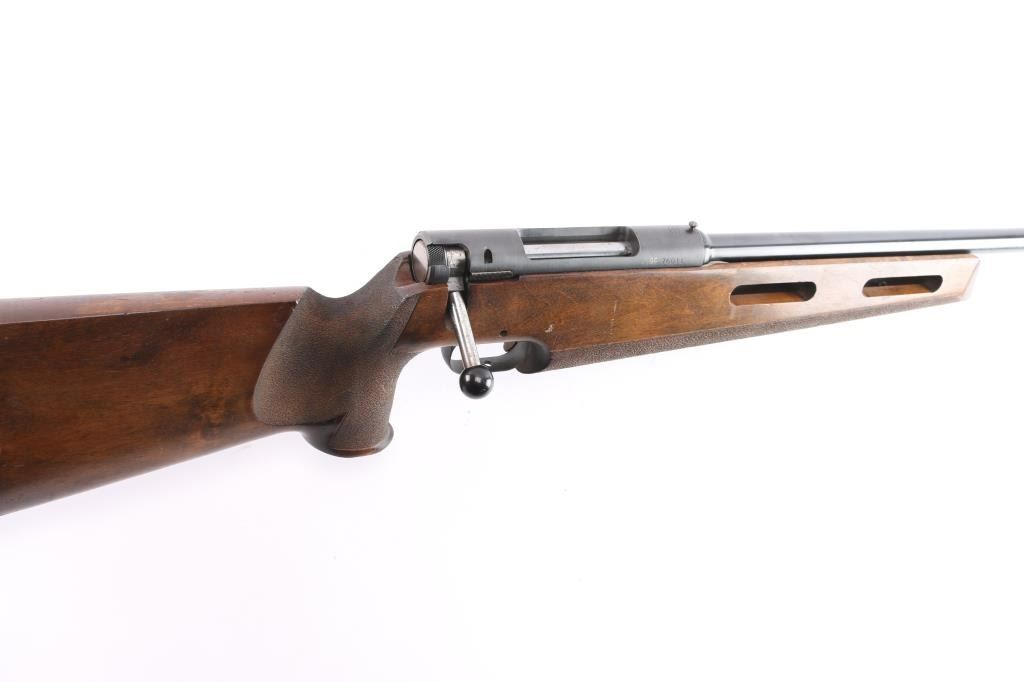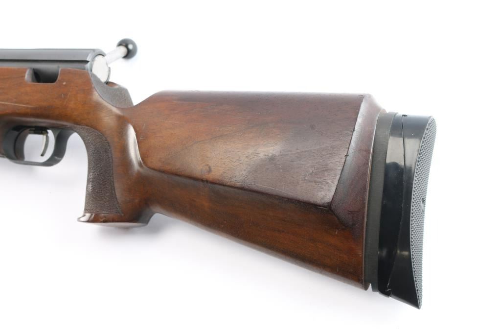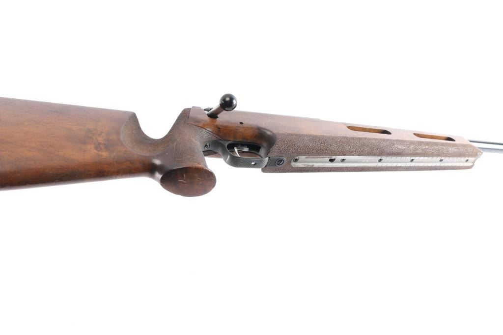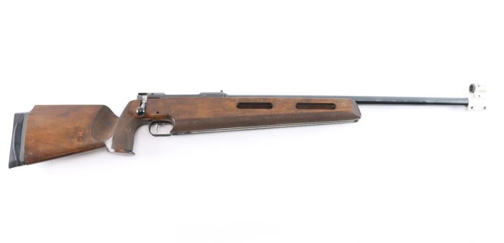 SN: 76011. Grünig + Elmiger AG (G&E) is a Swiss firearms manufacturer that produces bolt-action rifles with a main focus on CISM and ISSF shooting, which are designed to be competitive at the World Cup and Olympic level. Single-shot, bolt-action target rifle. 26" blued heavy free floated barrel chambered in .222 Remington, adjustable target trigger, straight bolt handle with black polymer knob, globe front sight,(No inserts) , no rear sight, receiver slotted of side mounted sight. Target stock with vented forearm, adjustable recoil pad, flared, round grip, full length accessory rail in underside of fore stock, textured panels on grip and fore stock. Bore appears good/ bright, rifling present, frosting in the grooves, blued barrel, matte receiver are very good with minor scratches/rubs, action is smooth and the wood is very good with minor scratches/dings.