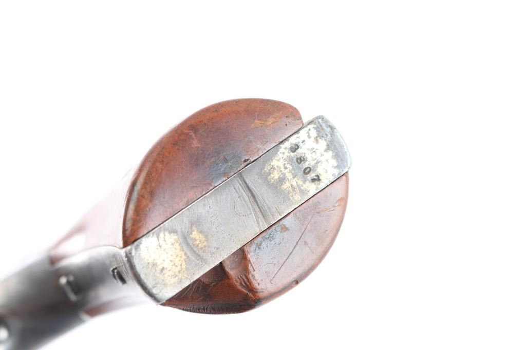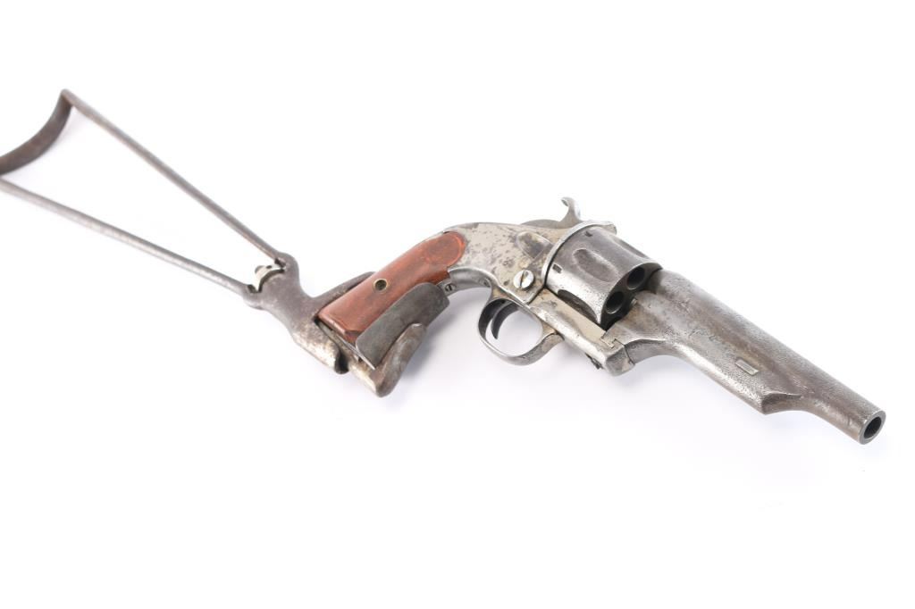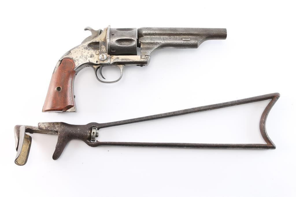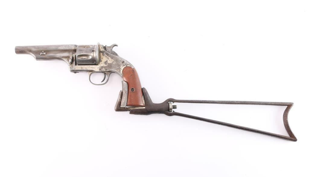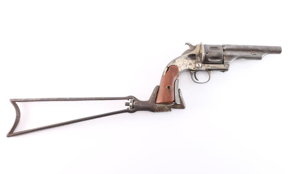 #3807 Has early scoop flutes and mottled red gutta percha grips, along with B. Kittredge & Co. (Ohio dealer) style attachable shoulder stock of same era. The pistol heavily used and shortened to 5 1/4" from 7 1/2" bbl. Light to moderate pitting with just traces of nickel remaining. Action does not work (no spring). Markings not visible and grips show large chips and losses. Screws and small parts missing. Fair to poor overall. The stock matches well and definitely usable with this pistol. An interesting "old western frontier" ensemble. Condition is NRA Fair