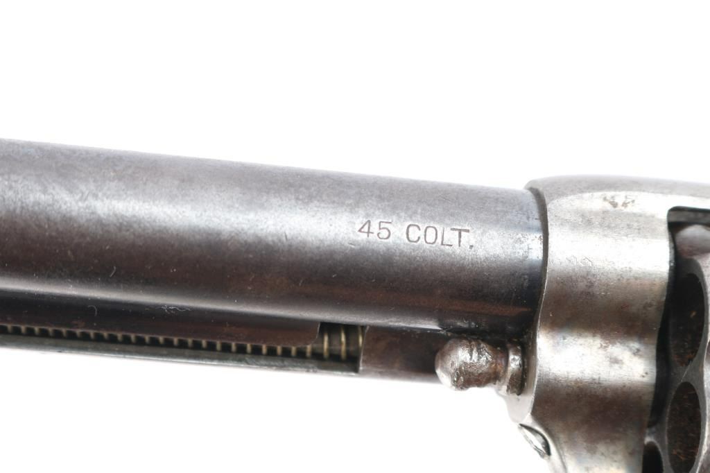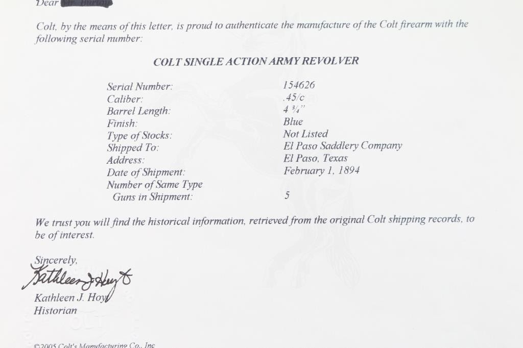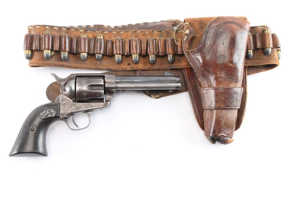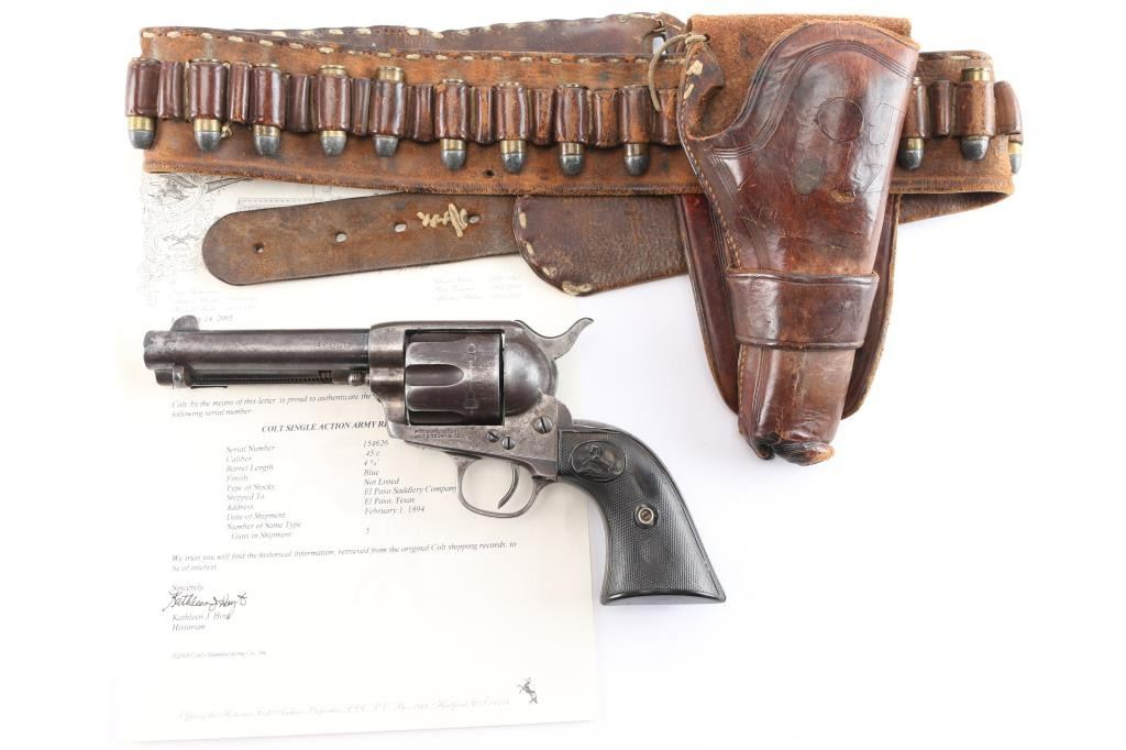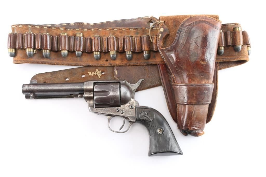 El Paso, Texas shipped antique Colt Single Action Army Revolver with holster rig with different cattle ranch brands scratched into the leather. Single action revolver chambered in .45 Long Colt. Manufactured in Hartford, CT circa 1894. Features a blued & case hardened finish, 4 3/4" barrel with two line address, blade front sight, v-notched rear sight, ejector rod with crescent head, fluted six-shot cylinder, two line patent markings on the frame with "Rampant Colt", screw-in cylinder pin retainer, smooth thin trigger, bordered & underlined knurling on the hammer, and two-piece black checkered hard rubber grip with molded Rampant Colt motifs at the tops. Matching serial numbers are found on the frame, trigger guard, and backstrap. Other markings: "45 Colt" on the left barrel and assembly number "425" on the loading gate. The action is smooth/crisp, the bore is fair with good rifling, scattered light pitting, the blue is about 10% in protected areas, mostly on the ejector rod housing, with the rest turned a a molted gray/brown patina with some scattered light pitting, the grips are overall good with no chips or cracks, handling wear to the checkering, mostly on the right panel. Comes with a period russet cartridge belt with 40 .45 Colt cartridge loops. The cartridge belt is made of folded, russet skirting leather with an iron buckle. The tongue billet, buckle chape and cartridge loops are sewn to the belt body, Stamped "F.A. Meanea, Cheyenne" (Pre 1890 Wyoming Statehood / No “WT” “WYO” on Trademark) Frank A. Meanea was born in 1849 and came to Cheyenne in 1868 to work in the famous saddle shop owned by his uncle, E.L. Gallatin. He eventually became the owner of the shop and continued to produce saddles, chaps, gun rigs, and all types of leather products until his death in 1928. Russet single loop holster stamped "Jos. Sullivan, Maker. Ft. Benton M.T." (Montana Territory). Circa 1880-83. Illustrated and described on pages 102-103 of "PACKING IRON" by Richard C. Rattenbury. The holster and belt have seven different Montana cattle ranch brands scratched into them. Comes with an old hand written note listing the ranches associated with the brands. We looked up one of the ranches listed, Joseph Henderson, after making his money gold mining in Henderson gulch, he purchased land in 1872. In 1892 Joseph Henderson purchased a purebred Aberdeen-Angus bull to use with his Shorthorn cows. Comes with the Colt factory letter dated 2005 that confirms the features and caliber of the revolver. One of five guns shipped to El Paso Saddlery Co. Texas on February 1, 1894. A Colt SAA with a fantastic history. Worthy of further research.