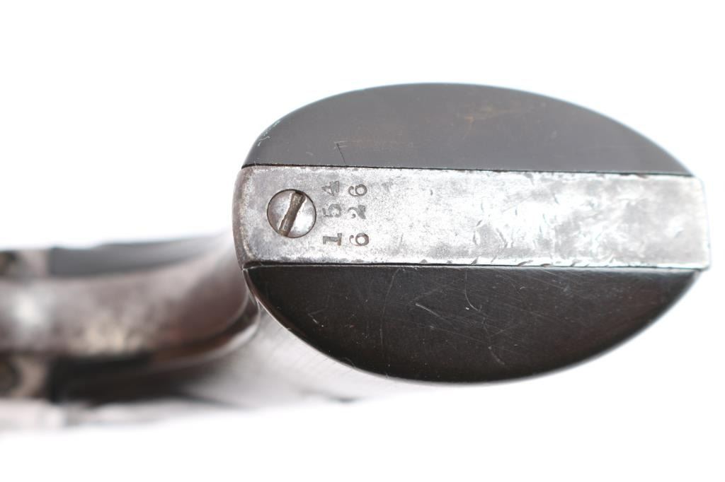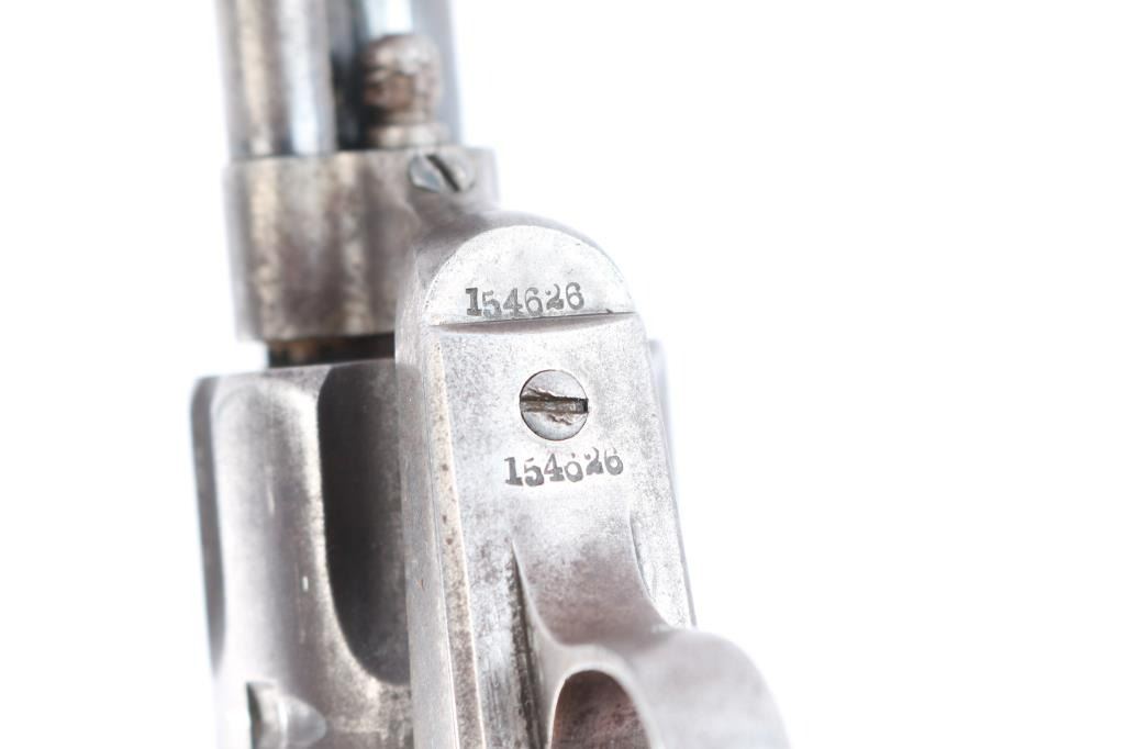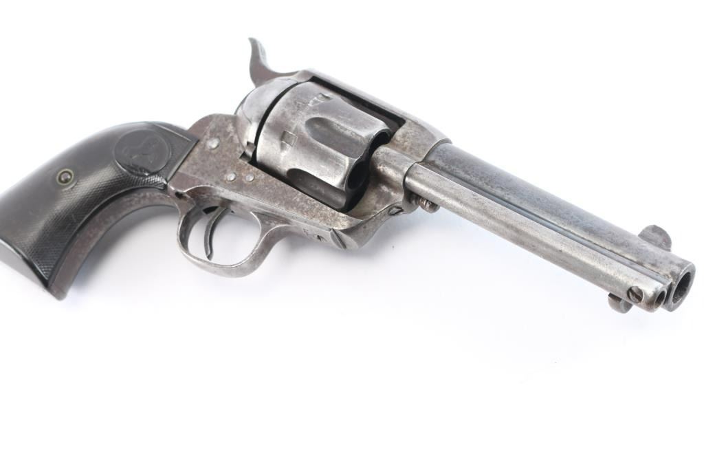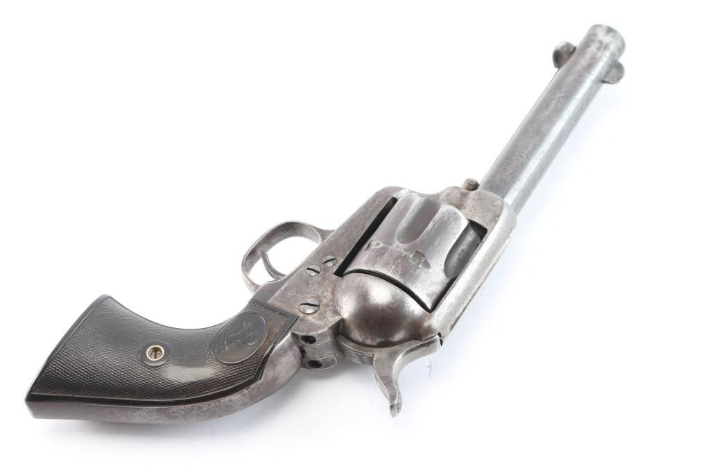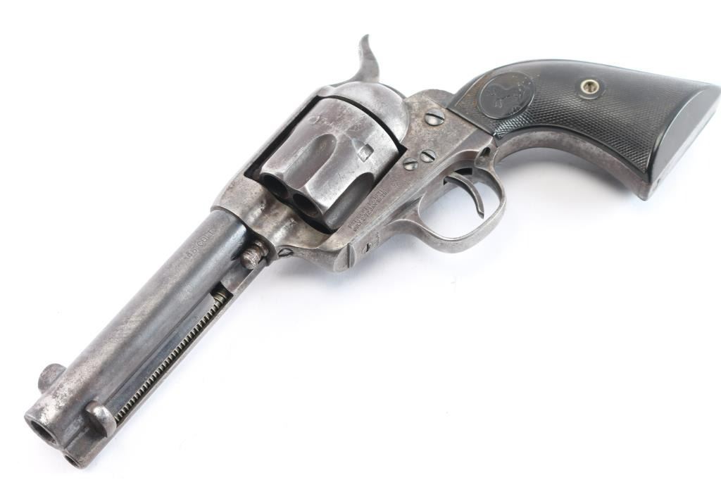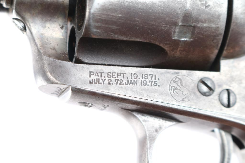 El Paso, Texas shipped antique Colt Single Action Army Revolver with holster rig with different cattle ranch brands scratched into the leather. Single action revolver chambered in .45 Long Colt. Manufactured in Hartford, CT circa 1894. Features a blued & case hardened finish, 4 3/4" barrel with two line address, blade front sight, v-notched rear sight, ejector rod with crescent head, fluted six-shot cylinder, two line patent markings on the frame with "Rampant Colt", screw-in cylinder pin retainer, smooth thin trigger, bordered & underlined knurling on the hammer, and two-piece black checkered hard rubber grip with molded Rampant Colt motifs at the tops. Matching serial numbers are found on the frame, trigger guard, and backstrap. Other markings: "45 Colt" on the left barrel and assembly number "425" on the loading gate. The action is smooth/crisp, the bore is fair with good rifling, scattered light pitting, the blue is about 10% in protected areas, mostly on the ejector rod housing, with the rest turned a a molted gray/brown patina with some scattered light pitting, the grips are overall good with no chips or cracks, handling wear to the checkering, mostly on the right panel. Comes with a period russet cartridge belt with 40 .45 Colt cartridge loops. The cartridge belt is made of folded, russet skirting leather with an iron buckle. The tongue billet, buckle chape and cartridge loops are sewn to the belt body, Stamped "F.A. Meanea, Cheyenne" (Pre 1890 Wyoming Statehood / No “WT” “WYO” on Trademark) Frank A. Meanea was born in 1849 and came to Cheyenne in 1868 to work in the famous saddle shop owned by his uncle, E.L. Gallatin. He eventually became the owner of the shop and continued to produce saddles, chaps, gun rigs, and all types of leather products until his death in 1928. Russet single loop holster stamped "Jos. Sullivan, Maker. Ft. Benton M.T." (Montana Territory). Circa 1880-83. Illustrated and described on pages 102-103 of "PACKING IRON" by Richard C. Rattenbury. The holster and belt have seven different Montana cattle ranch brands scratched into them. Comes with an old hand written note listing the ranches associated with the brands. We looked up one of the ranches listed, Joseph Henderson, after making his money gold mining in Henderson gulch, he purchased land in 1872. In 1892 Joseph Henderson purchased a purebred Aberdeen-Angus bull to use with his Shorthorn cows. Comes with the Colt factory letter dated 2005 that confirms the features and caliber of the revolver. One of five guns shipped to El Paso Saddlery Co. Texas on February 1, 1894. A Colt SAA with a fantastic history. Worthy of further research.