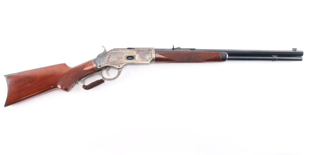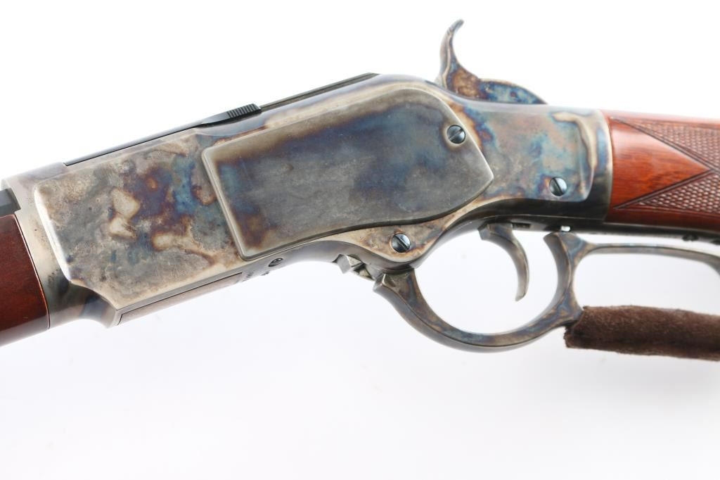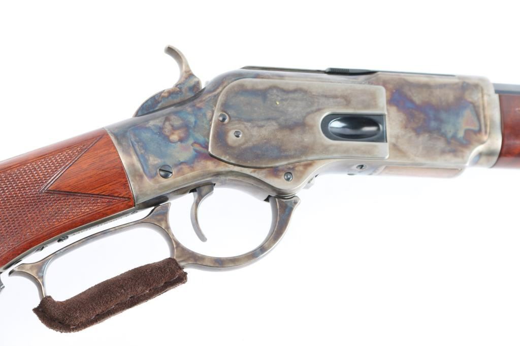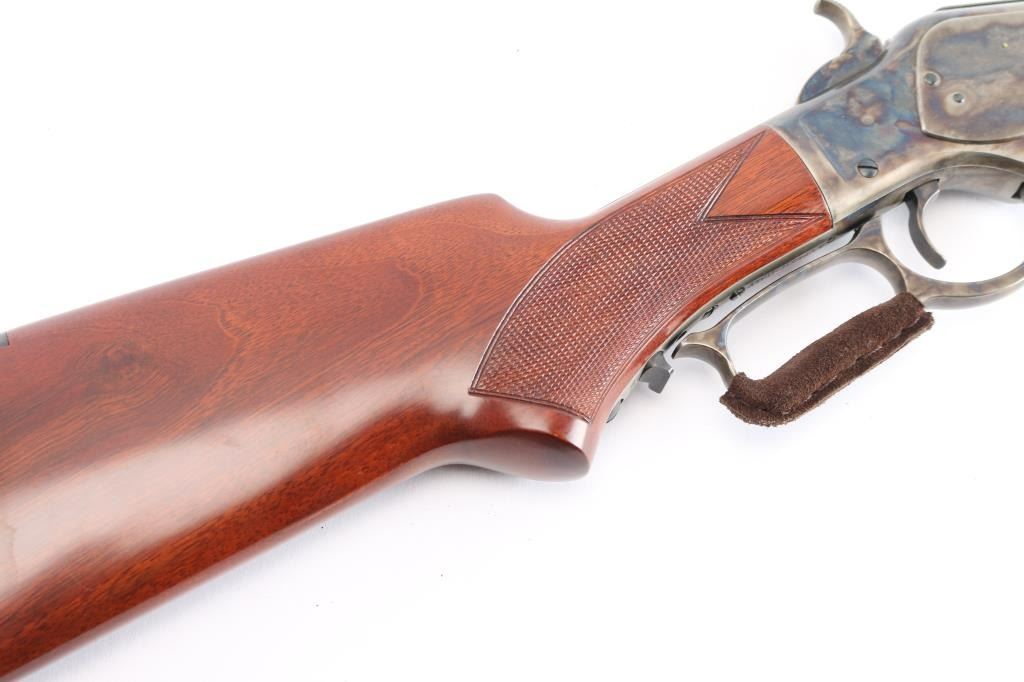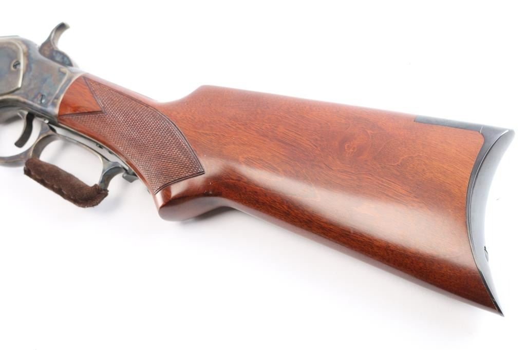 High quality reproduction of the Winchester Model 1873 lever action repeating rifle chambered in .357 Magnum. Manufactured in Italy by A. Uberti circa 2014-15 and imported / marketed by E.M.F. Co. of L.A., CA. Features a blued & case hardened finish, 20" octagonal barrel, dovetailed blade/brass bead front sight and an elevation adjustable semi-buckhorn rear sporting rear sight, full-length tube magazine, sliding dust cover, smooth wide curved trigger, checkered wide hammer spur, grip safety, checkered walnut forend with metal cap and checkered pistol grip shoulder stock with crescent metal buttplate & 13½” LOP. Rifle retains approximately 100% of original finish with no visible marks. The action is sound with a strong grip safety. The bore is pristine/very bright, and the walnut stocks are excellent. Suede wrap on lever. Condition is NRA near Perfect - like new.