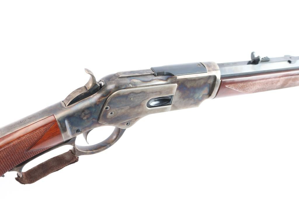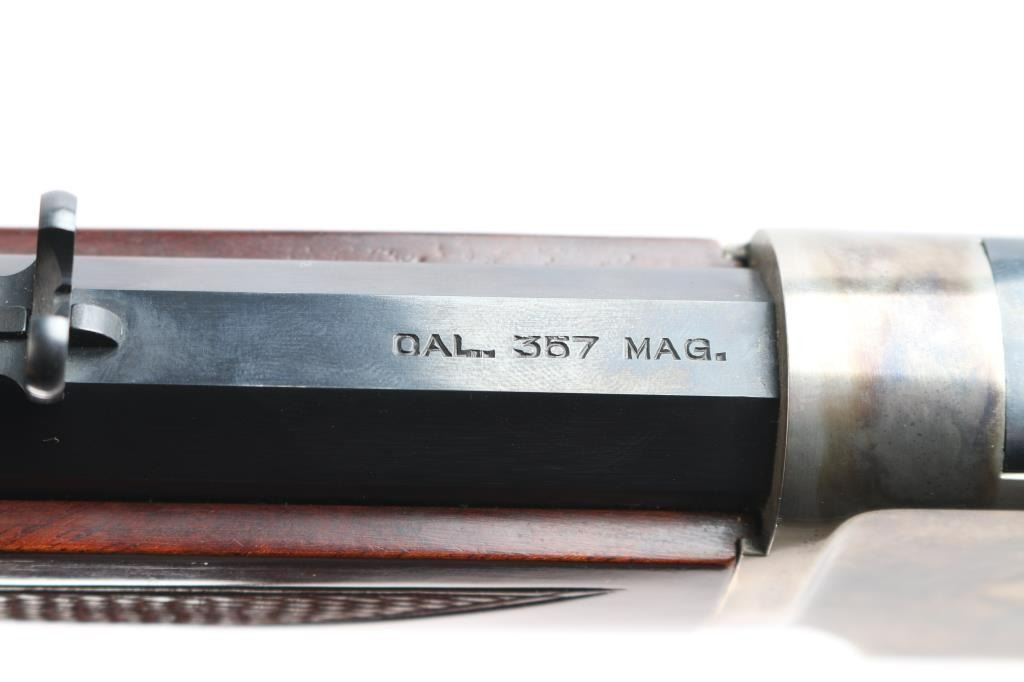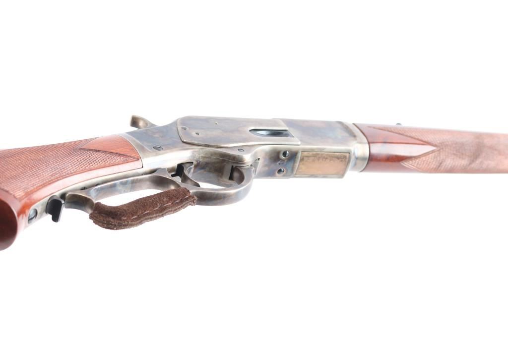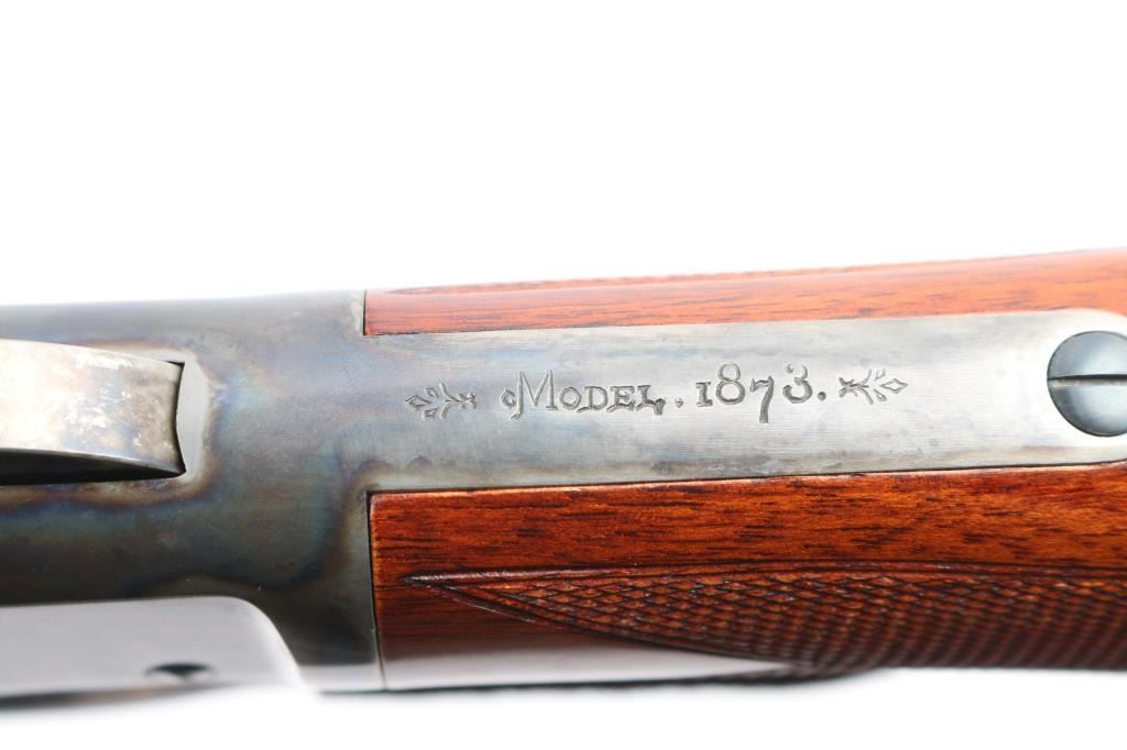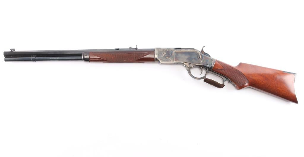 High quality reproduction of the Winchester Model 1873 lever action repeating rifle chambered in .357 Magnum. Manufactured in Italy by A. Uberti circa 2014-15 and imported / marketed by E.M.F. Co. of L.A., CA. Features a blued & case hardened finish, 20" octagonal barrel, dovetailed blade/brass bead front sight and an elevation adjustable semi-buckhorn rear sporting rear sight, full-length tube magazine, sliding dust cover, smooth wide curved trigger, checkered wide hammer spur, grip safety, checkered walnut forend with metal cap and checkered pistol grip shoulder stock with crescent metal buttplate & 13½” LOP. Rifle retains approximately 100% of original finish with no visible marks. The action is sound with a strong grip safety. The bore is pristine/very bright, and the walnut stocks are excellent. Suede wrap on lever. Condition is NRA near Perfect - like new.