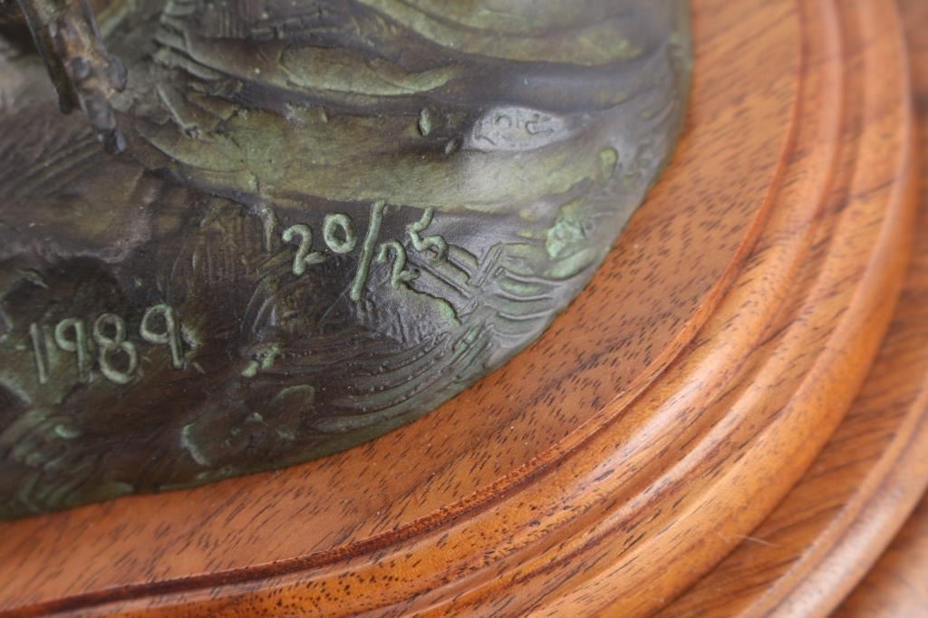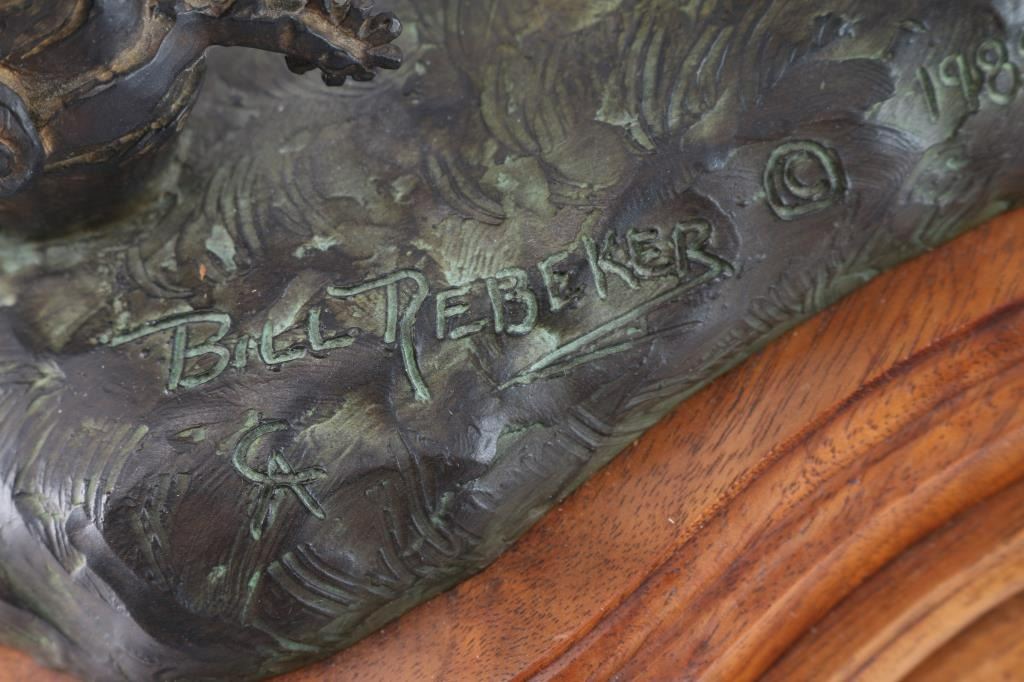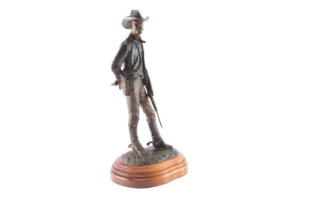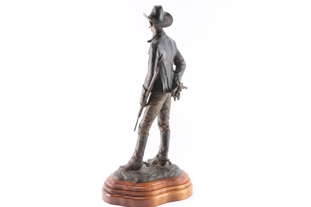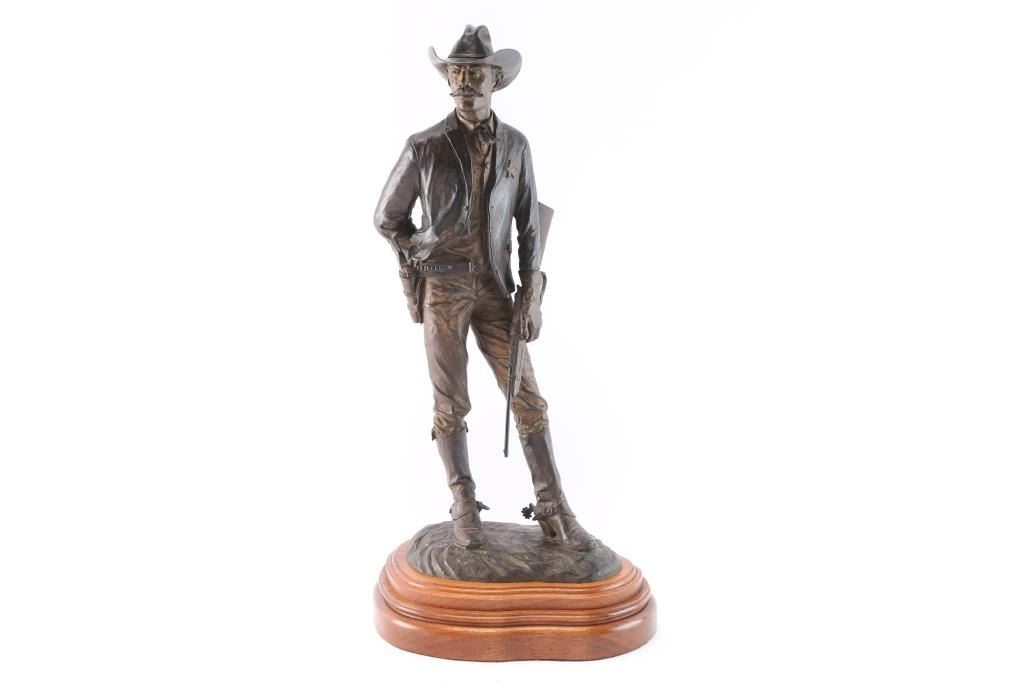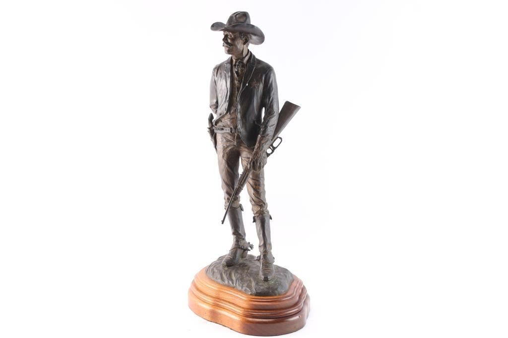 Entitled Texas Ranger by Bill Nebeker, signed in bronze by noted Prescott artist and Cowboy Artist of America. Portrays turn of the century Ranger with full western regalia and carrying 95 Winchester carbine. Dated 1989, signed and numbered 20 of 25. Measures 22 1/2" in height not including 2 1/2" base. Sticker on base from gallery in Wickenburg reads "Gold Medal Winner, Best of Show, 1989". Desirable.