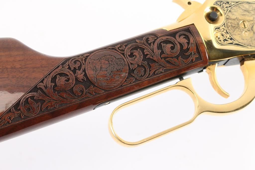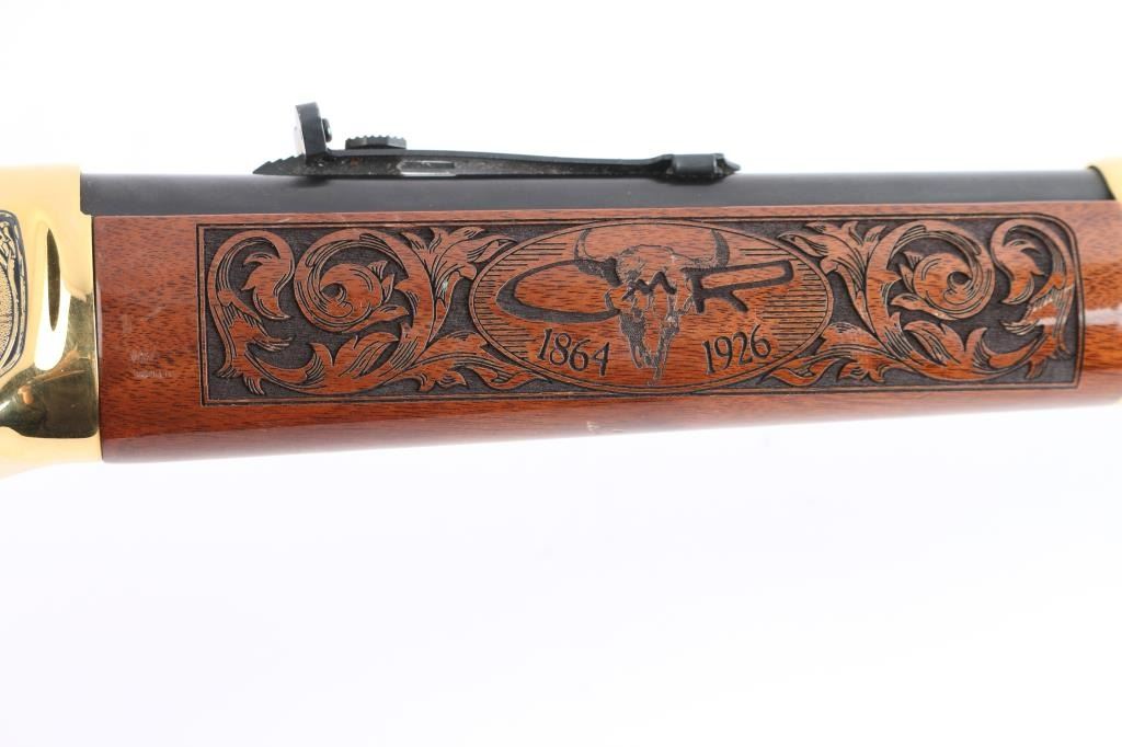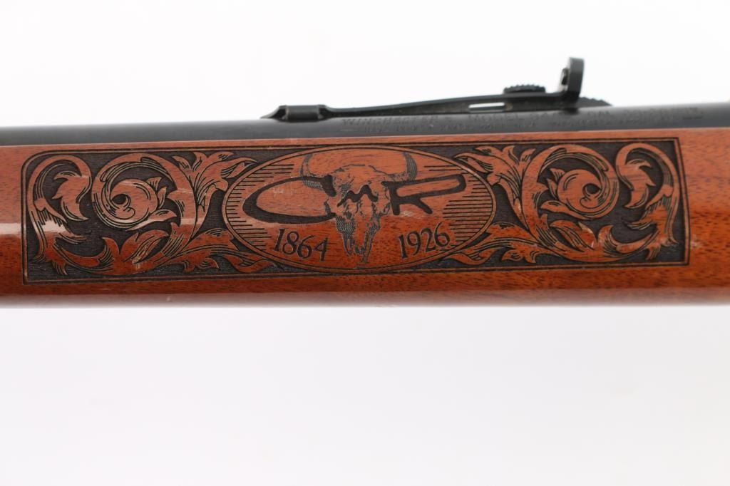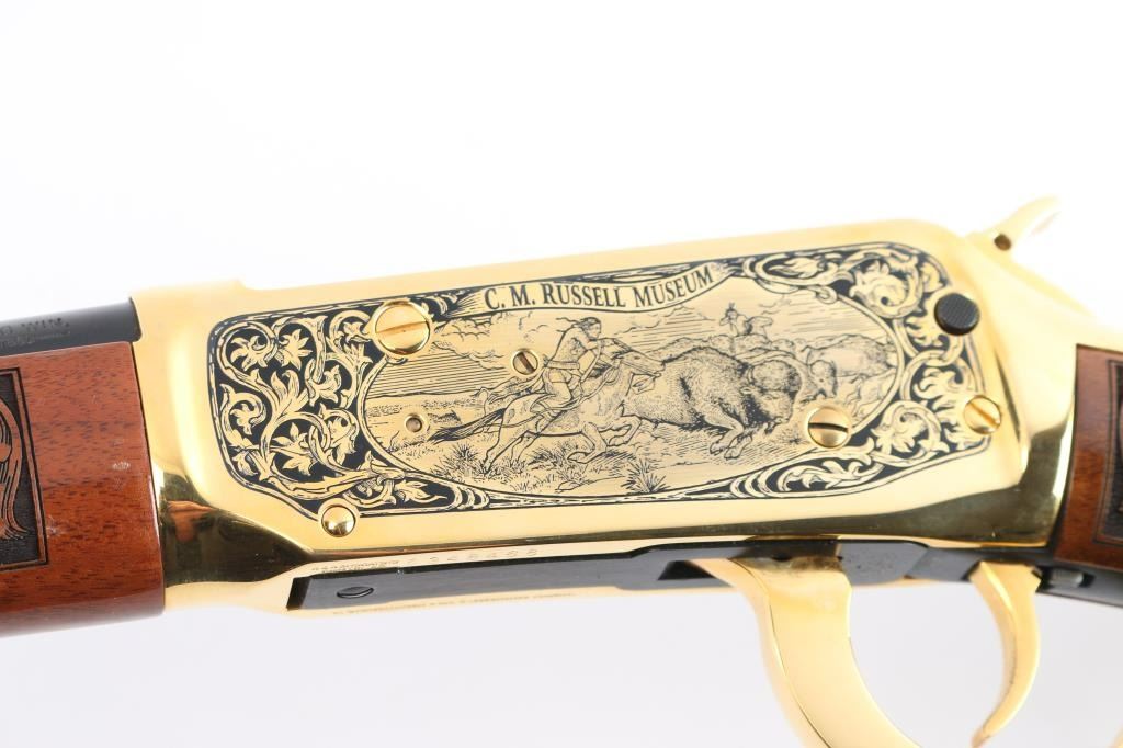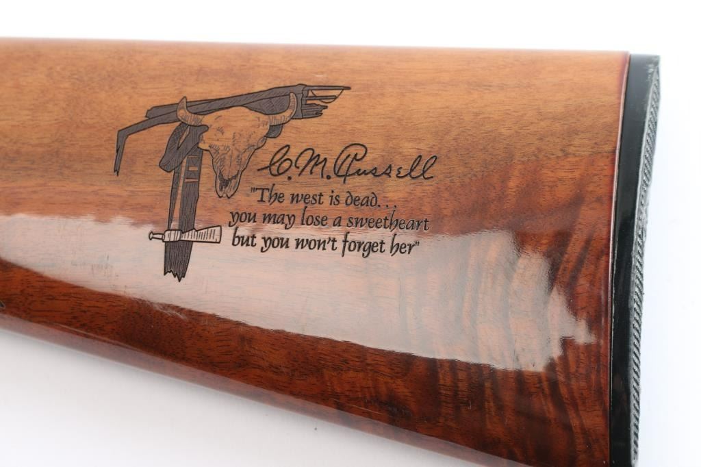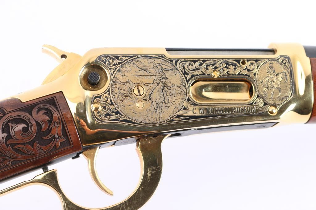 C. M. Russell Museum sanctioned Winchester Commemorative of Charlie Russell, America's western artist. Numbered 026 of 300. Excellent scenes of Russell's best western art works, his iconic trail skull logo along with his tributes in prose to the American west. Blued 20” barrel & full-length magazine tube with the majority of the remaining metal surfaces featuring a bright gold finish. Stocks are crafted of select walnut, are laser engraved with floral scroll & western scenes, and finished in high gloss. Rifle retains approximately 99% of its original finish showing superficial handling marks and a few light scratches. The action is sound, the bore is excellent and the walnut stocks are good with small blemishes & minor loss on the right side tip of the forend. Desirable and rarely encountered as museum patrons and art collectors "snapped them up" in original issuance.