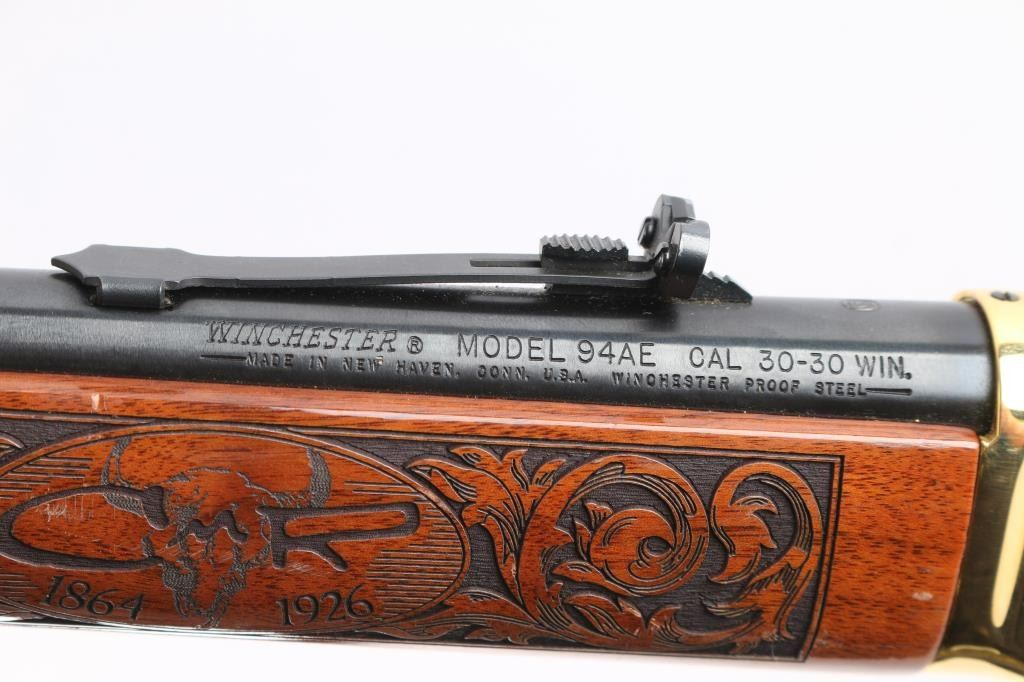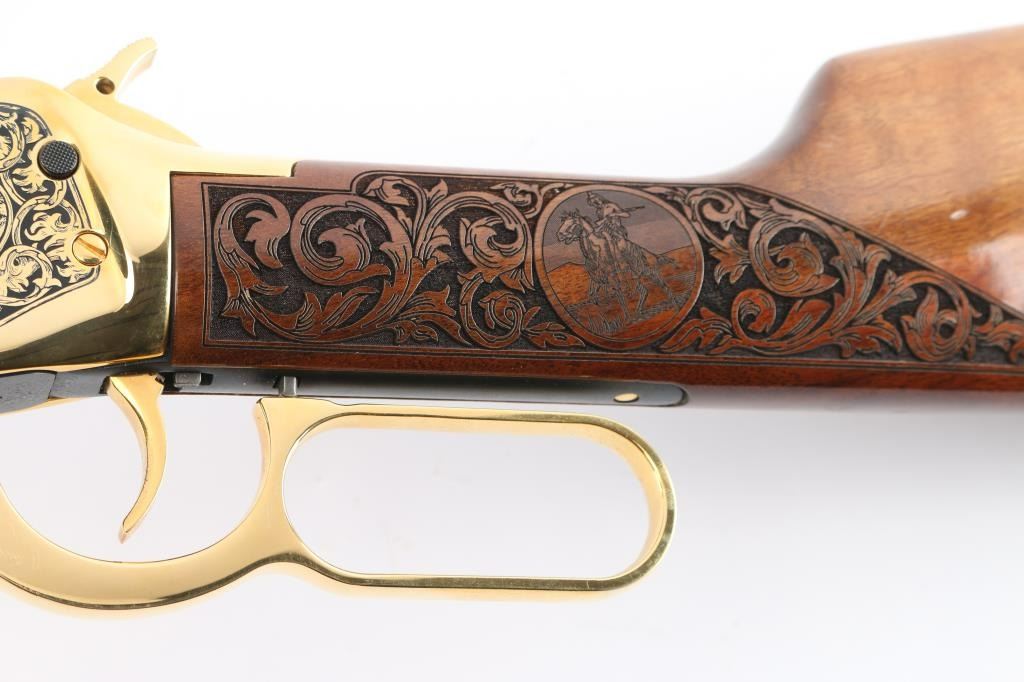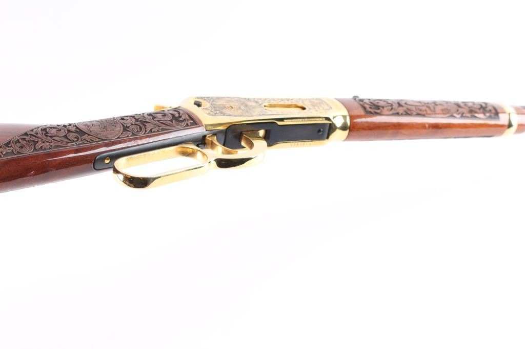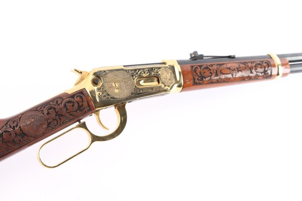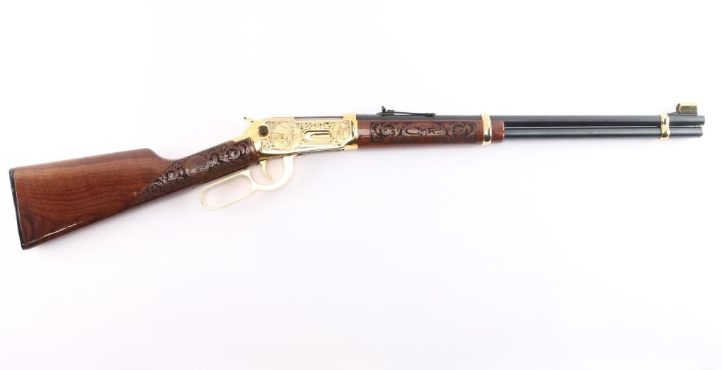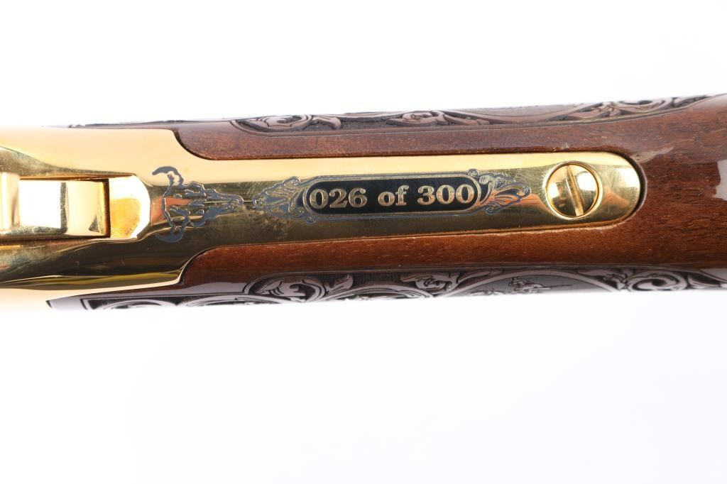 C. M. Russell Museum sanctioned Winchester Commemorative of Charlie Russell, America's western artist. Numbered 026 of 300. Excellent scenes of Russell's best western art works, his iconic trail skull logo along with his tributes in prose to the American west. Blued 20” barrel & full-length magazine tube with the majority of the remaining metal surfaces featuring a bright gold finish. Stocks are crafted of select walnut, are laser engraved with floral scroll & western scenes, and finished in high gloss. Rifle retains approximately 99% of its original finish showing superficial handling marks and a few light scratches. The action is sound, the bore is excellent and the walnut stocks are good with small blemishes & minor loss on the right side tip of the forend. Desirable and rarely encountered as museum patrons and art collectors "snapped them up" in original issuance.
