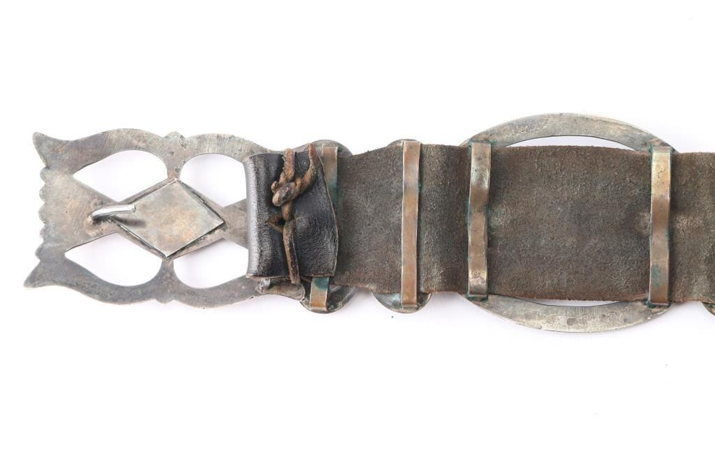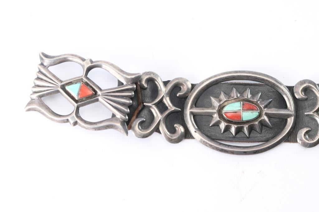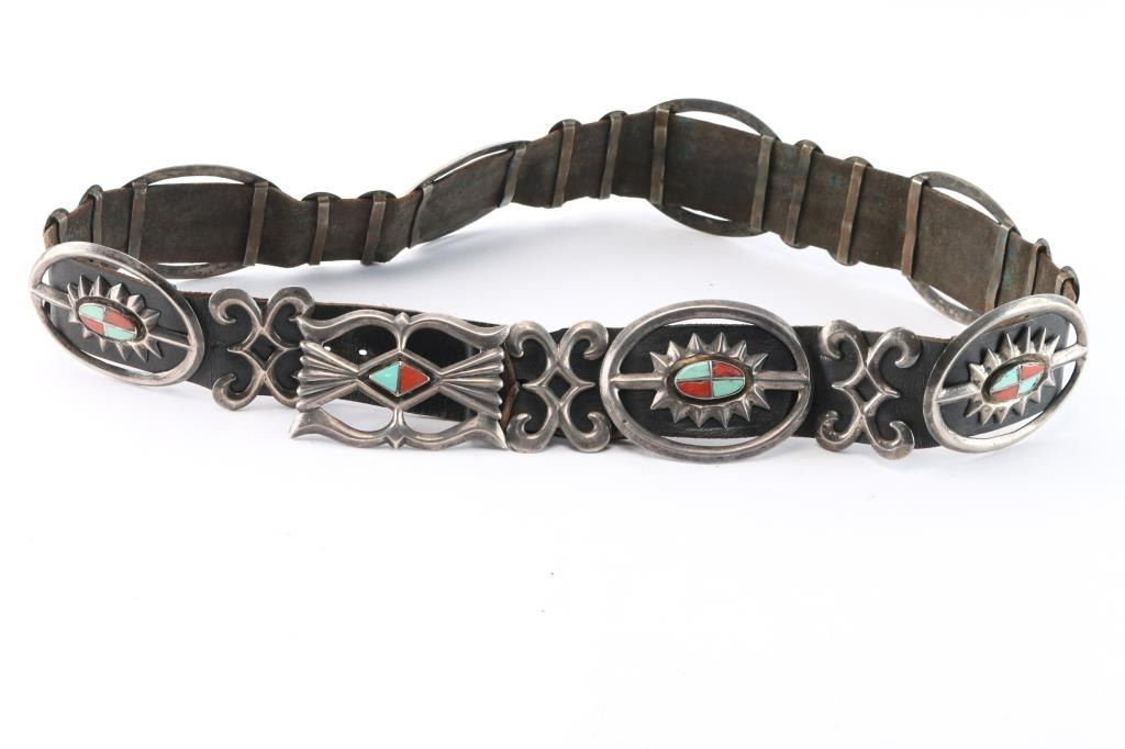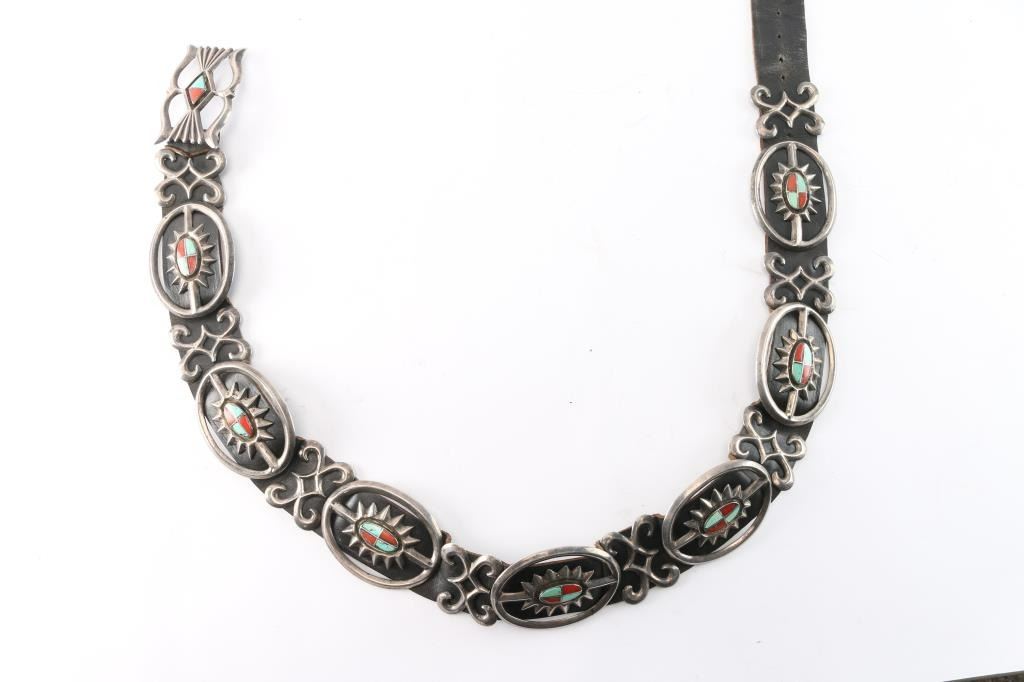 Seven beautiful 3" x 2 1/4" oval sterling silver sandcast conchos with center sun design inlaid with turquoise and coral interspersed with eight sterling silver sandcast designs. 3 1/4" sandcast sterling belt buckle has turquoise and coral at center. On well-worn 1 1/2" black leather belt. Measures 45" end to end.