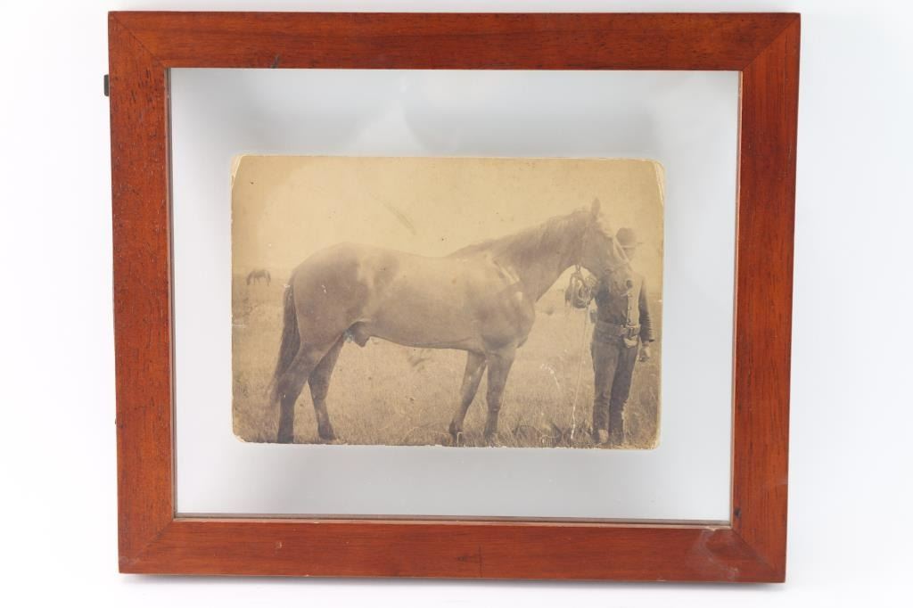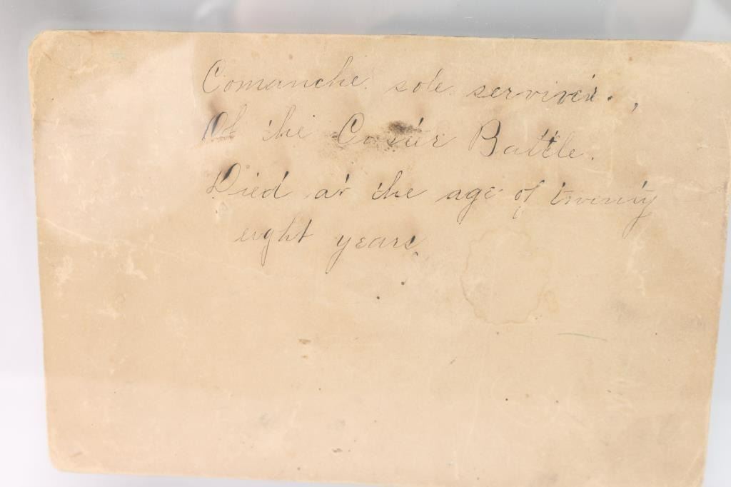 Of The Battle Of Little Big Horn. Photo measures 8" x 5 1/2" in double glass pane frame measuring 12 1/2" x 10 1/2". Back of photo states "Comanche sole survivor of the Custer Battle. Died at the age of twenty eight years.