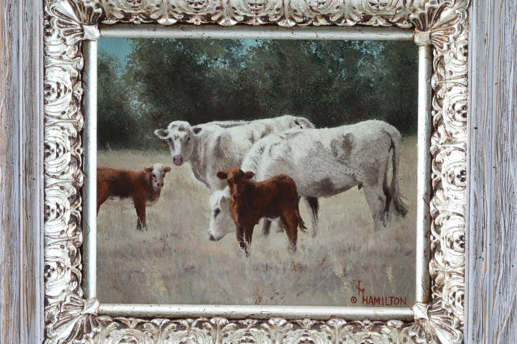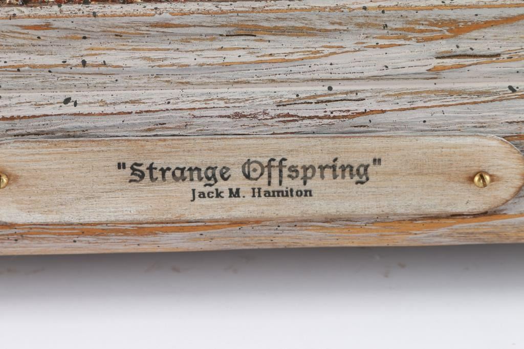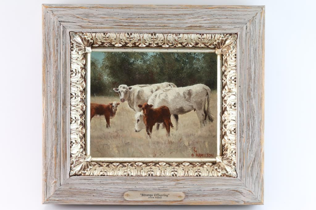 By Colorado artist, Jack M. Hamilton, entitled "Strange Offspring". Hamilton loved the outdoors, nature's wildlife and American history. He spent years watching, studying and photographing his favorite subjects, often from his working cattle ranch in southern Colorado. Painting on both canvas and panel, Jack worked entirely in the medium of oil. Self-taught, Jack painted in the manner of the old masters. Hamilton was exhibited at many of the country's finest galleries and at many fine art shows. His work has been featured on the cover of, as well as in, national magazines. Measures 10" x 12".