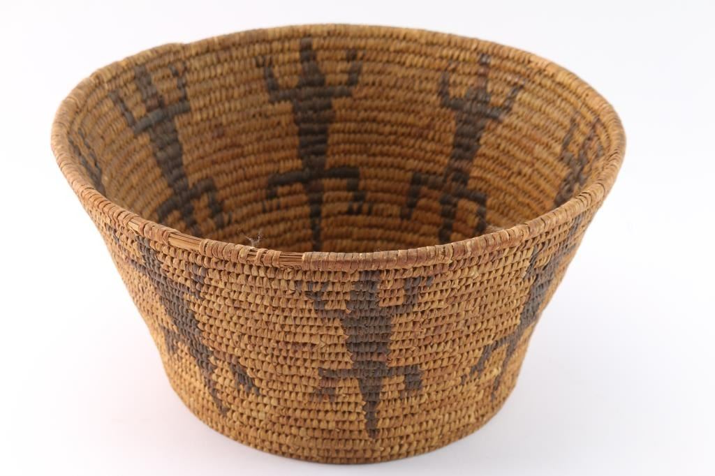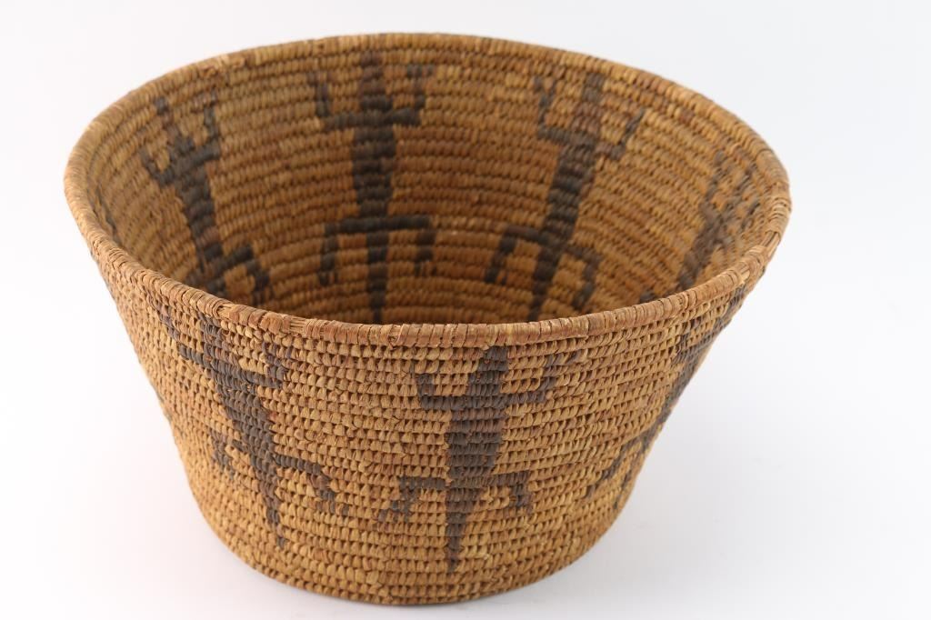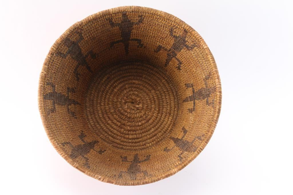 Flat bottom basket measures 12"x16". Fair condition, edge wear and losses.