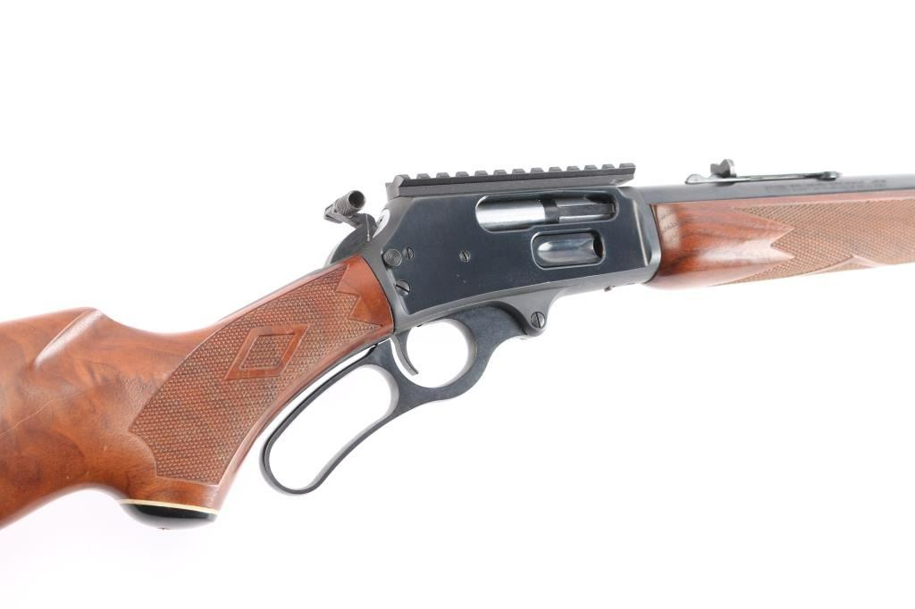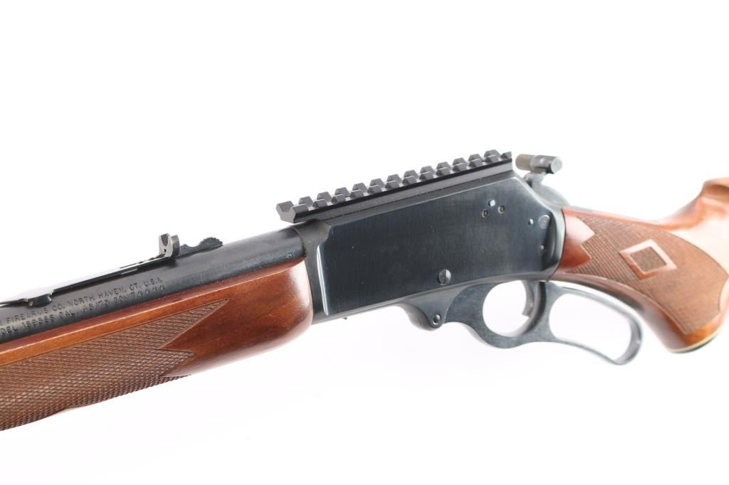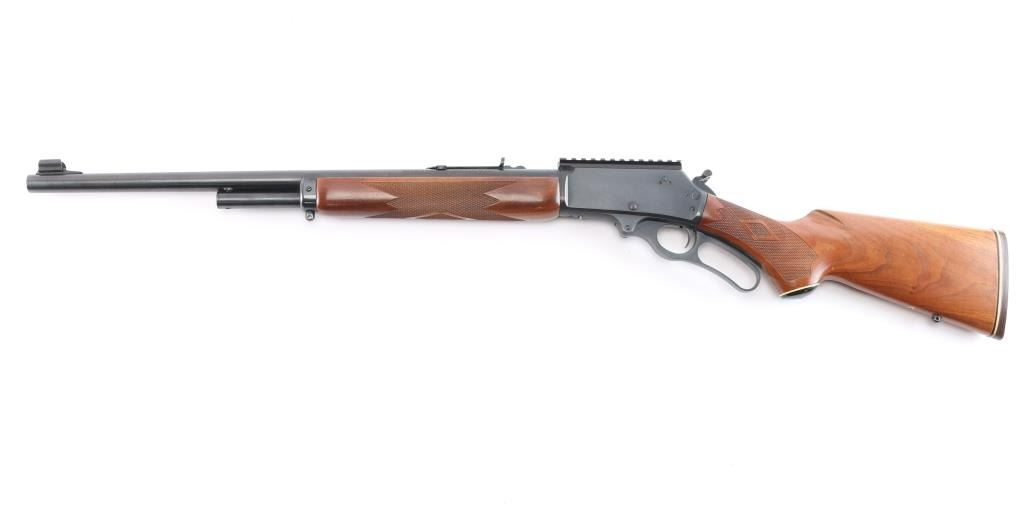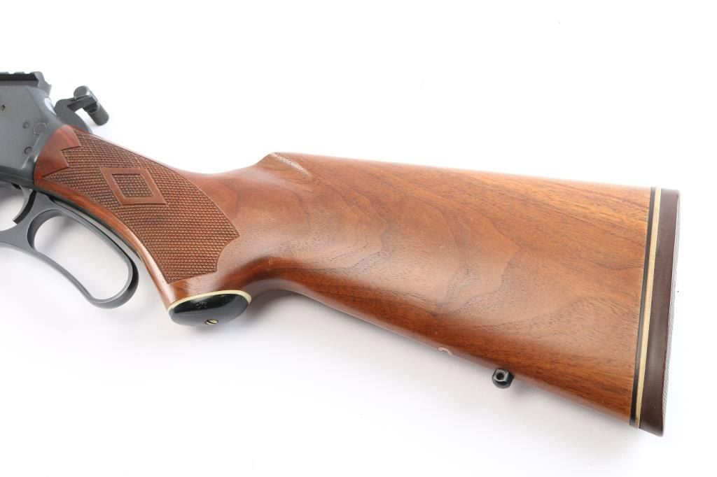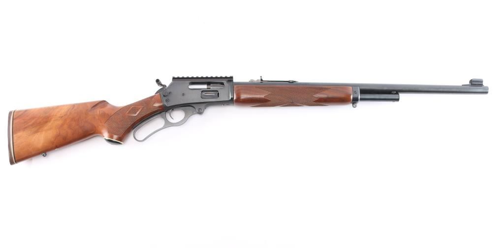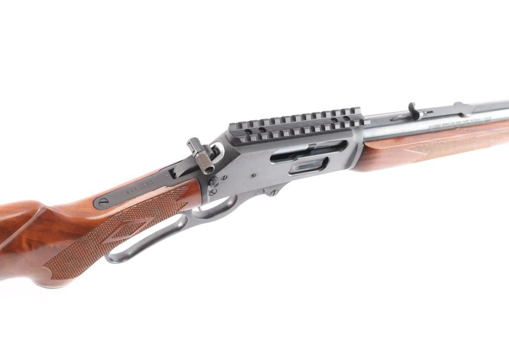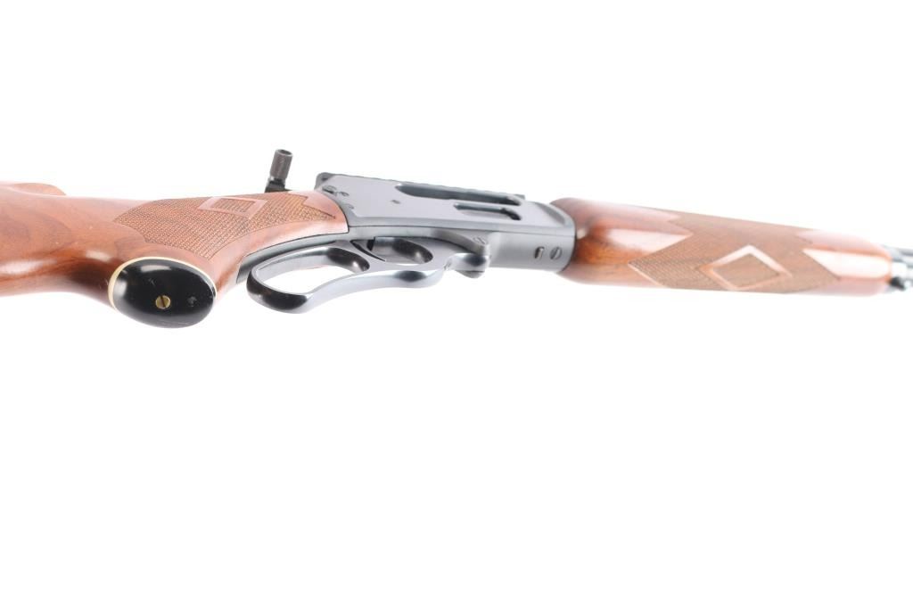 Big Bore lever action rifle. Features blued finish, checkered walnut furniture, curved wrist & lever, factory thin rubber butt pad, 22" barrel, half length mag tube, hooded blade front sight, rear sporting sight, sling studs, Picatinny rail base affixed to receiver top. Bore is bright. Retains 95% finish with few handling marks. Wood is near excellent, has beautiful grain.
