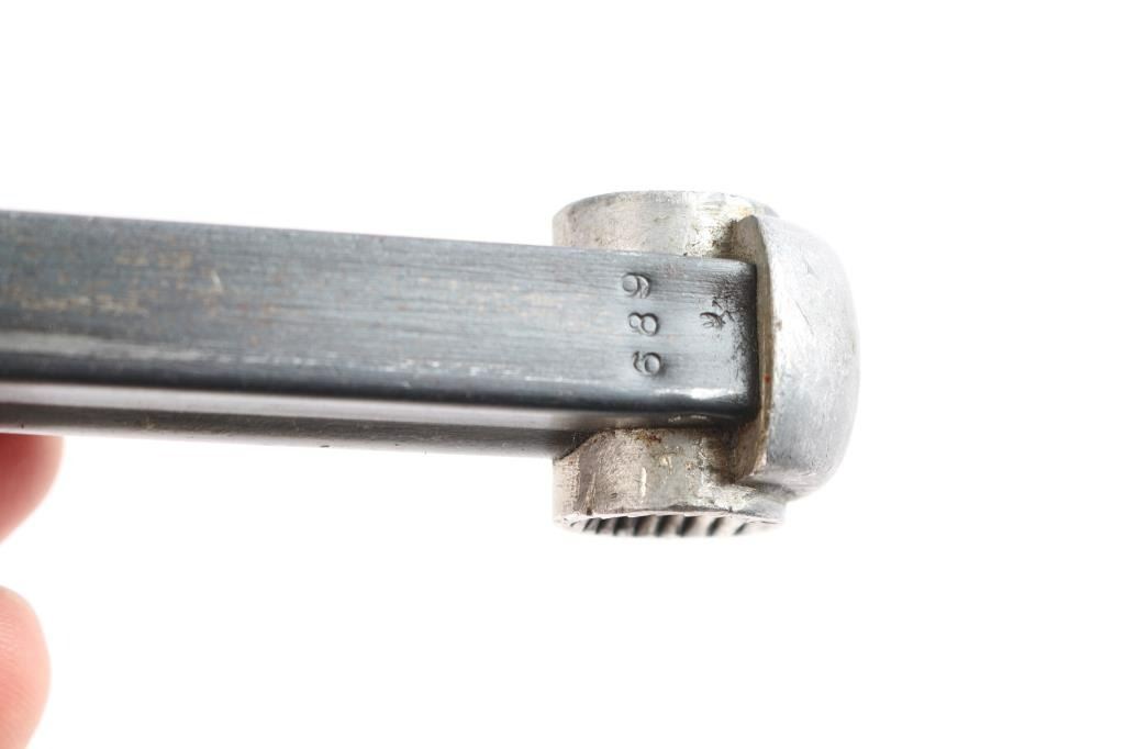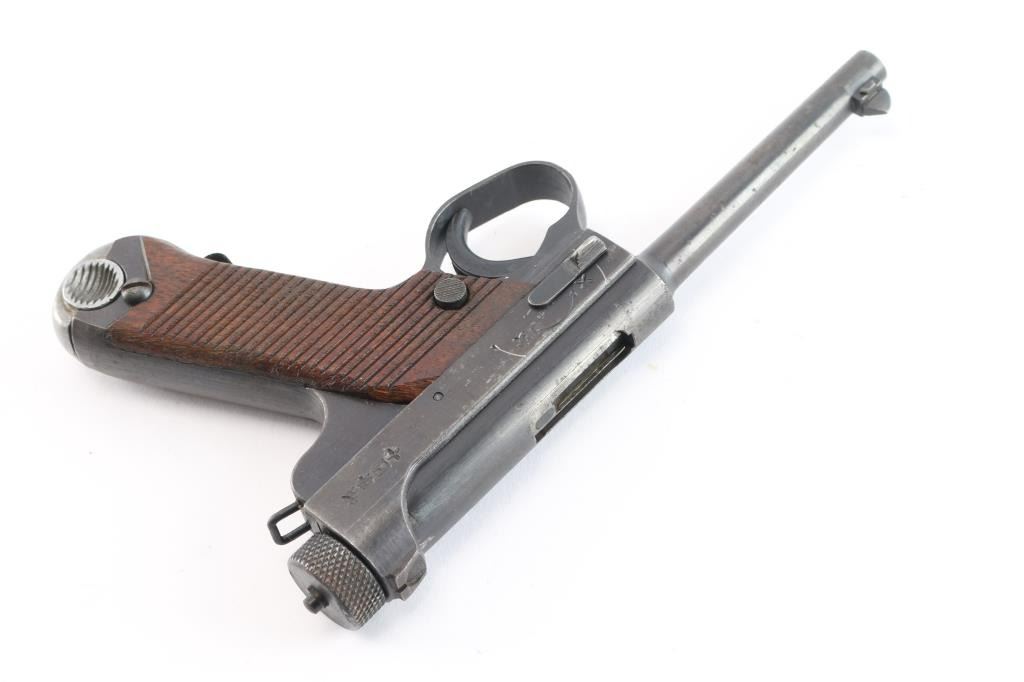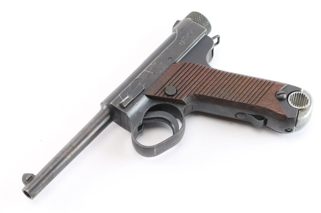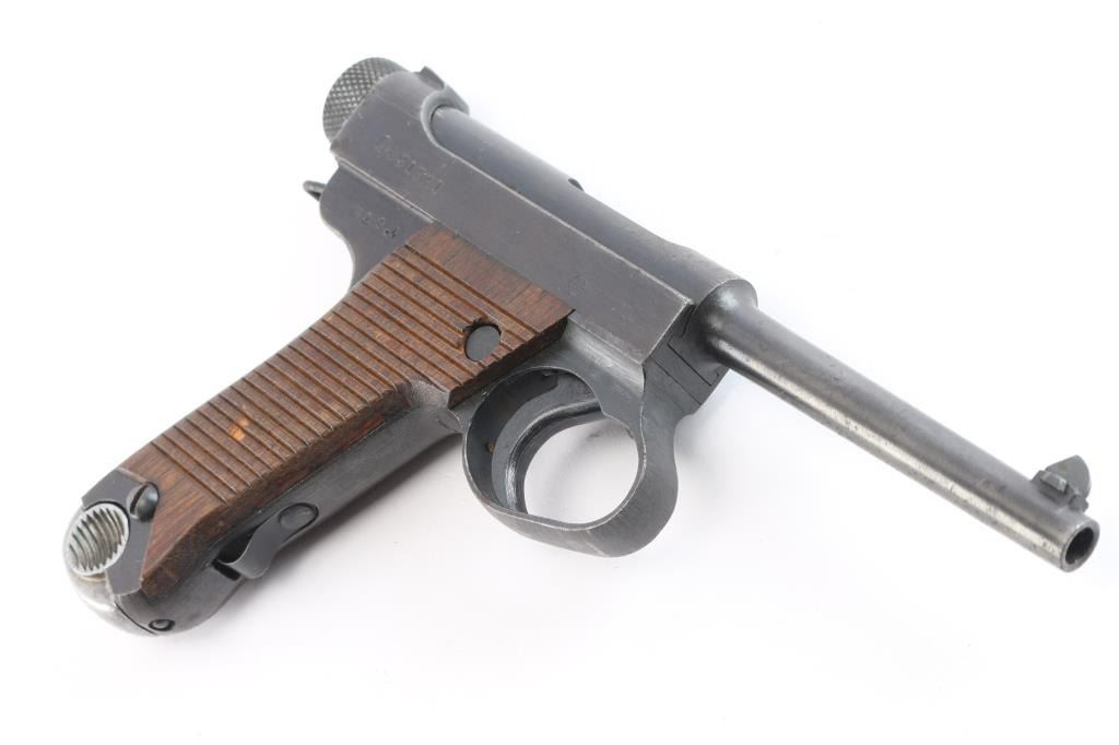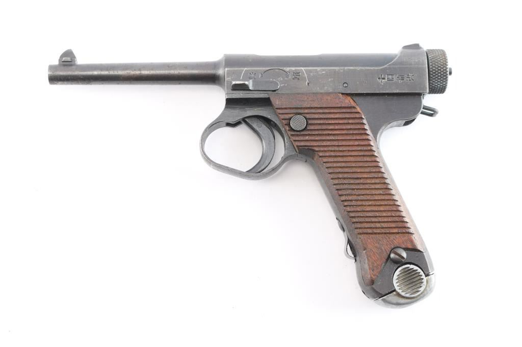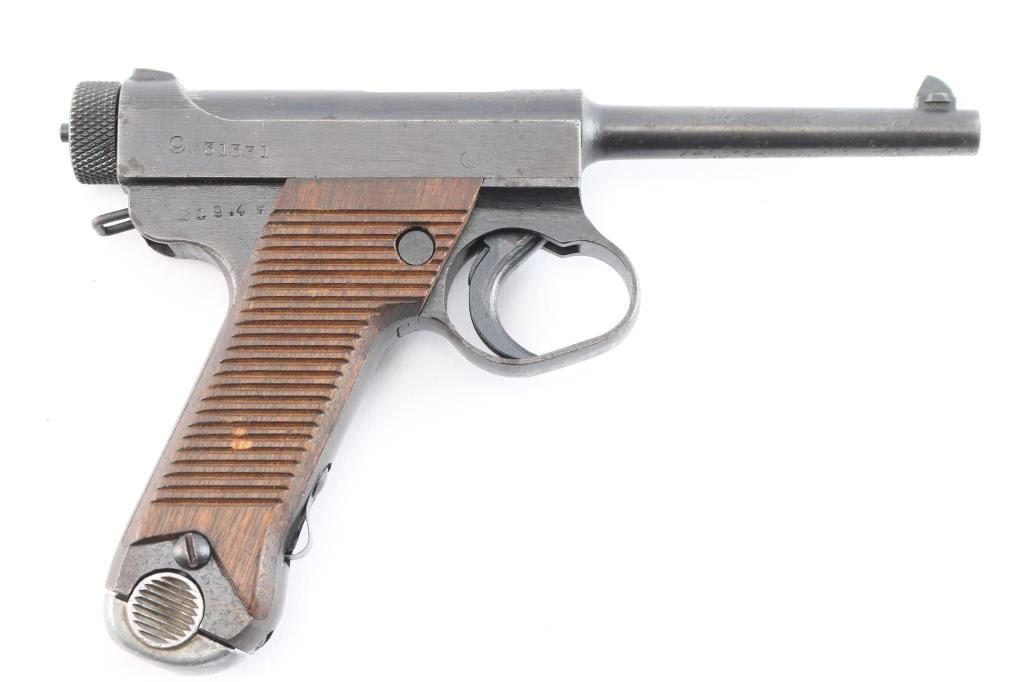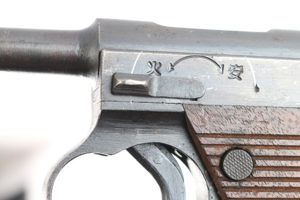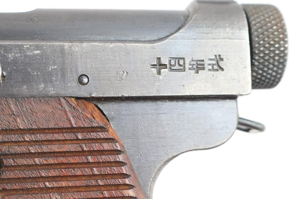 'Second Series' WWII era Japanese military striker fired semi-automatic service pistol chambered in 8mm Nambu. Dated 19.4 (April, 1944) "Type 14" in Japanese stamped on the left frame. Features a blued finish, 4.6" barrel, dovetailed inverted 'v' front sight, fixed square notch rear sight, rounded trigger, large trigger guard, Magazine retention spring on fore strap, knurled grooved cocking piece, manual safety on the left side of the frame, magazine disconnect safety, push button magazine release, 8 round magazine with aluminum base plug, steel frame with lanyard loop on the rear and grooved wood grips Matching serial number on trigger. No import marks observed, bring back. Bore has visible rifling with scattered light pitting. Retains about 85% dull blue finish showing edge losses, minor scratches, feint drag line on the frame from the safety lever and some very light scattered pitting. Grooved grips are very good condition with scratches. Markings are clear and readable. Magazine is very good condition, numbered "689".