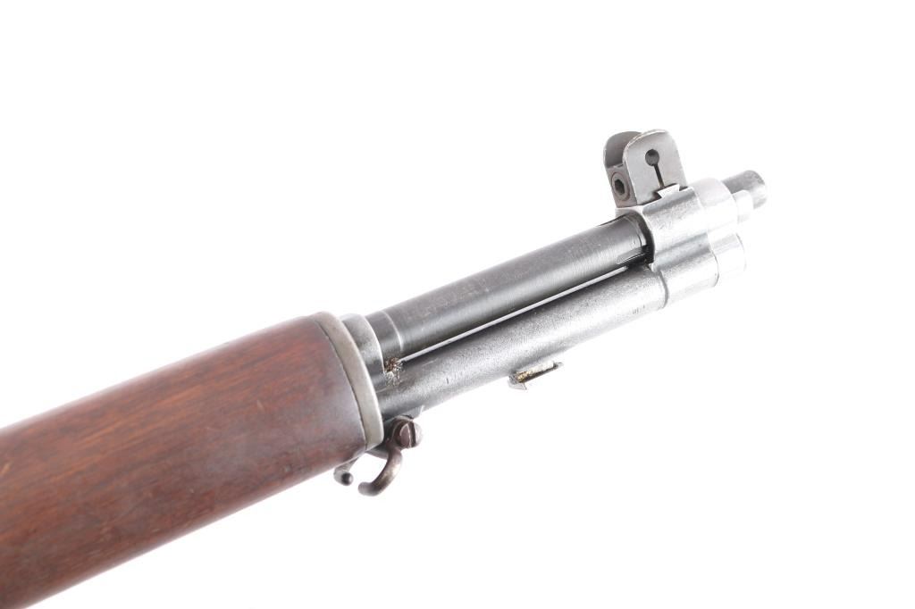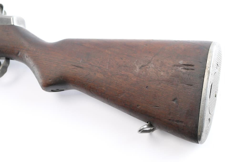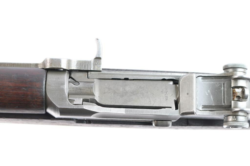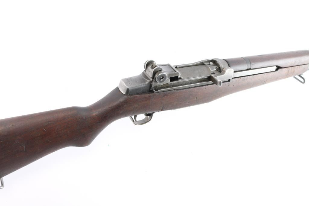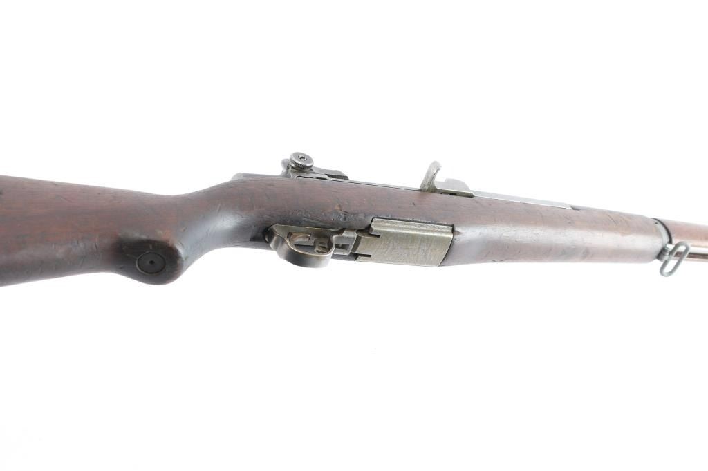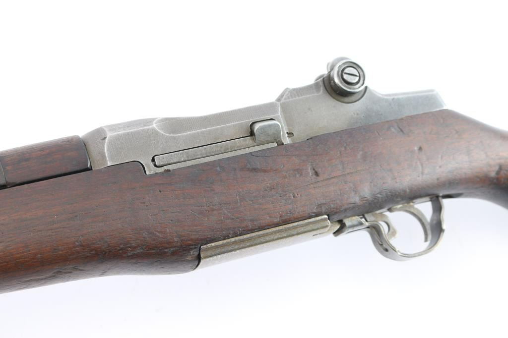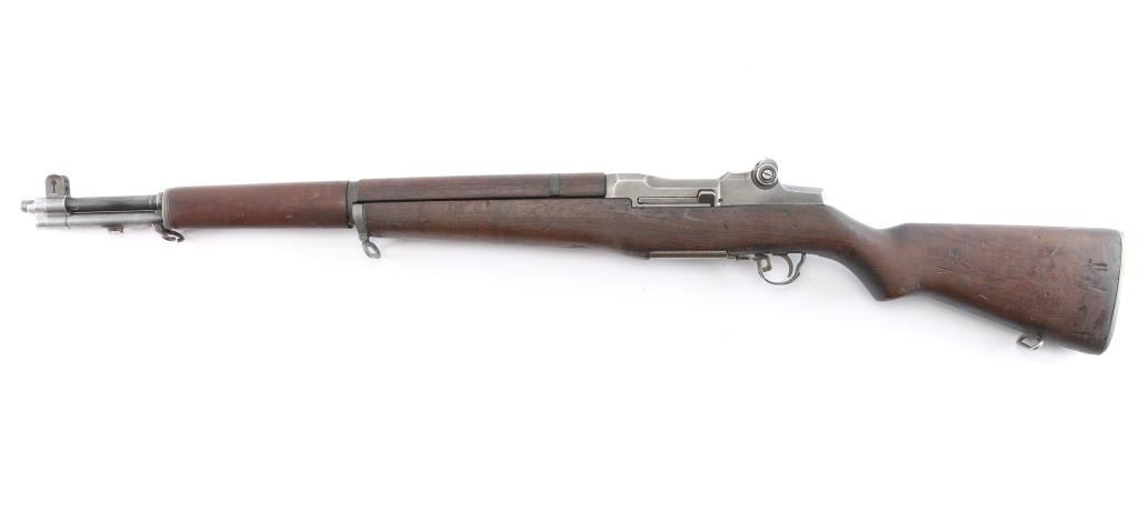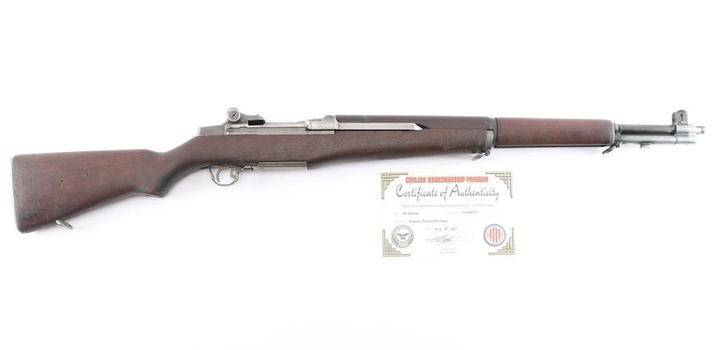 US military semi-automatic rifle, manufactured circa 1943. The workhorse rifle of the US military in WWII and beyond. Features parkerized finish, walnut stock & hand guards, 24" barrel, adjustable sights with protected front blade & protected rear peep, fixed magazine for en-bloc clip, manual safety. Trigger guard has stamped style trigger guard. Barrel marked "3 SA 2 45". Bolt marked "D28287-12SA W9B". Rear sight marked "W" in hexagon. "WRA" observed on hammer. "SA" marked trigger housing. Bore is shiny/bright. Various metal parts show different shades of parkerized finish, 80% coverage, thinning from handling. The wood is good or better condition with scratches and gouges, "P" in circle on bottom of wrist, circular cut depression to bottom of grip, stamped numbers on bottom of butt. Includea a CMP COA.