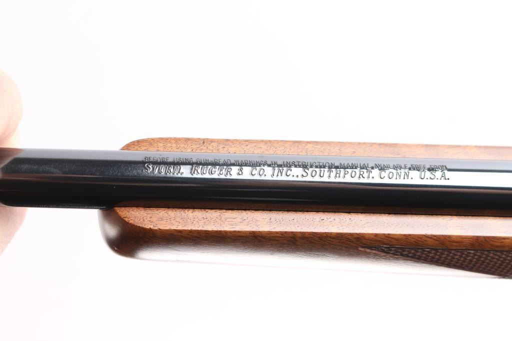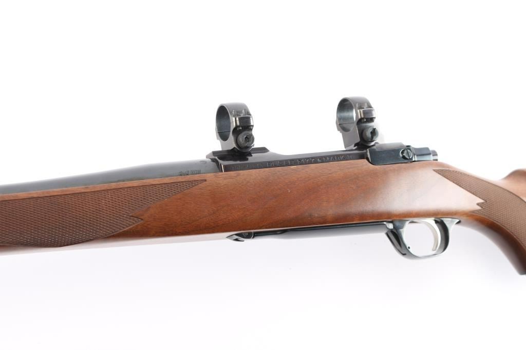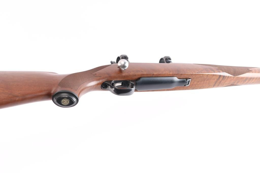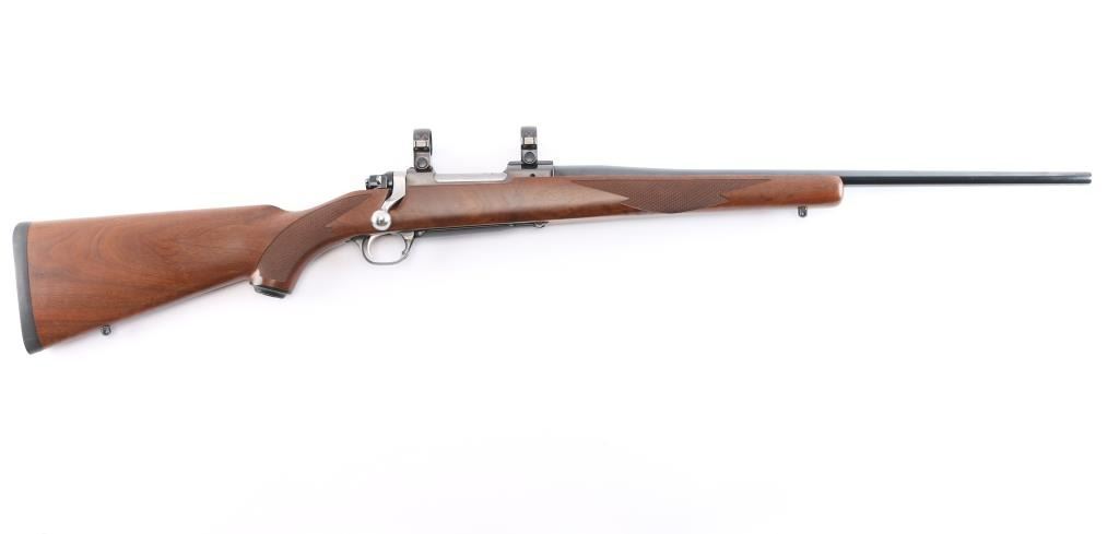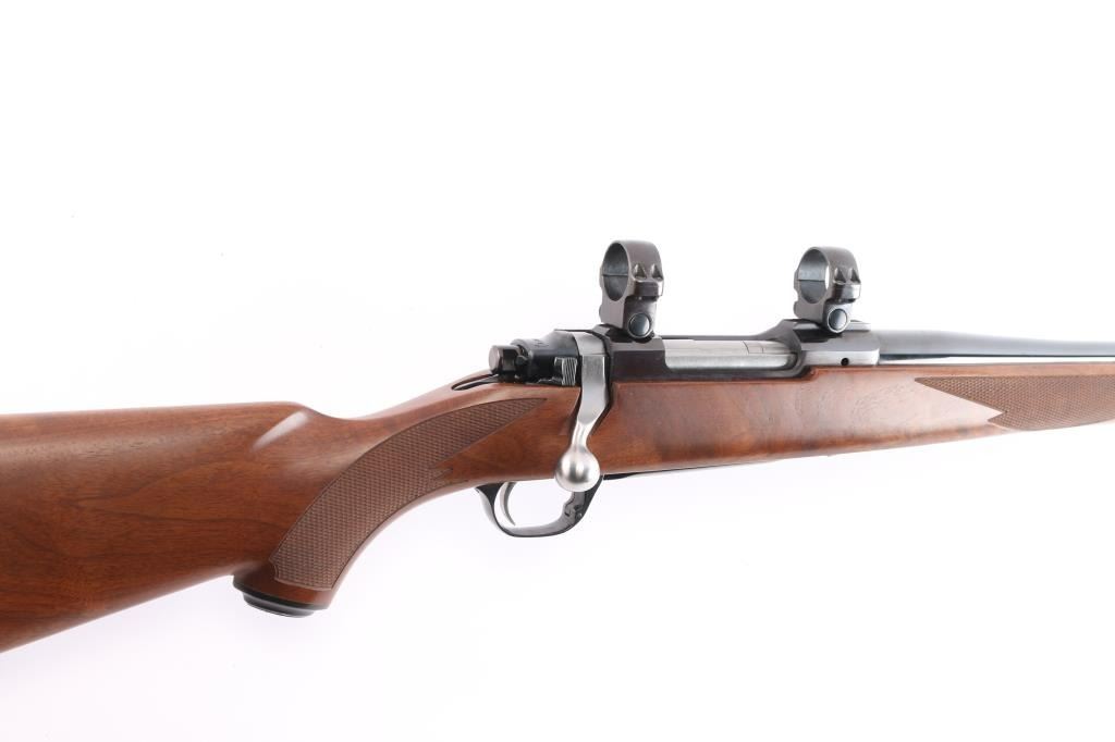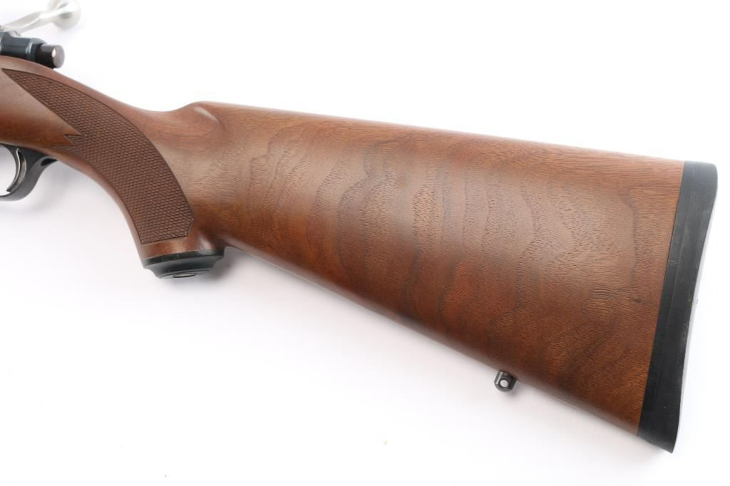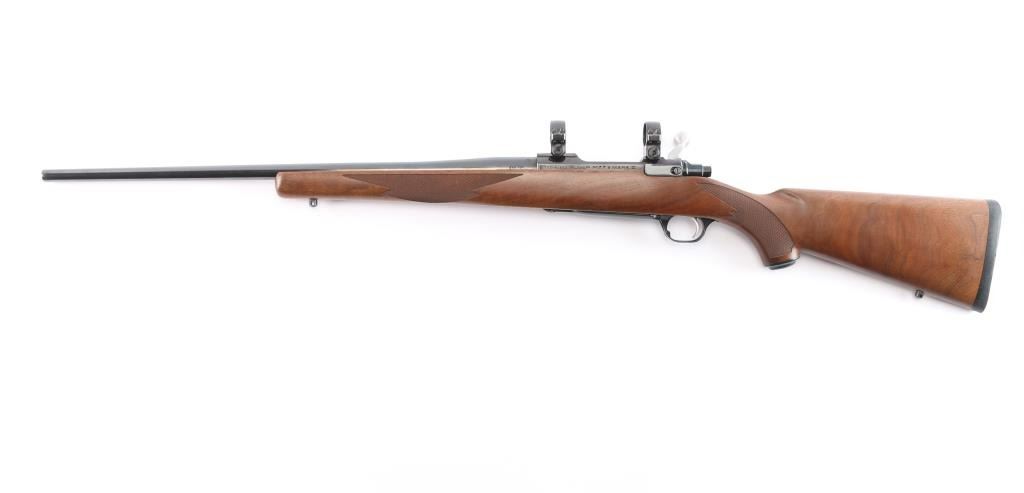 Bolt action rifle manufactured in 2003, features: blued finish, brown & tan laminate stock, checkered at wrist and forearm, 22" barrel, no provisions for sights, plum colored receiver, hinged floorplate, smooth stainless steel curved trigger, three position safety on stainless steel bolt, Mauser style bolt release, sling swivel studs, factory solid rubber recoil pad and black plastic grip cap with Ruger logo, scope rings attach to scalloped receiver dovetails. Bore is pristine. Retains approx. 99% finish with no visible losses and or handling marks. Wood is excellent. Condition is NRA Excellent/Like New. ***Modern Firearm***.