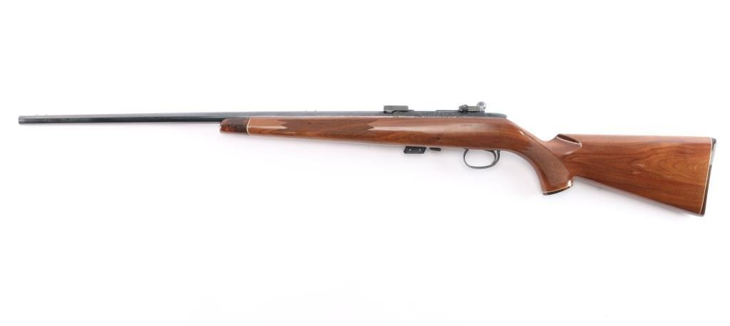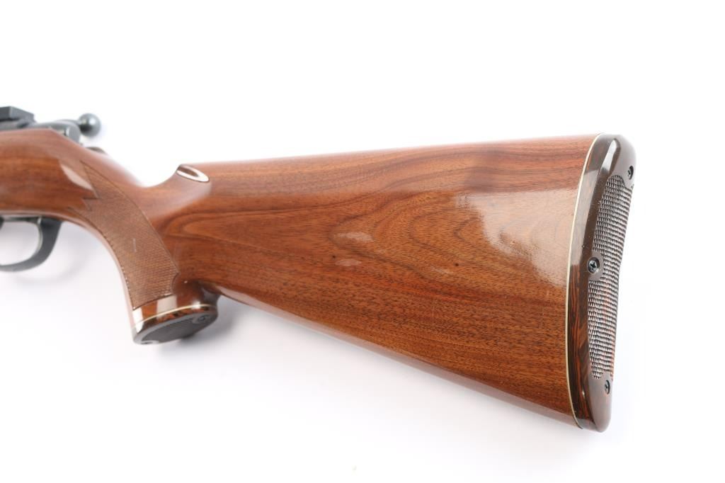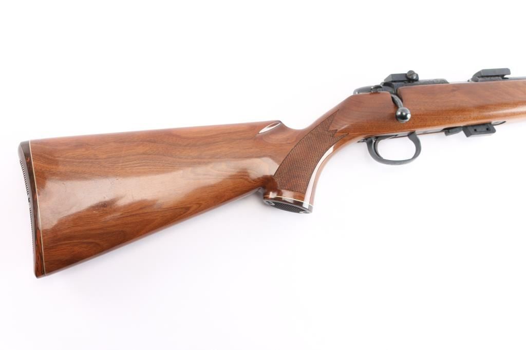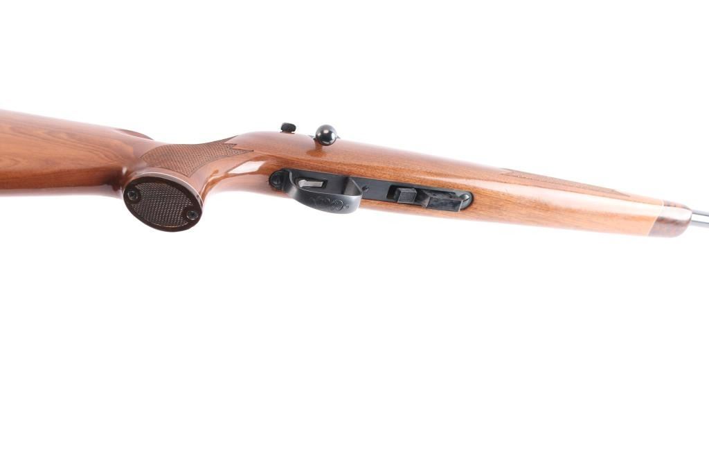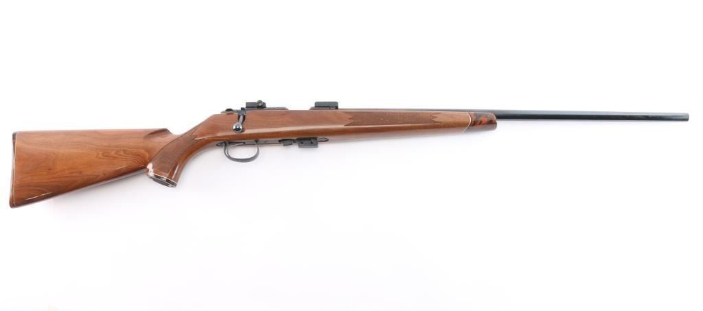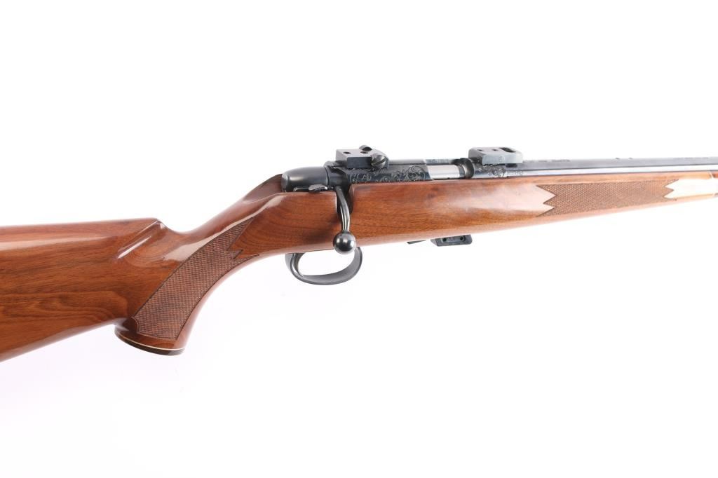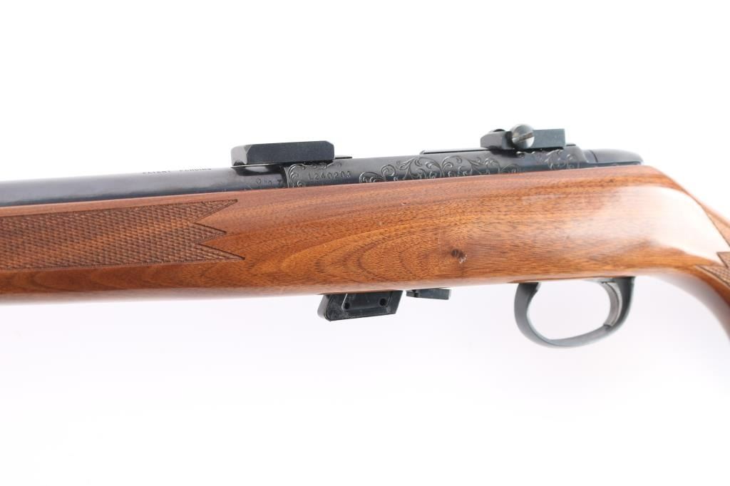Sn: #1240203. High quality magazine-fed bolt-action rifle chambered in .22 Short/Long/Long Rifle ammunition. Considered to be, "One of the finest shooting rim fire sporters ever made". Features blued finish, 24" barrel is drilled and tapped for sights, grooved rail receiver is drilled & tapped for mounting optics, floral scroll engraved receiver and trigger guard. Beveled smooth curved trigger, manual safety on right rear of receiver and a detachable 5rd polymer magazine. Walnut pistol grip shoulder stock has checkering at the wrist and forearm, a high gloss finish with faux burl wood forend cap, grip cap & buttplate, all have white accent spacers. Grip cap and butt plate are checkered. Leupold scope mounts attached. Bore is very good/slightly dirty. Retains approx. 90% finish with slight thinning on barrel with minor handling marks. Wood is near excellent with a couple of shallow dents. Condition is NRA very good. *** Modern Firearm ***