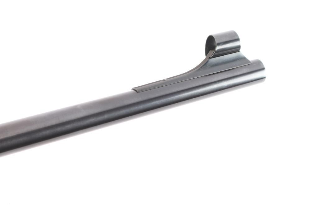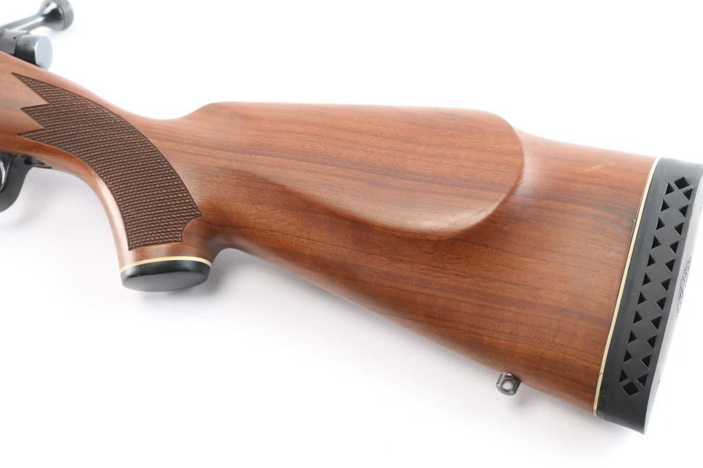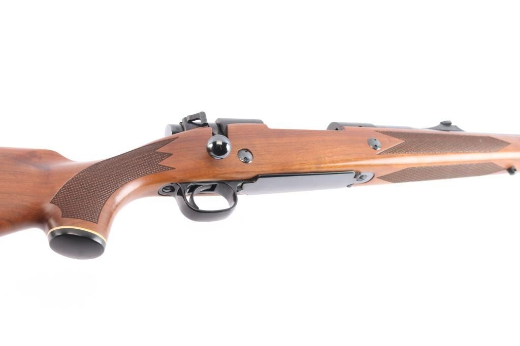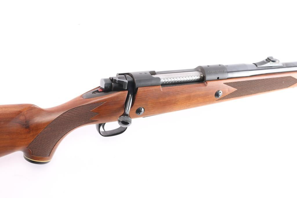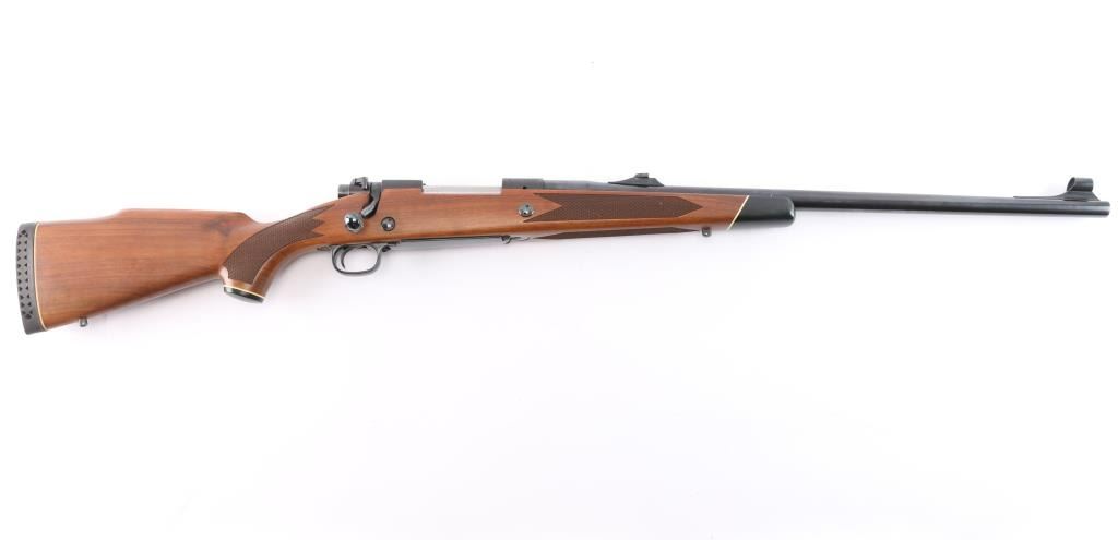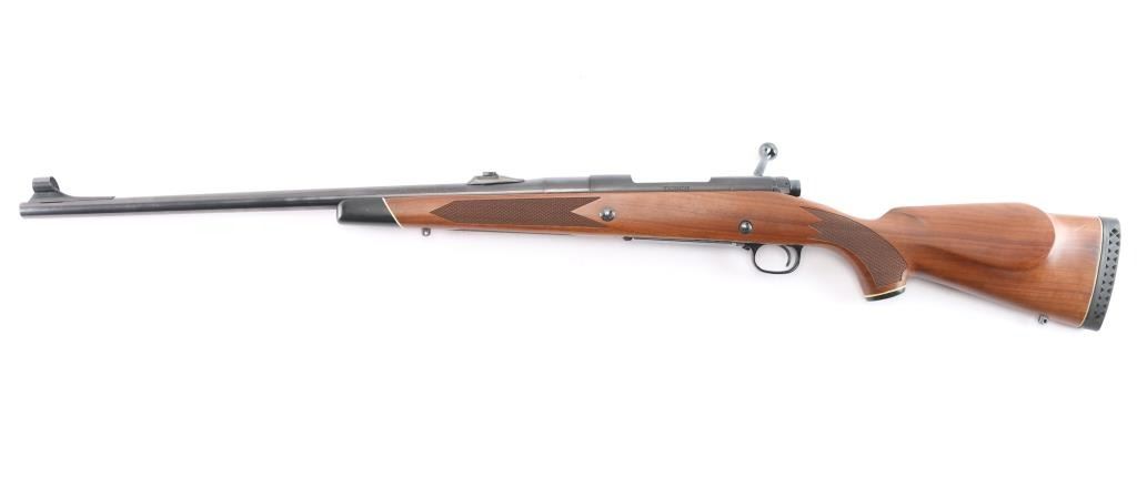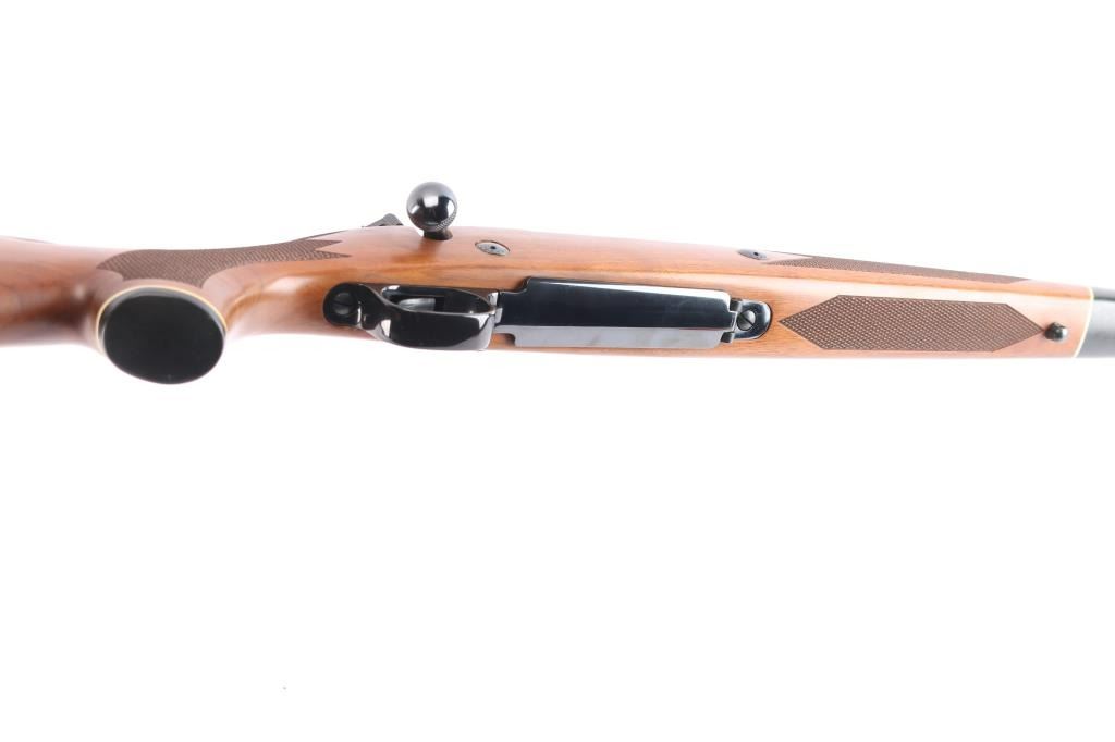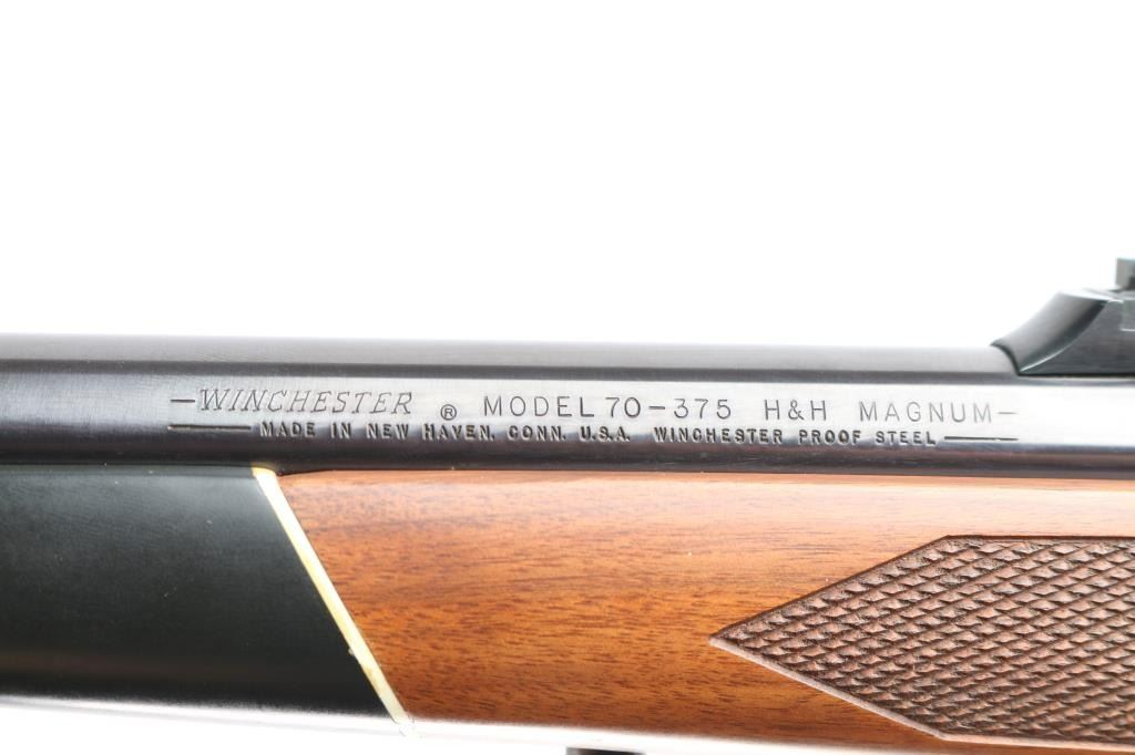 'Classic' Bolt action rifle chambered in .375 H&H Magnum, circa 1977. Features blued finish (bright polished blue on most metal, receiver is matte blue), walnut stock with checkered panels at wrist & forend, right hand cheek piece, black capped forearm and grip with white spacers, sling swivel studs and vented black rubber recoil pad, 24" tapered barrel with hooded serrated ramp front blade/bead front sight and adjustable sporting rear folding rear sight, dual steel recoil cross bolts, receiver drilled and tapped, jeweled bolt with knurled knob, hinged floorplate, three position safety. Bore is excellent with very strong rifling, slightly dirty. Retains approx. 95% finish with no visible marks or edge loss. Wood is excellent. Action is smooth.