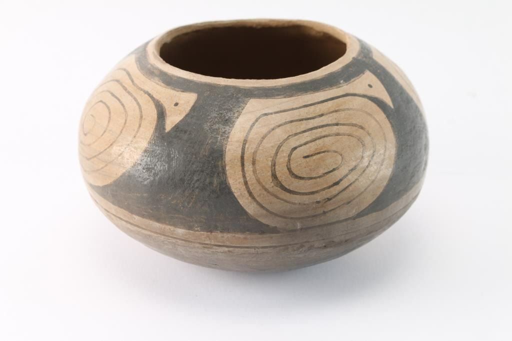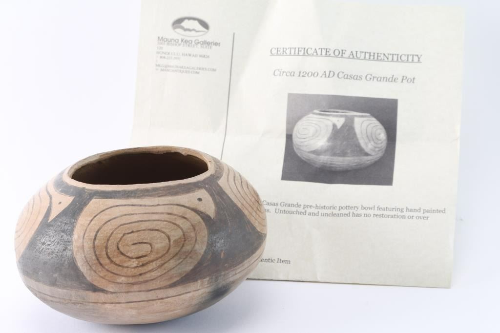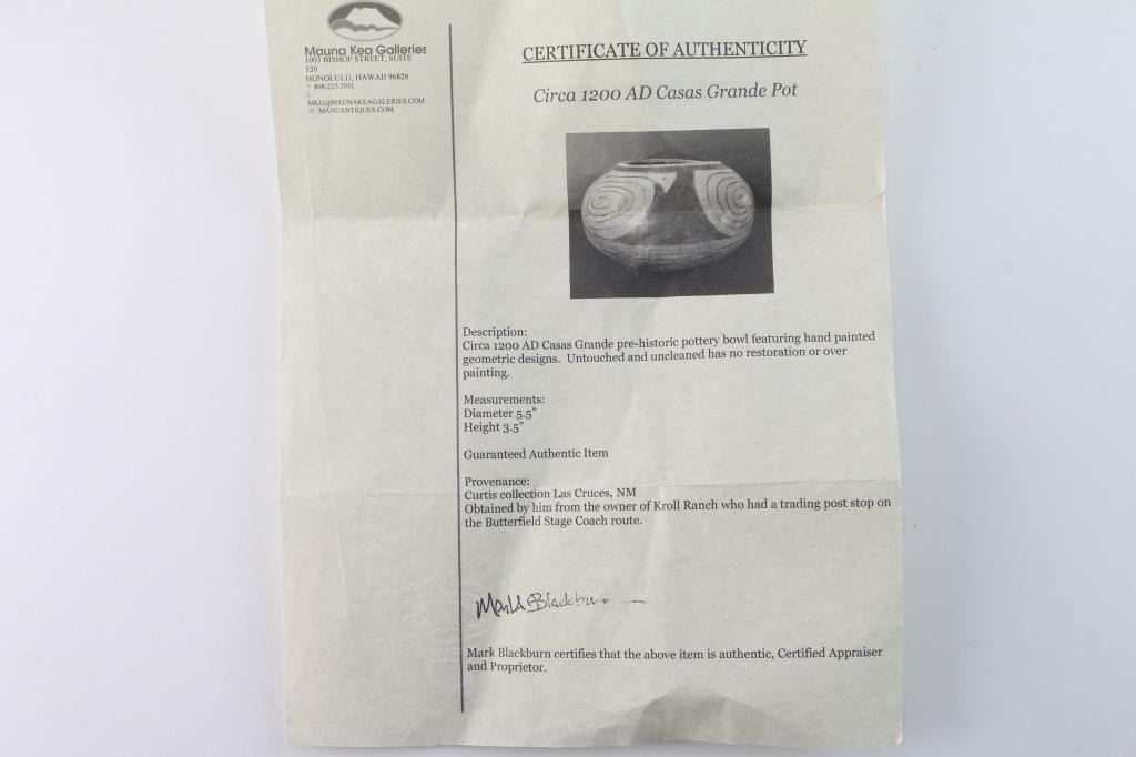 Circa 1200 A.D., measures 5.5" diameter and 3.5" height. Certificate of authenticity from Mauna Kea Gallery in Honolulu, Hawaii. Provenance: States Curtis Collection, Las Cruces, NM to Kroll Ranch Trading Post on Butterfield State Route. Guarantee of Authenticity signed Mark Blackburn. Condition: untouched adn uncleaned, no restoration, near fine.