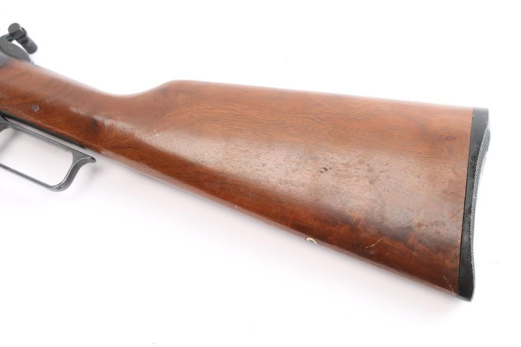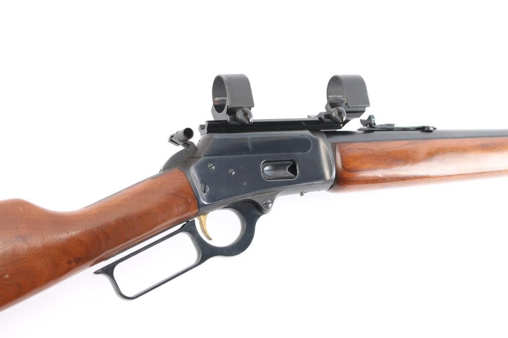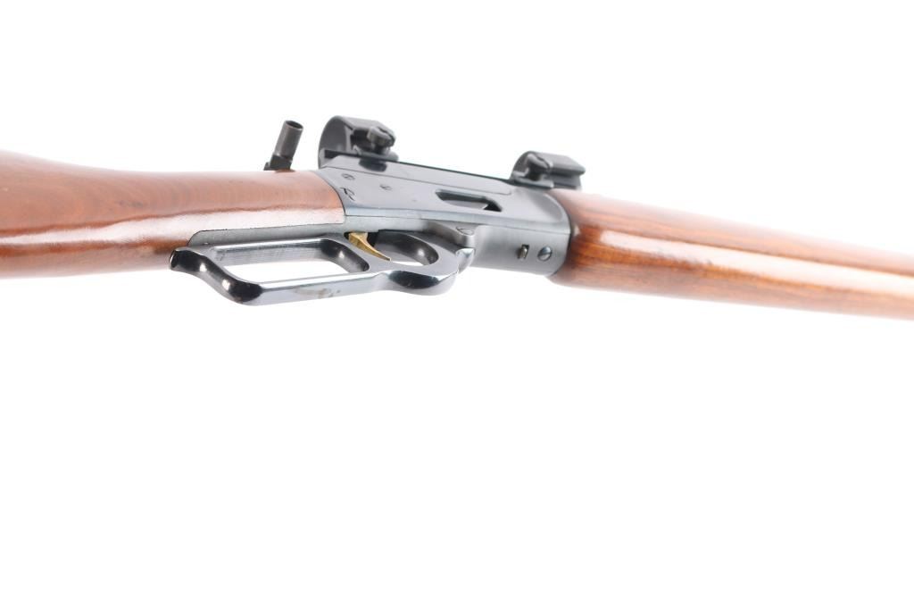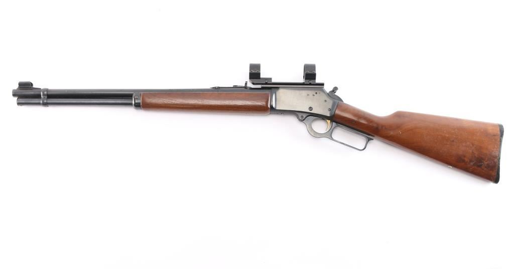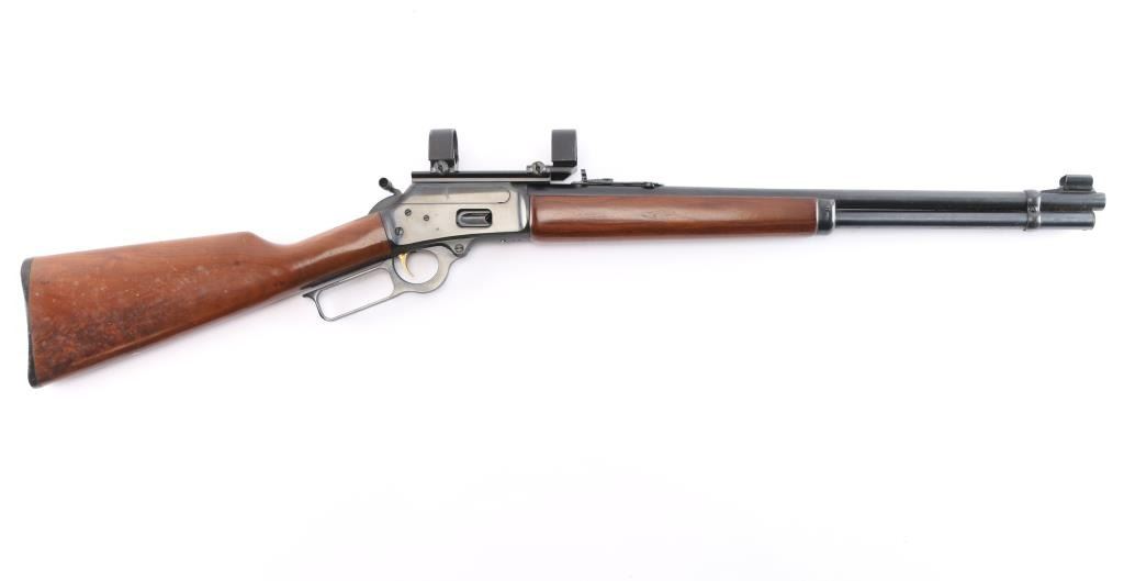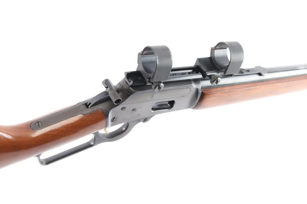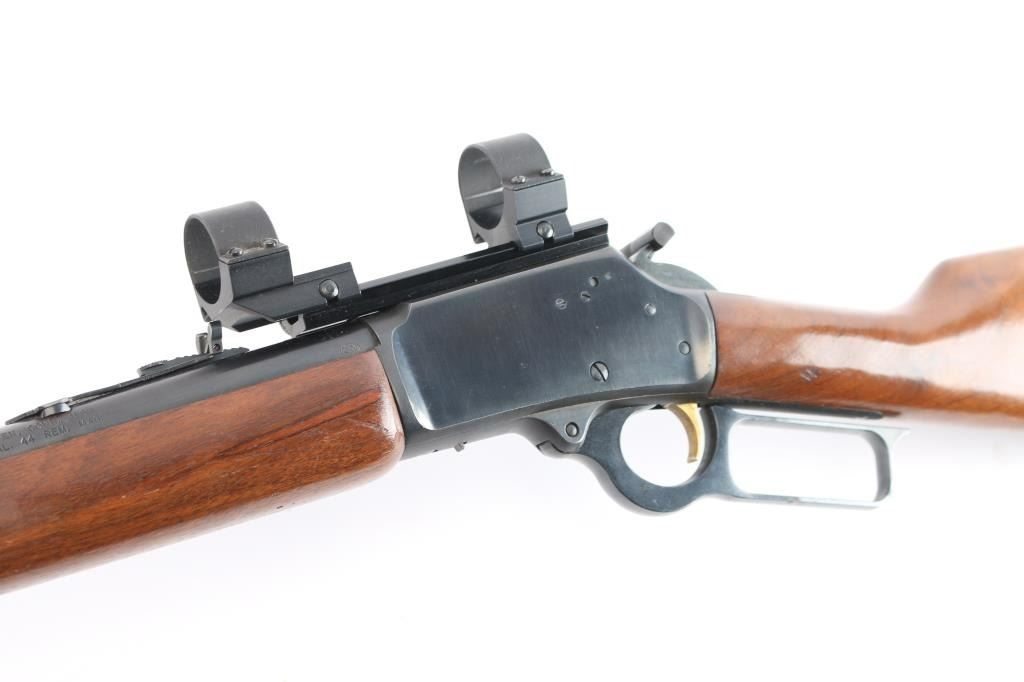 Lever action rifle chambered in 44 Remington Magnum. Features blued finish, smooth walnut furniture, straight wrist & lever, 20" barrel, full length mag tube, sporting sights, Weaver rail affixed to receiver top with scope rings (no scope). Bore is bright. Retains 85% finish with edge losses, several bare spots on mage tube and barrel band. Wood is very good with minor handling marks.