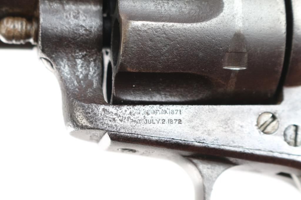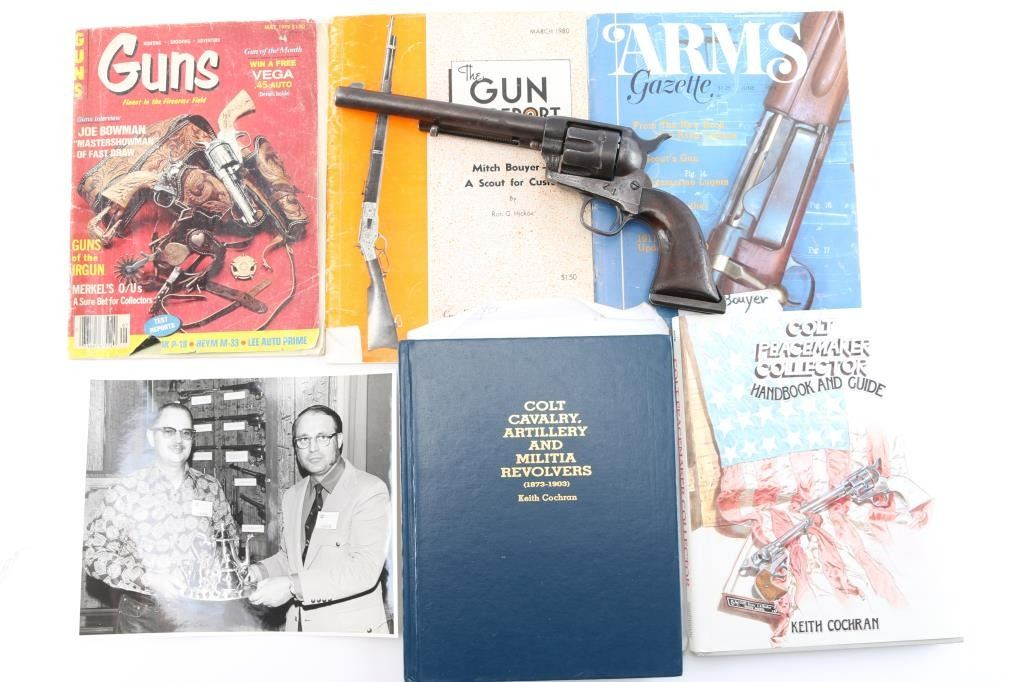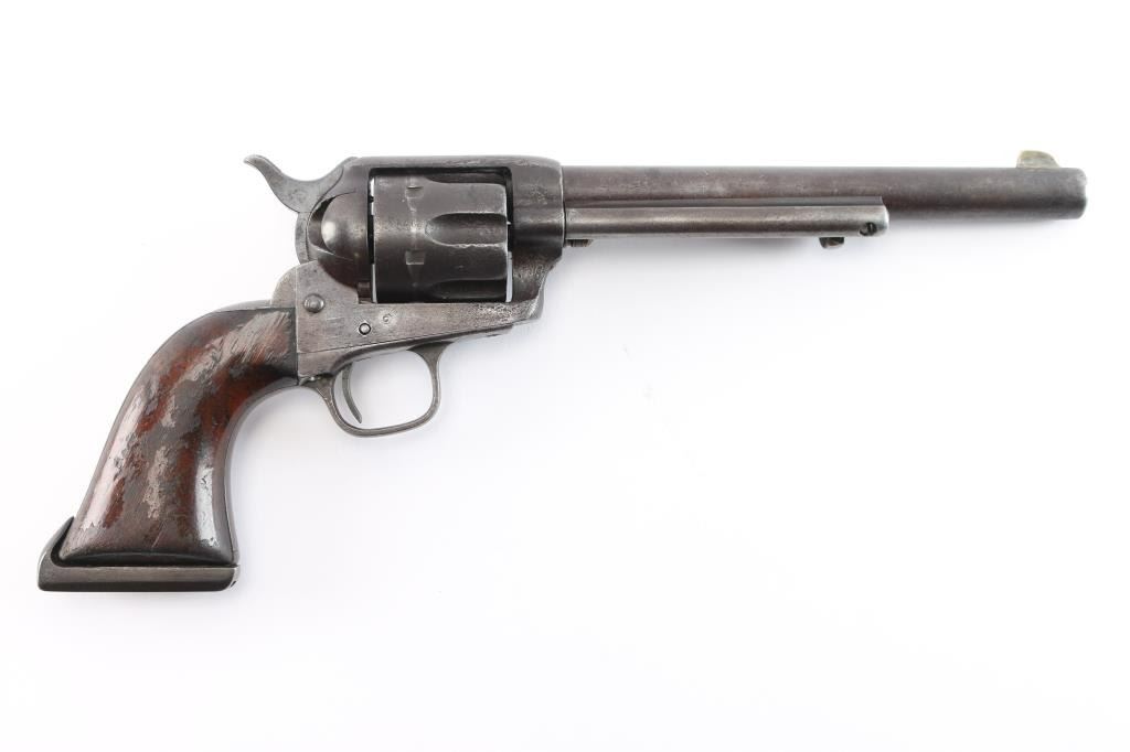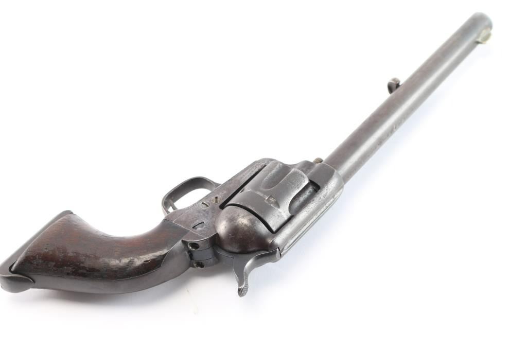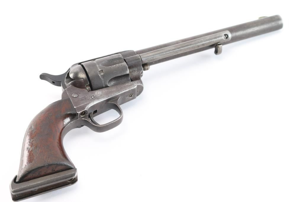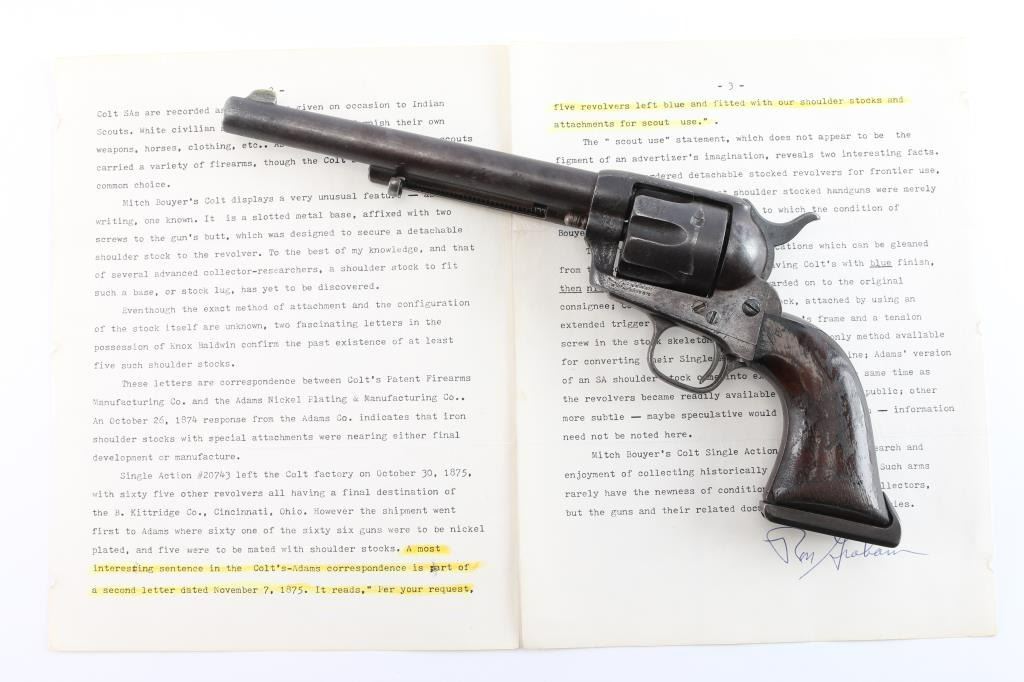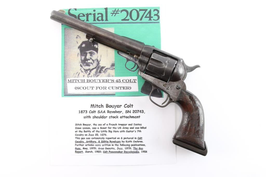 Colt S. A. Army Revolver Serial #20743, with period shoulder stock attachment screwed into butt and extensive research history and publication provenance as to ownership and use by "Mitch Bouyer", scout for Custer, killed at the Battle of Little Big Horn June 25, 1876. The subject revolver shows a dark brown patina finish with scattered rust and erosion and some pitting. Markings are legible and visible numbers matching. The grips show strong traces of varnish along with "weathering" from exposure to the elements. Hammer and small parts are all early except ejector rod head which is a slightly later Colt part. The bottom of the grips show Boyer's name and 7 CAV carved into wood. Provenance: Colt Cavalry, Artillery and Militia Revolvers by Keith Cochran where it is prominently featured; Colt Peacemaker Encyclopedia; "A Scout's Colt" by Ron Graham, ink signed by him detailing this Colt; Guns Magazine May 1979; Arms Gazette June 1979; Gun Report March 1980, The Collection of Mr. Knox Baldwin, Head of Tennessee National Guard and prominent Colt collector to several major Colt collectors in the Western U.S.A. Description by John R. Gangel aka "Little John".