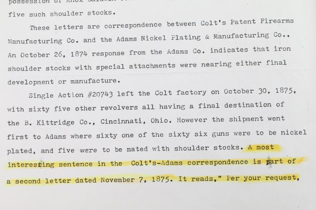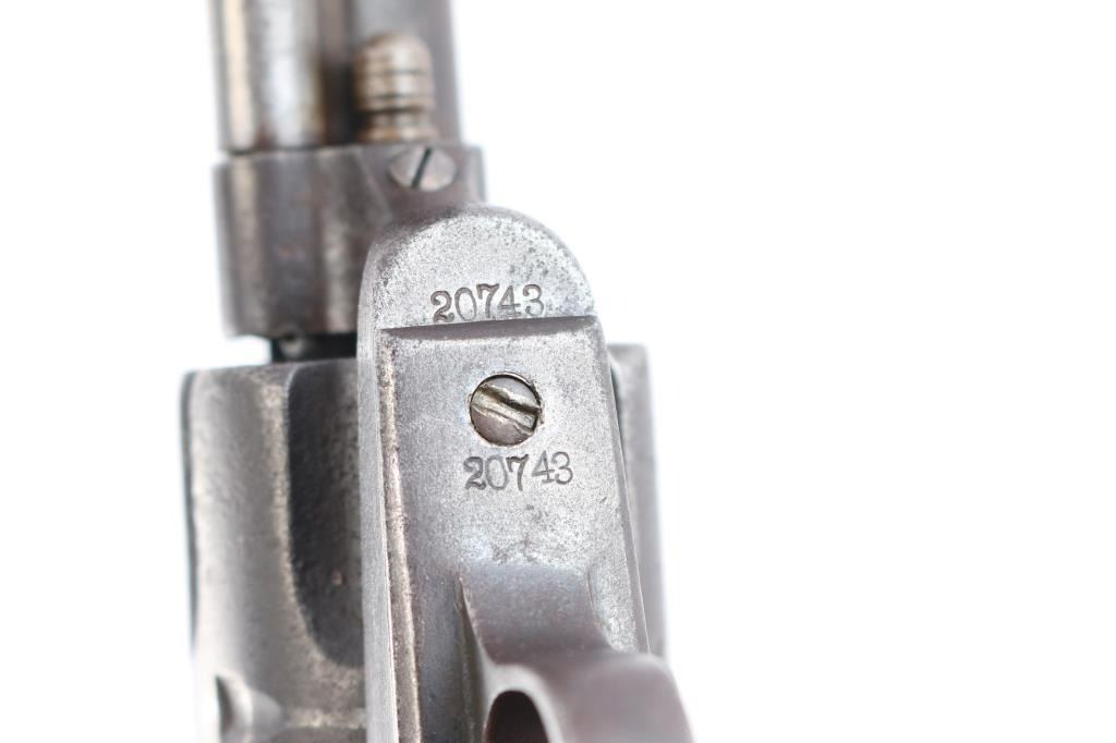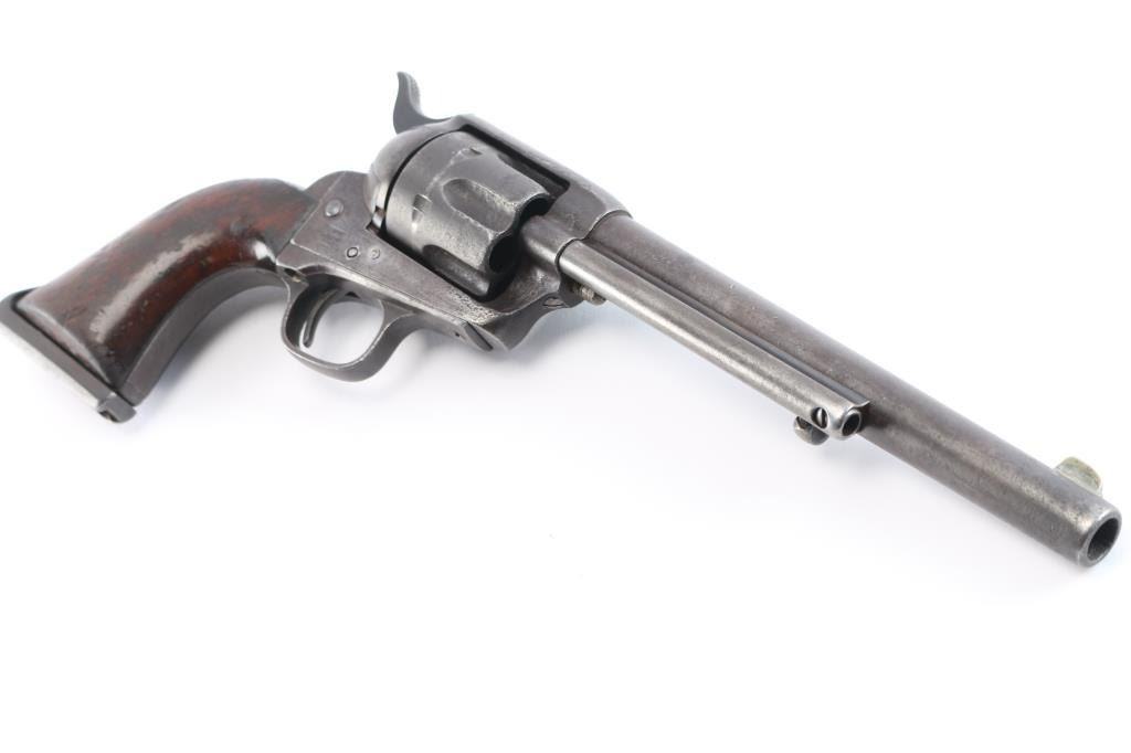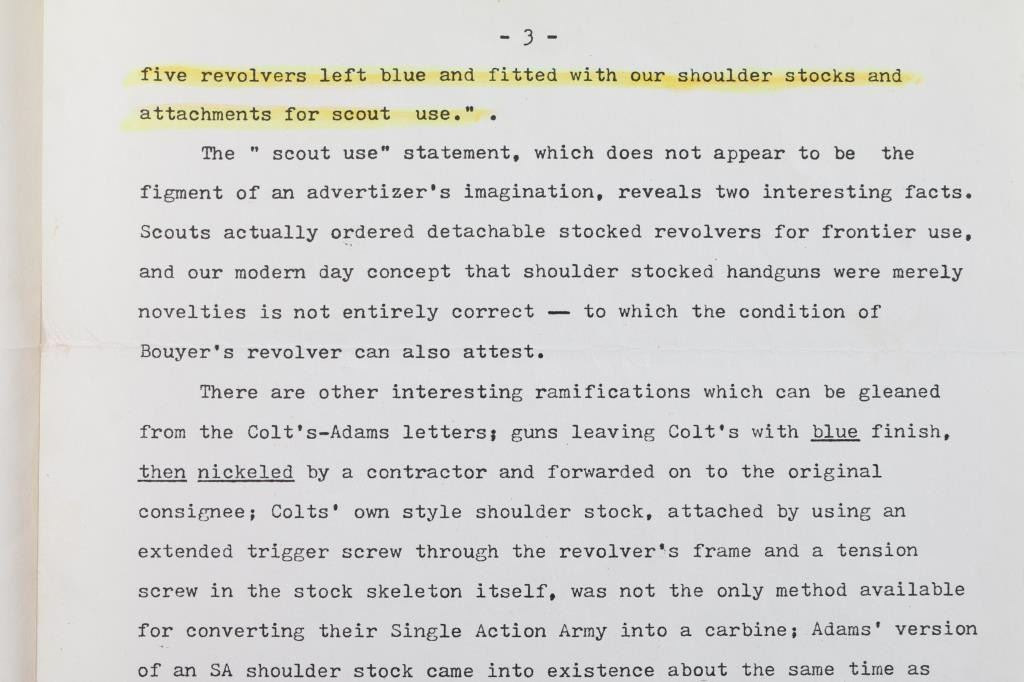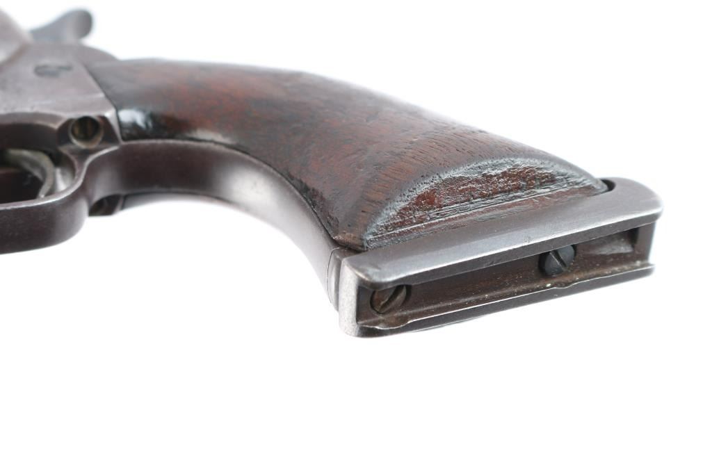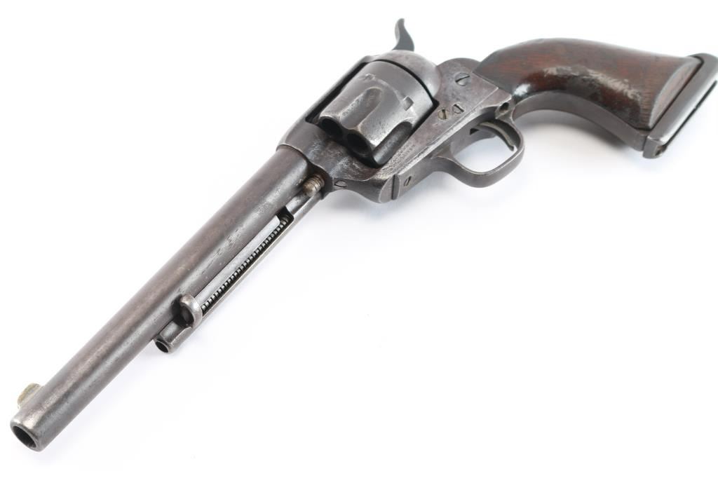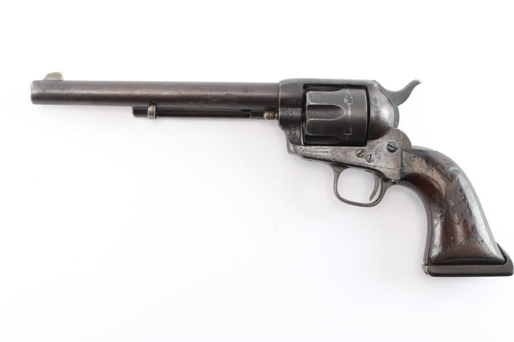 Colt S. A. Army Revolver Serial #20743, with period shoulder stock attachment screwed into butt and extensive research history and publication provenance as to ownership and use by "Mitch Bouyer", scout for Custer, killed at the Battle of Little Big Horn June 25, 1876. The subject revolver shows a dark brown patina finish with scattered rust and erosion and some pitting. Markings are legible and visible numbers matching. The grips show strong traces of varnish along with "weathering" from exposure to the elements. Hammer and small parts are all early except ejector rod head which is a slightly later Colt part. The bottom of the grips show Boyer's name and 7 CAV carved into wood. Provenance: Colt Cavalry, Artillery and Militia Revolvers by Keith Cochran where it is prominently featured; Colt Peacemaker Encyclopedia; "A Scout's Colt" by Ron Graham, ink signed by him detailing this Colt; Guns Magazine May 1979; Arms Gazette June 1979; Gun Report March 1980, The Collection of Mr. Knox Baldwin, Head of Tennessee National Guard and prominent Colt collector to several major Colt collectors in the Western U.S.A. Description by John R. Gangel aka "Little John".