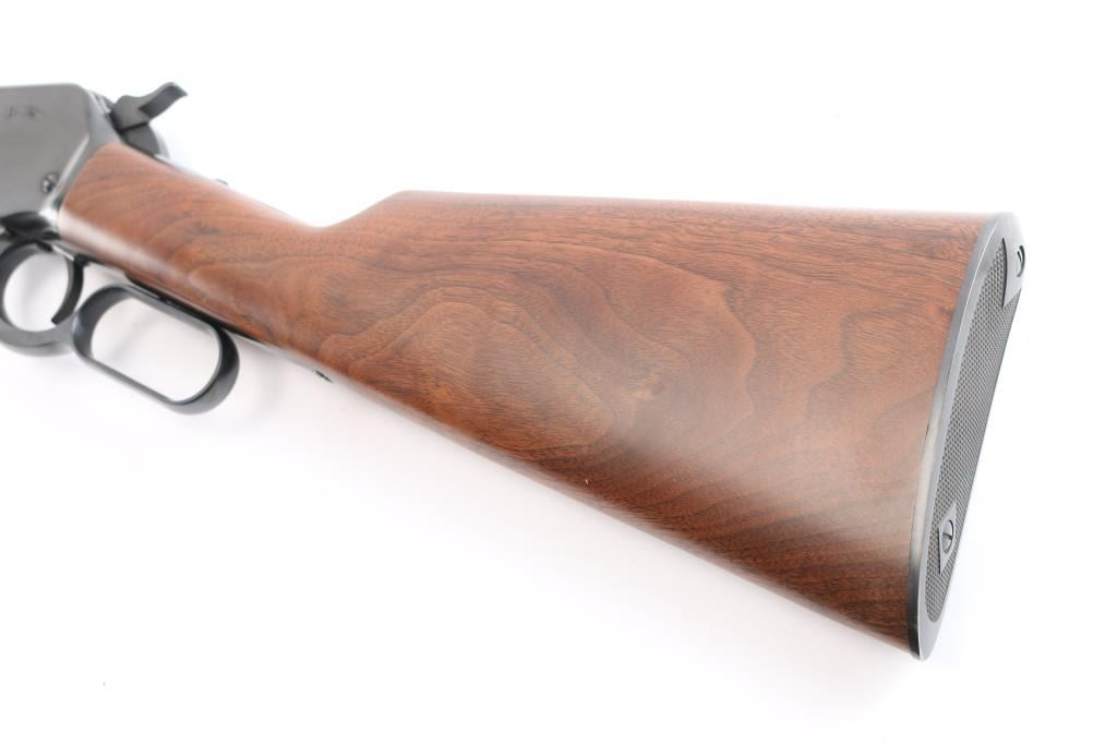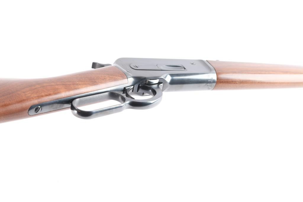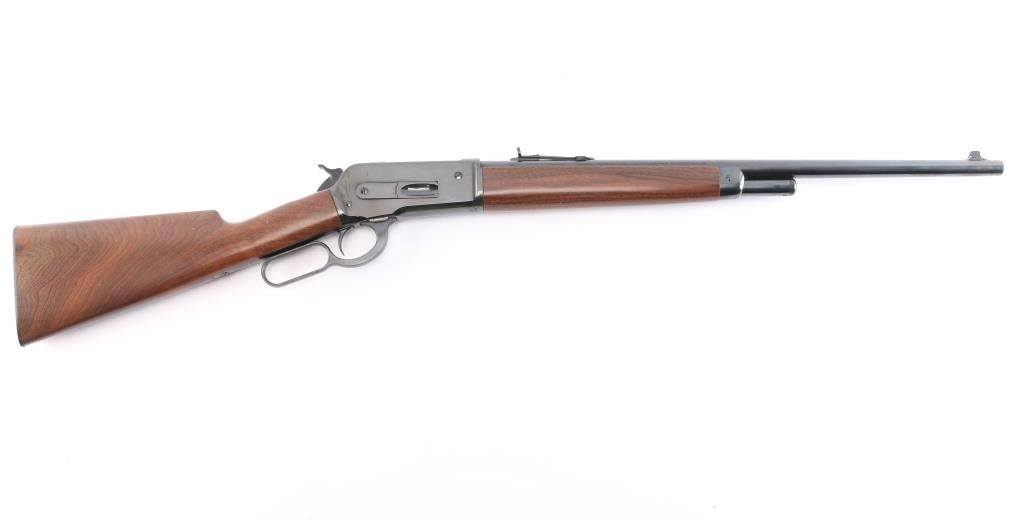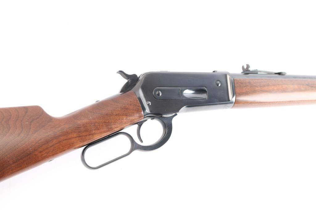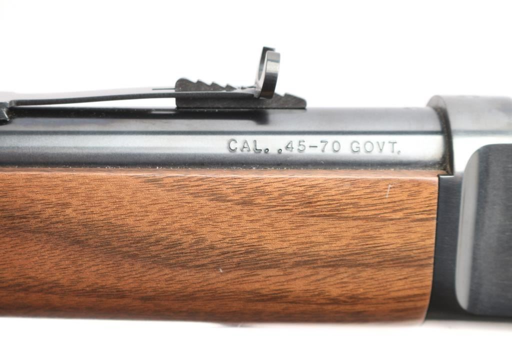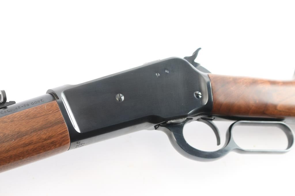 .45-70 Gov't. SN: 00ESLR1257. This Miroku (Japan) made lever action rifle is a Winchester Model 1886 Extra Light Rifle chambered in .45-70 Government. The left side of the barrel is marked "U.S. REPEATING ARMS CO. INC., NEW HAVEN, CT U.S.A. / JAPAN/MIROKU" and at the rear with "CAL. .45-70 GOVT.". The top-rear of the barrel is marked with the ovalled "WP" proof. The top of the chamber ring is also marked with the ovalled "WP" proof. The top tang is marked "WINCHESTER / MODEL 1886". The right side of the barrel is marked "WINCHESTER MODEL 1886 EXTRA LIGHT RIFLE. WINCHESTER LICENSEE". Blue finish 22" round barrel with dovetailed blade and semi-buckhorn rear sights. The stocks are a 2-piece smooth walnut with capped forend, straight grip, straight comb and checkered blued steel shotgun-style buttplate. sliding tang safety. The bore is excellent/bright, wood is excellent with a few very minor dings, action is smooth and the blue is about 98% with a couple of minor scratches on the right receiver.