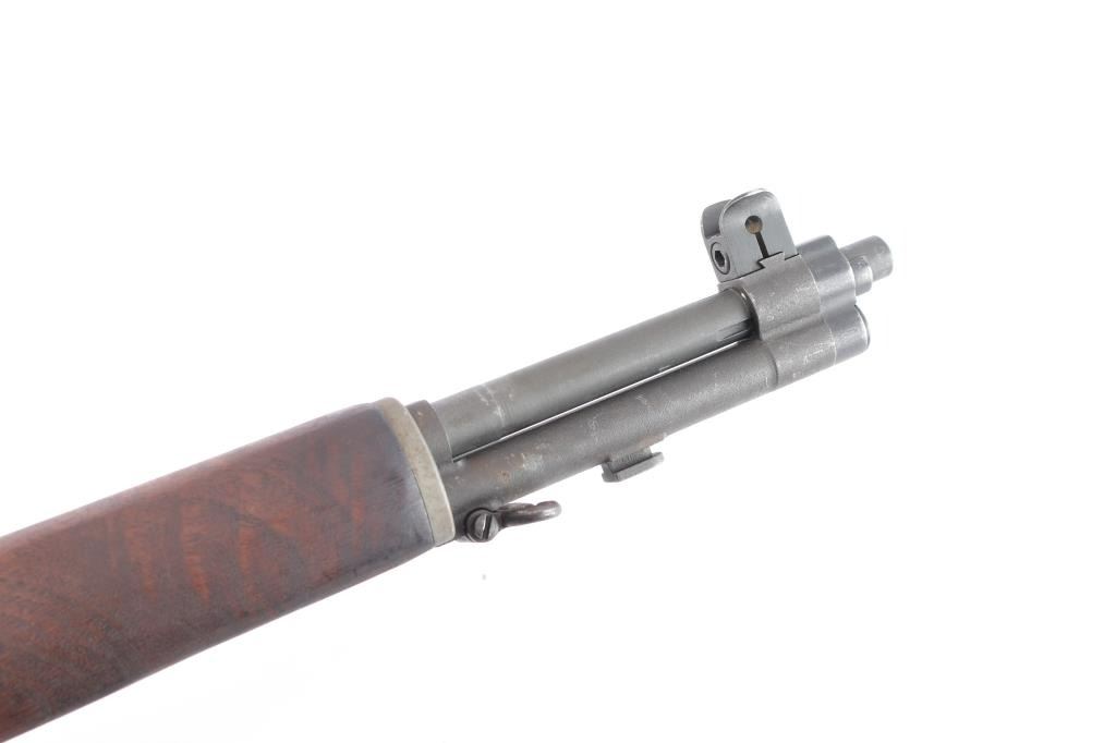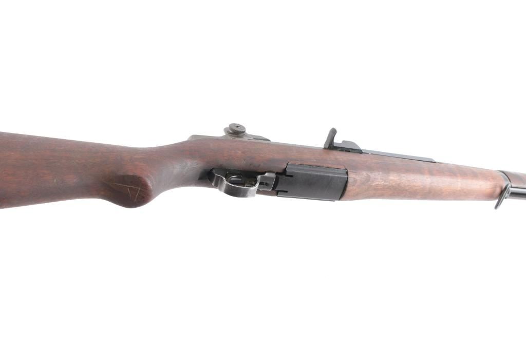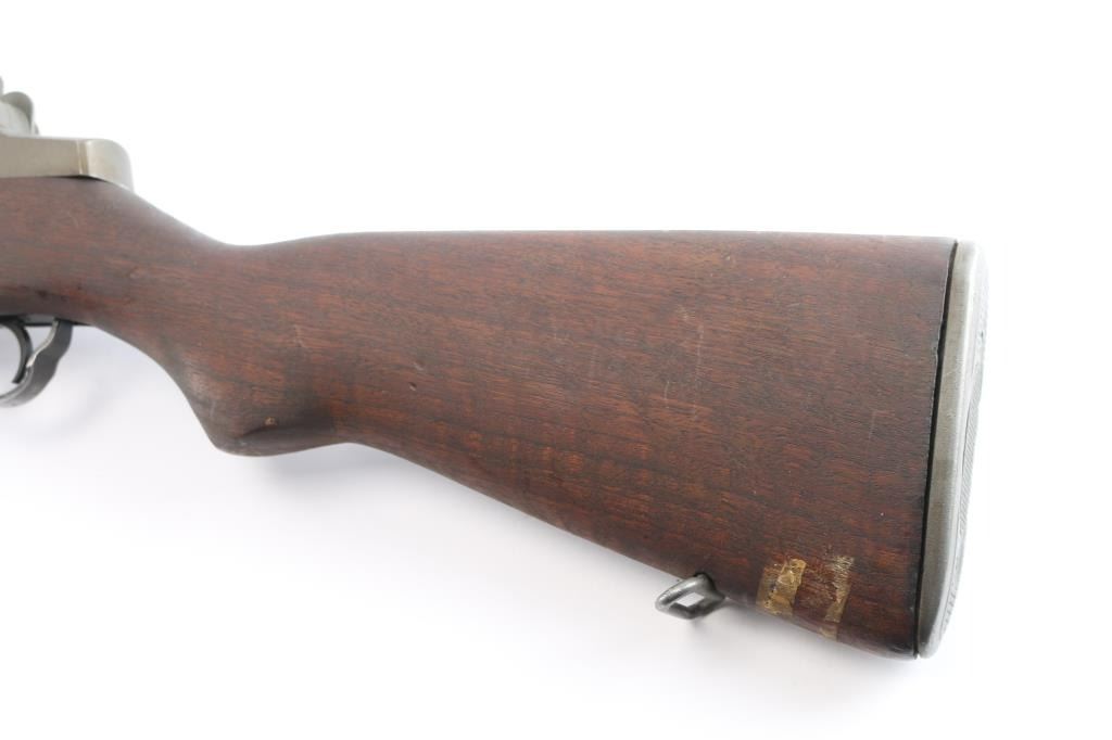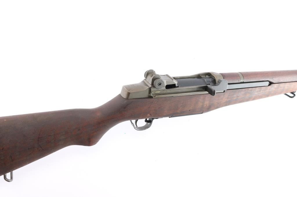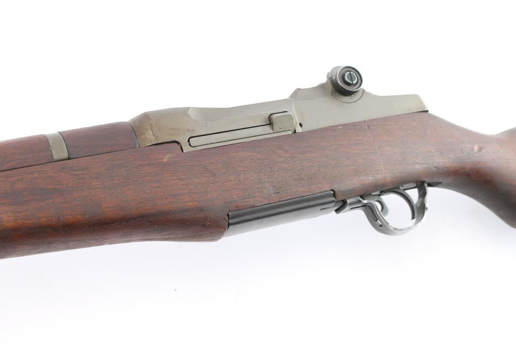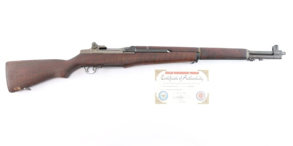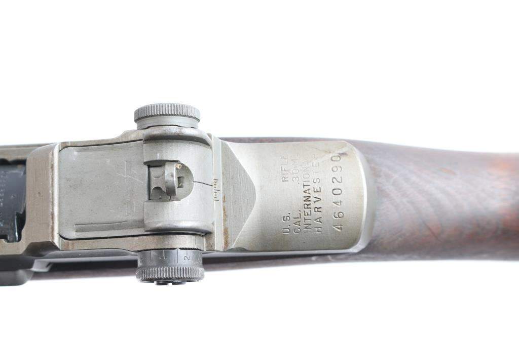 #4640290 US military semi-automatic rifle, manufactured circa 1953. The workhorse rifle of the US military in WWII and beyond, this example made during the Korean War. Features parkerized finish, walnut stock & hand guards, 24" barrel, adjustable sights with protected front blade & protected rear peep, fixed magazine for en-bloc clip, manual safety. Trigger guard has the later stamped style guard. Barrel marked "LMR D6535448 6 53 A15". Bolt marked "IHC". Rear sight marked "IHC DRC". "IHC" observed on hammer, trigger housing. Bore is shiny/bright. Various metal parts show different colors of parkerized finish, almost black on bolt and op rod, receiver shows greenish lighter gray color, 95% coverage of arsenal refinish. Markings on receiver show some erosion/losses. The wood is very good with typical handling marks, scratches and gouges, "P" on bottom of wrist. Includes a CMP COA for the receiver.