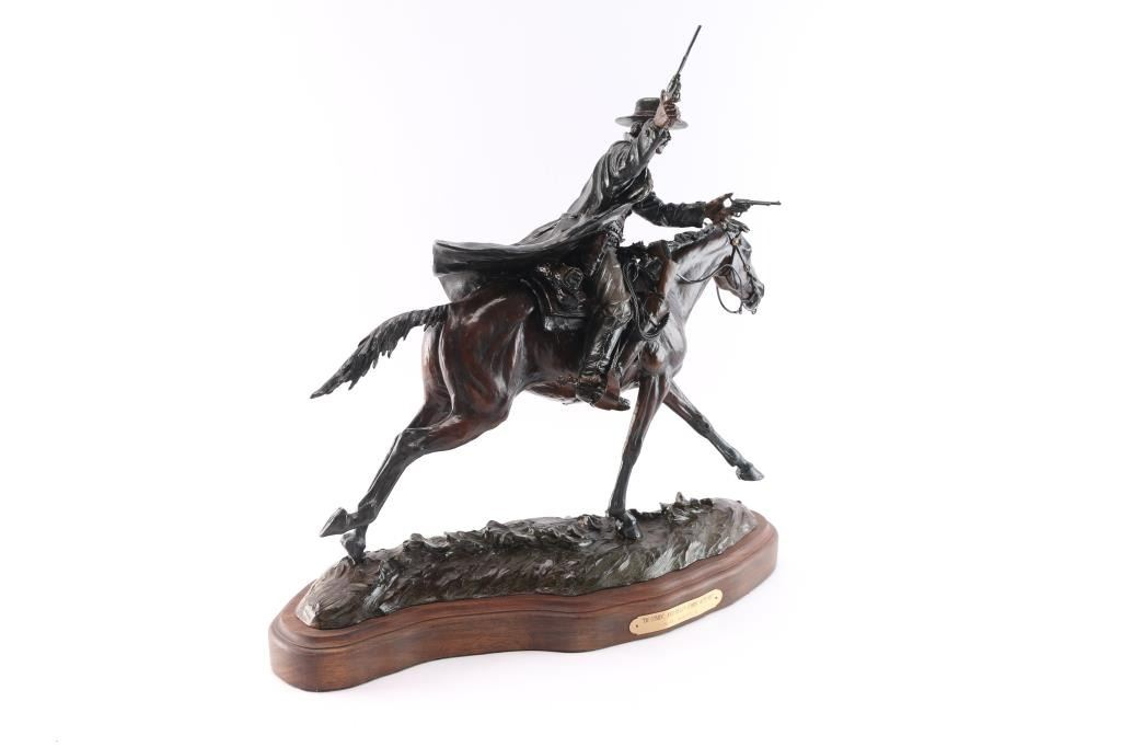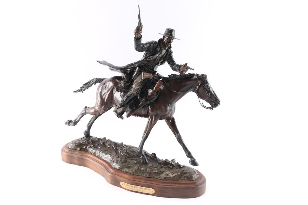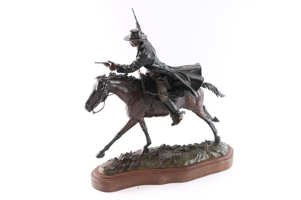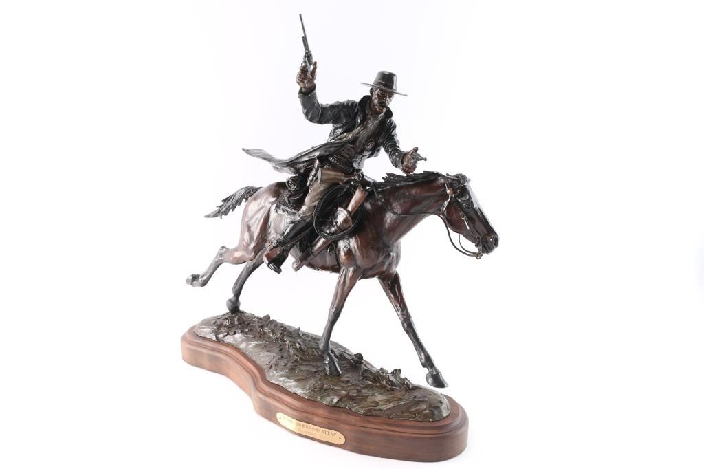 Titled "I'm Comin'... And Hell's Comin' With Me." Colored bronze that is signed and numbered n bronze 17/25.The rarest piece from the Tombstone series. Gorgeous sculpture by legendary native Arizonan sculptor Bill Nebeker. His work is in the collections of the Eiteljorg Museum, National Cowboy and Western Heritage Museum, Old West Museum in Cheyenne, Booth Western Art Museum, Museum of Western Art in Kerrville, Phoenix Art Museum, Phippen Museum in Prescott, Palm Spring Desert Museum and Desert Caballeros Museum in Wickenburg as well as many of the prestigious corporate and personal collections around America. Measures 21" x 21" x 8".