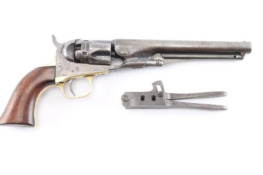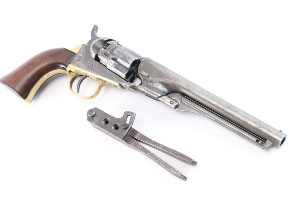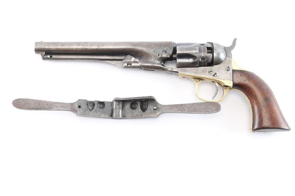 Antique Colt "Police" revolver manufactured 1867. Blue finish with case hardened frame, 6.5' round barrel, brass bead sight, half fluted cylinder, brass triggerguard and backstrap, one line New Address on barrel, 'Colts Patent" on left frame and 'N' on left triggerguard, patent date is not visable. Serial numbers matched on barrel, frame, triggerguard, backstrap and wedge. Markings are clear, readable. Action is smooth with tight lock up, half cock works well. Bore is very good with strong rifling with some minor rust spots. Grips are very good. Revolver retains about 20% of its original blue in protected area and on the underside of the barrel. Includes an Original Colt’s Patent Civil War Era .36 Cal. Double Cavity Bullet for ball and bullet. The "Colt's Patent" on the upper cutter is well worn, partially readable. Pitted but functional.