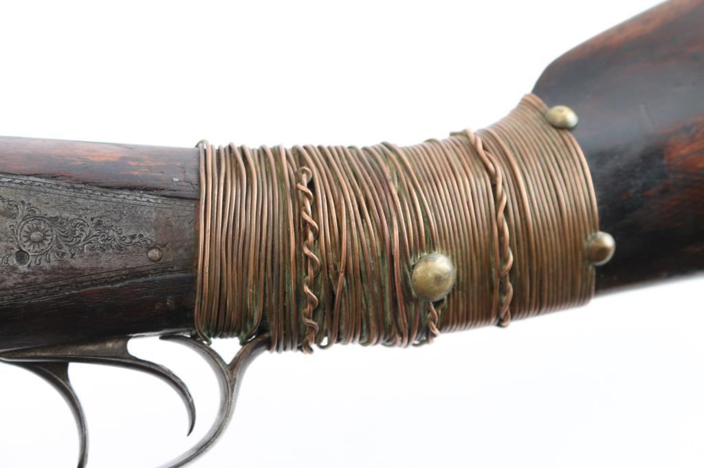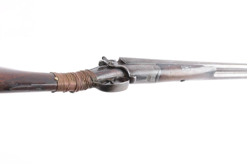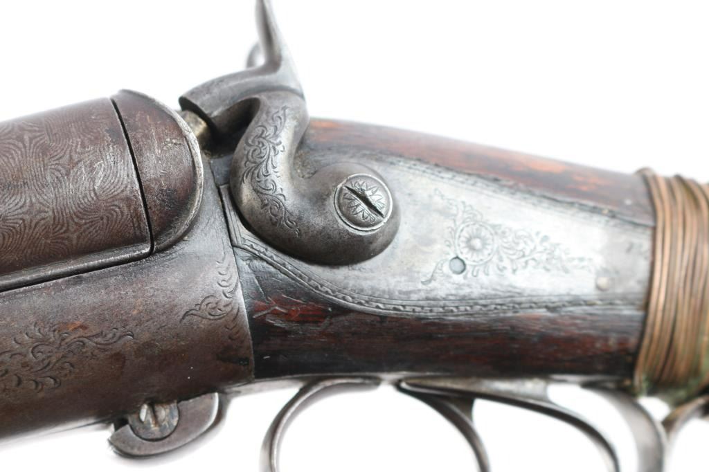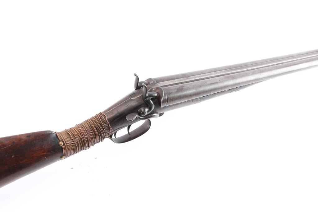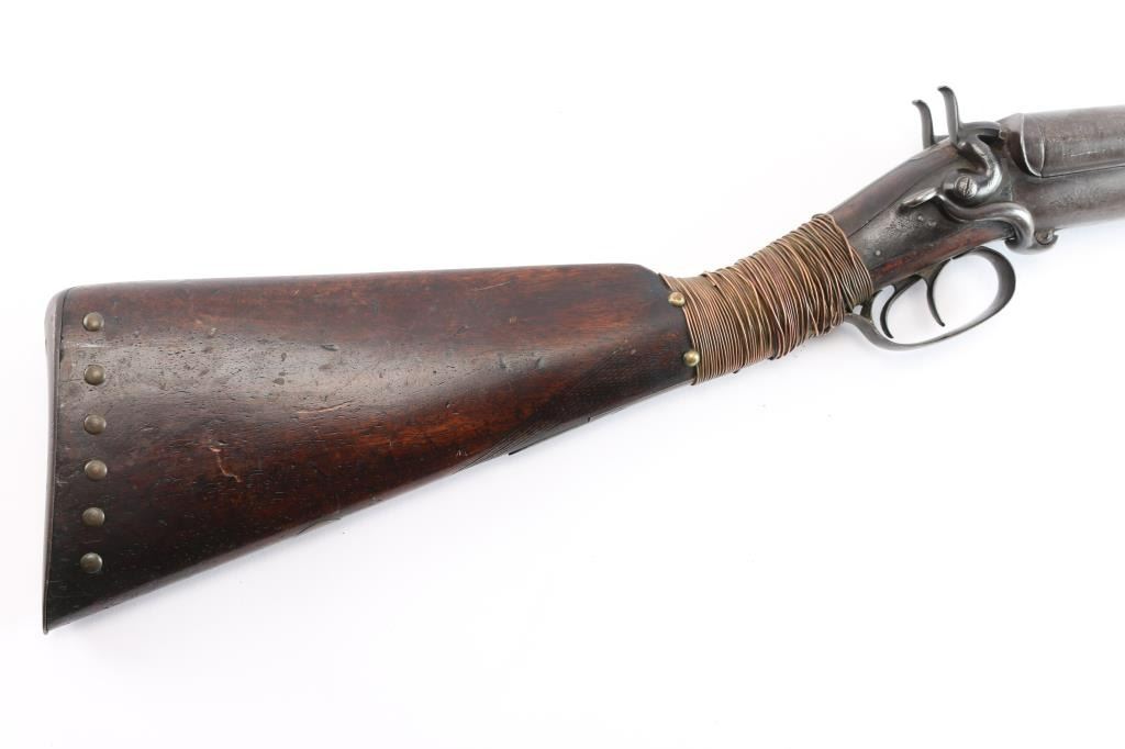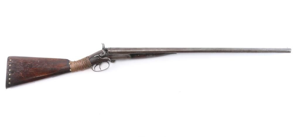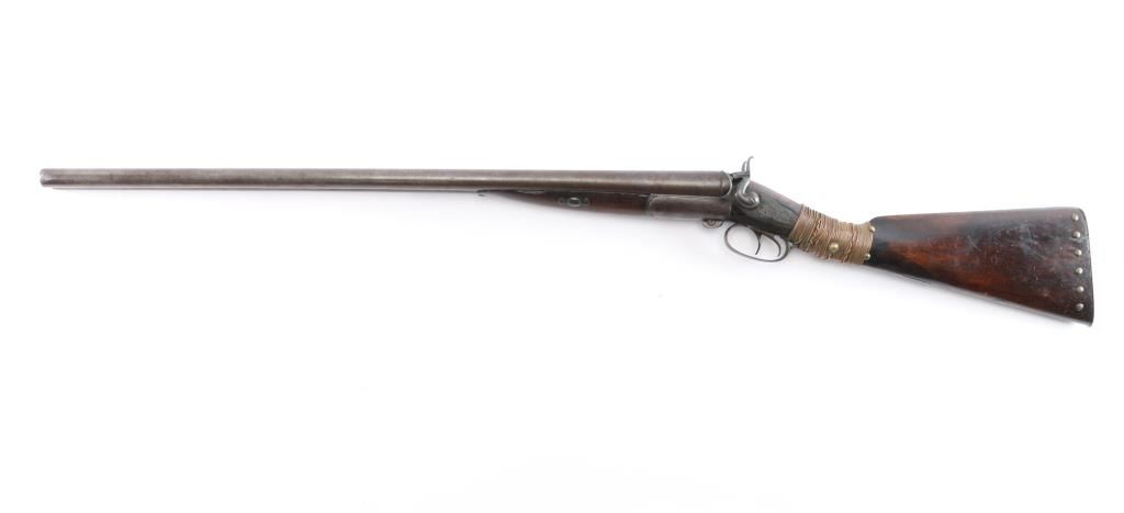 NVSN American Native Indian wire-wrapped and tacked double bbl exposed hammer shotgun marked London Fine Damascus on the bbl and maker marked on lock is covered by copper wire wrapping (last 3 letters __ ELL). An illegible marking is engraved on small plate in stock's belly. The gun is 12 ga measuring 42 1/2" overall with bbls neatly shortened to 27" from 28" to 30" originally. The copper wire wrapping probably obtained from telegraph wires and tacks from upholstery. In our expert opinion (J.R. Gangel), tacks are 100 percent,as is the wire wrap, genuine to period of use. The condition is fair to poor with bbls dented, one firing pin replaced and not allowing gun to open as stuck forward after firing. Locks up well and action crisp. Stocks worn with many imperfections. Provenance: Richard Sweet Collection who actively sought western artifacts for 50 years and who's family in New Mexico were among earliest arms and bowie knife collectors. This is an excellent wall hanger and shotguns were favored by many frontiersmen for bush fighting, loading them with buckshot and ball. General Crooks carried two English doubles on the hunt for Geronimo.