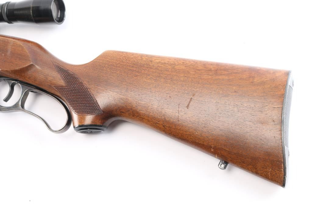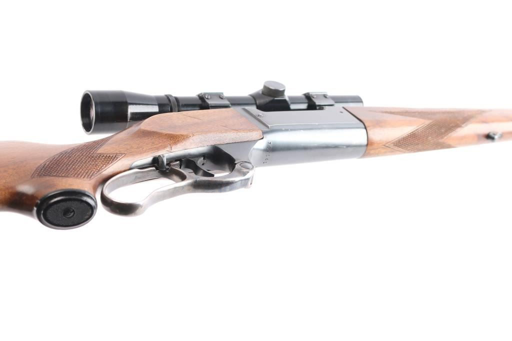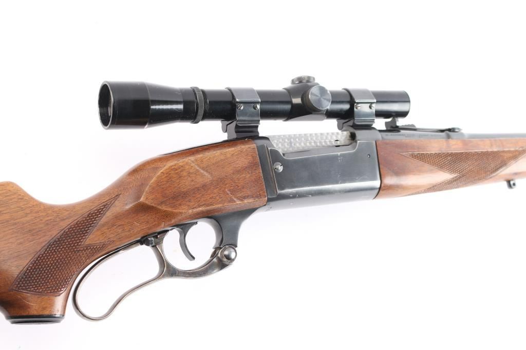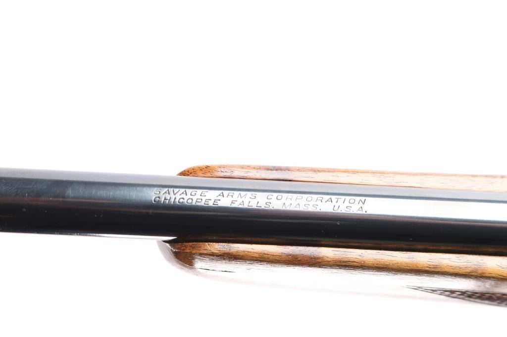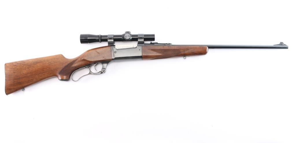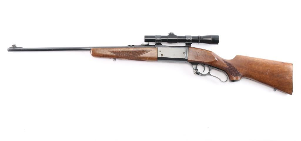 Vintage lever action repeating rifle chambered in .300 Savage, manufactured circa 1955. "F" for "Featherweight," indicating a lighter model with a thinner barrel. Features a blued finish, 22" tapered barrel, ramped blade front sight with bead top, elevation adjustable semi-buckhorn rear sporting sight, installed vintage Lyman All-American 2 1/2 scope, post reticle, clear optics, internal rotary magazine with brass spool/round counter, jeweled bolt, cocked indicator on the upper tang, serrated trigger, case hardened curved finger lever, sliding safety on the lower tang, swivel studs, checkered walnut forend and pistol grip shoulder stock with plastic grip cap & serrated metal buttplate. Rifle exhibits approximately 90% of it's original blued finish showing showing a few scattered handling marks, minor scratches and some edge wear, case colors about 50%. Action is smooth, the bore is excellent and the wood stocks are overall very good with minor scratches/dings.
