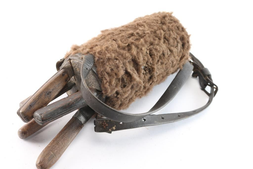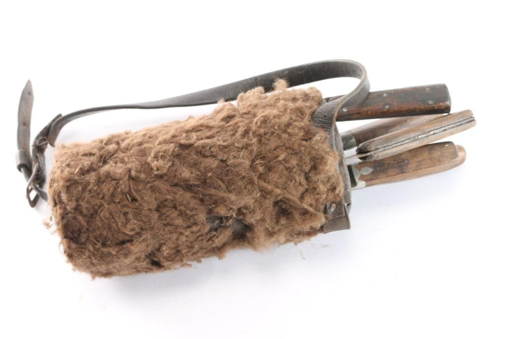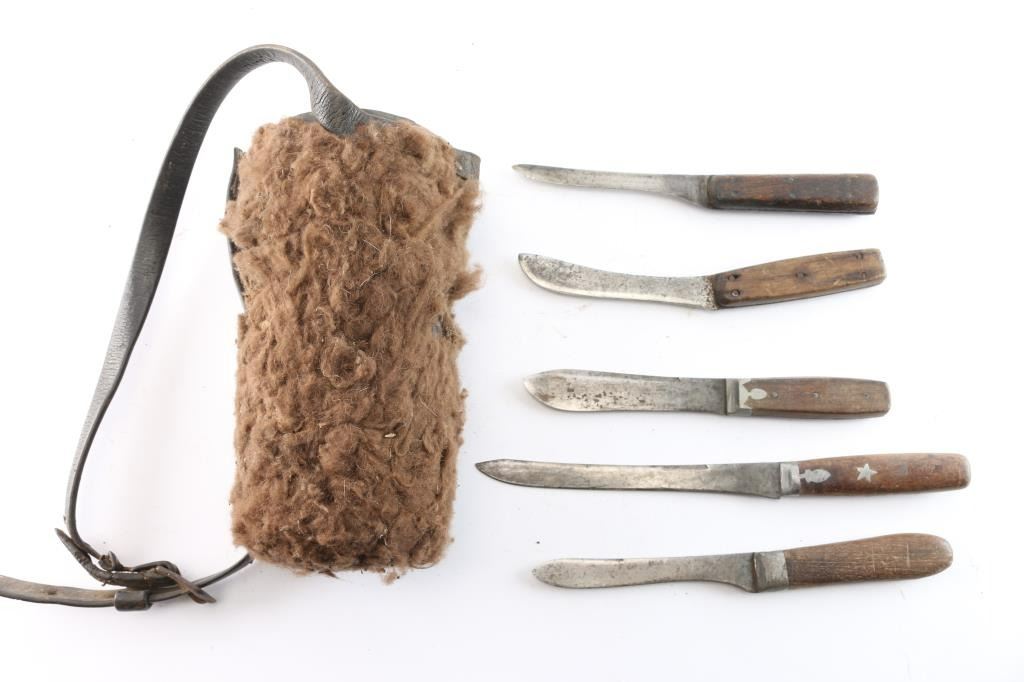 With a buffalo hide covering and leather strap along with 5 knives of which 3 are pewter inlaid. Knives are sharpened and worn with no markings remaining but are Russell Green River type or imports from Sheffeld. Case and knife block measure 9 1/2". Case and straps are good. Jim Wells "Buffalo Hunt" Collection.
