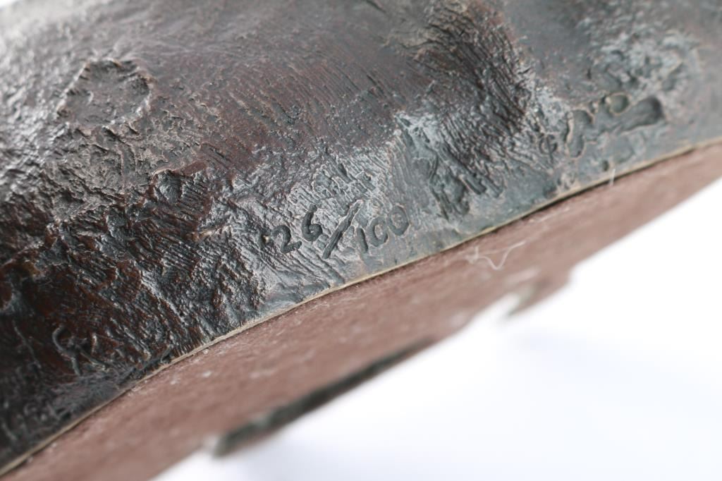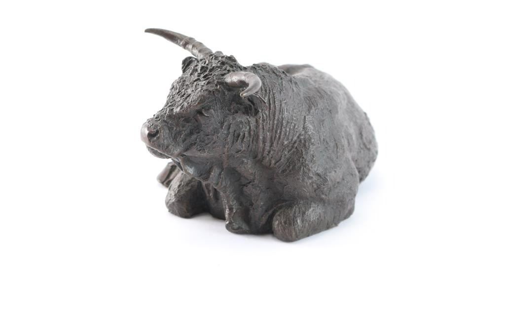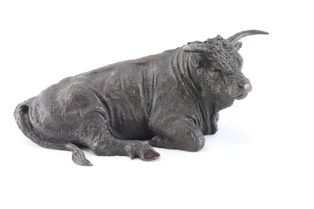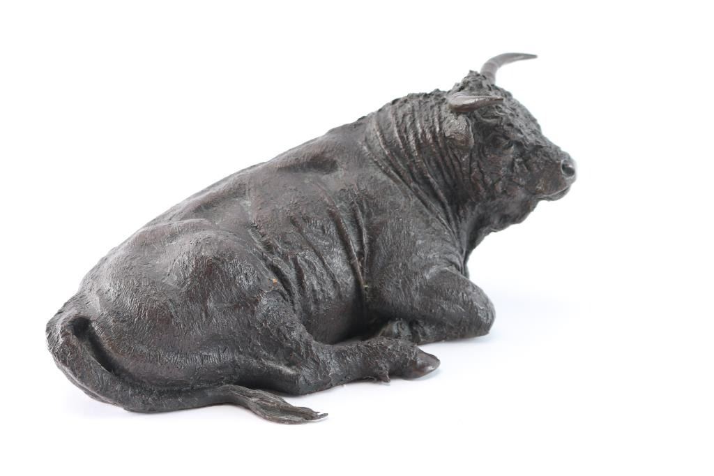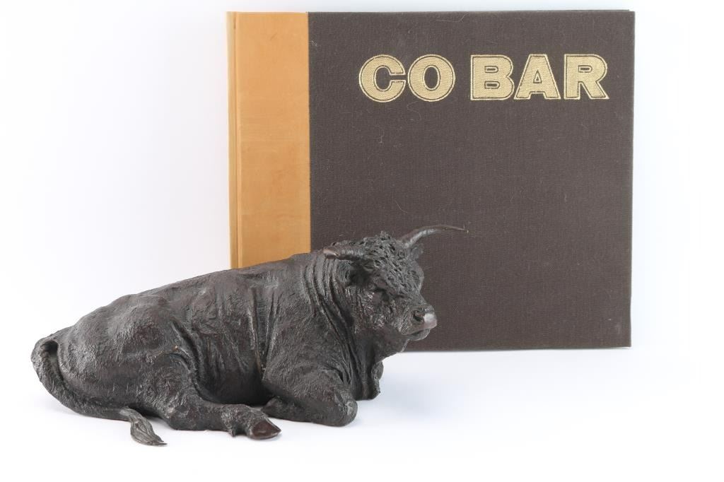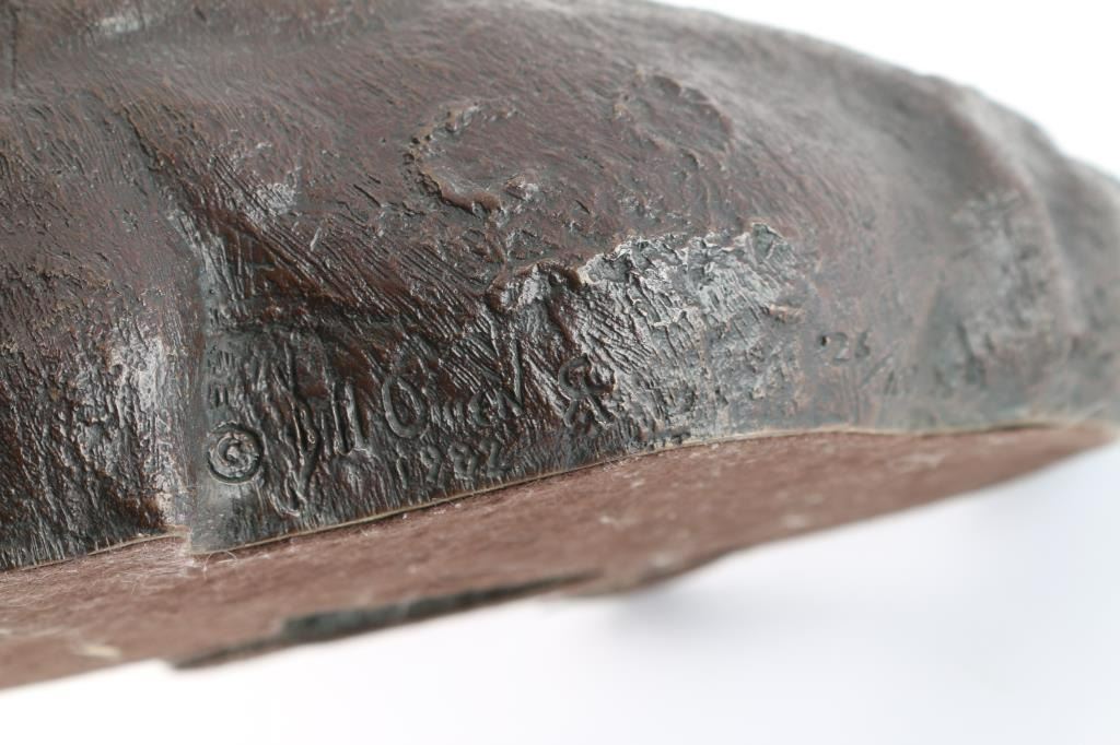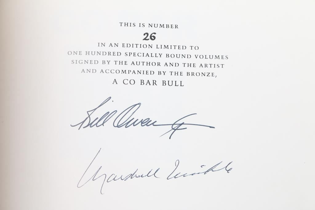 By artist Bill Owen (1942-2013), 1992, numbered 26/100. Signed on backside. Dimensions: 5”h x 12”w x 7”d. Bull is branded with "C O" and included in this lot is a coffee table book entitled "CO BAR, Bill Owen Depicts the Historic Babbitt Ranch." Bill Owen was born and raised in Arizona, his mother an artist and his father a cowboy. He became a legendary member of the Cowboy Artists of America in 1973 and served as its President three times and earned numerous medals and awards. While practicing for a rodeo in 1989, Bill survived a freak accident which resulted in the loss of sight in his right eye. It affected his depth perception and forced him to relinquish sculpting. He didn’t allow himself to consider the loss a handicap, but greatly missed the medium for thirteen years. His grit and tenacity paid off, and he was able to successfully resume his craft in 2002. For all of Bill’s artistic achievements, he was most proud of The Arizona Cowpuncher’s Scholarship Organization he founded in 1995 which provided educational scholarships for individuals from Arizona’s ranching communities.