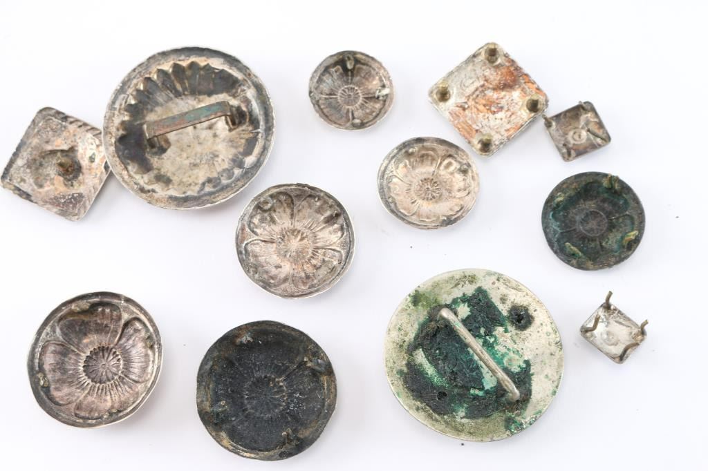 One large Rosette is maker marked Edward Bohlin, has dent on front. Both large rosettes are marked sterling silver. Various sizes and shapes.